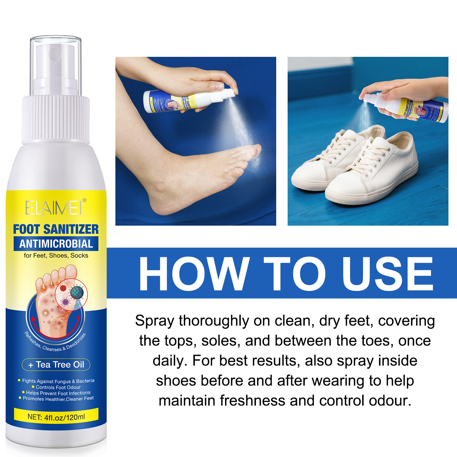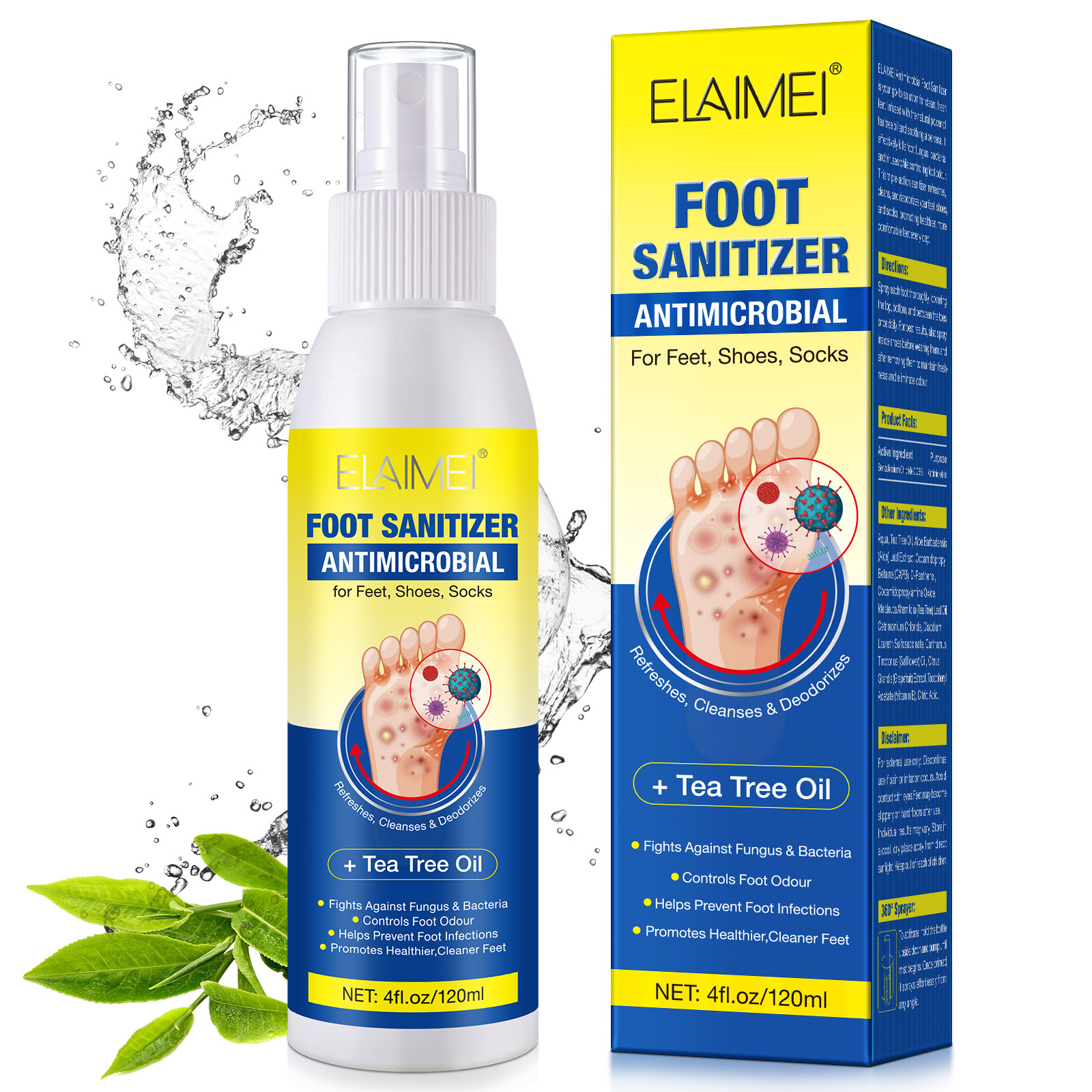 ELAIMEI Дезинфицирующий спрей для ног с маслом чайного дерева 120 мл
