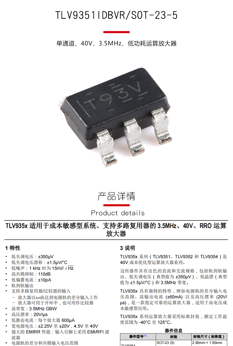 Оригинальный TLV9351IDBVR SOT-23-5 одноканальный 40V 3.5MHz Операционный усилитель с низким энергопотреблением
