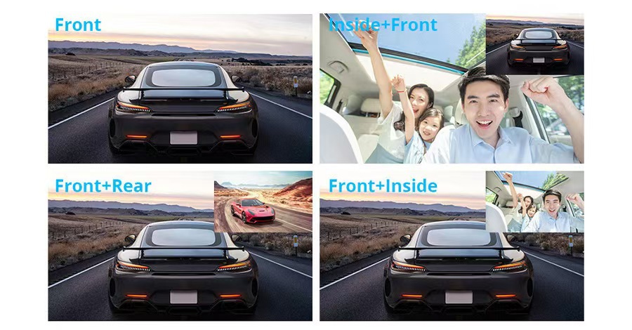 Перед автомобилем; Три кадра спереди, внутри и сзади автомобиля; Версия WIFI внутри автомобиля; Версия WIFI перед автомобилем, внутри автомобиля и позади автомобиля; карта памяти 32 ГБ