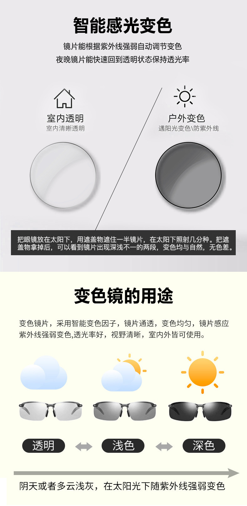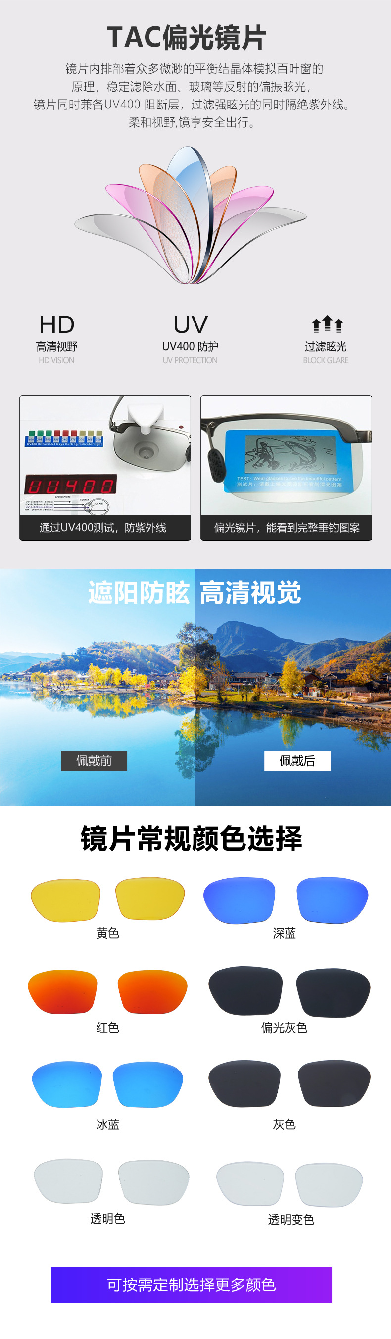 От прозрачного до серого; Поляризованный коричневый; Поляризованное ночное видение желтого цвета; Поляризованный ледяной синий; Поляризованный темно-синий; Поляризованный светло-серый или серый цвет; Поляризованный ослепительный красный; Поляризованный серый; Прозрачный анти-синий свет; Прозрачный анти-синий свет становится серым; Поляризованное ночное видение от желтого до коричневого цвета.; Прозрачный цвет