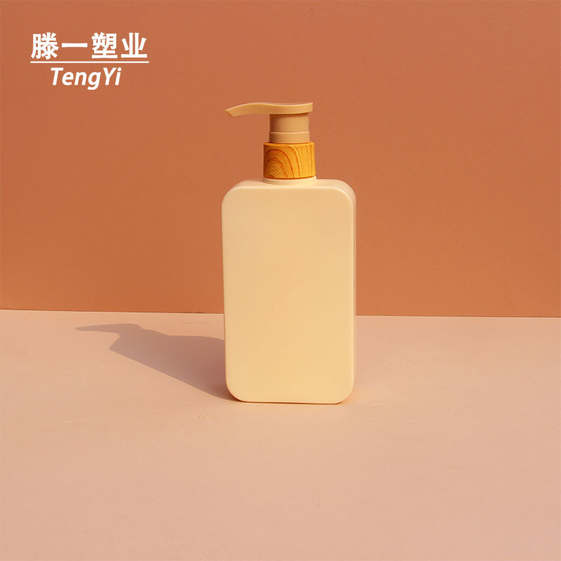 Завод-изготовитель бутылок для шампуня из ПЭ пластика, 400 мл, бежевого цвета, плоской формы, с дозатором-помпой из дерева с 28 зубцами.