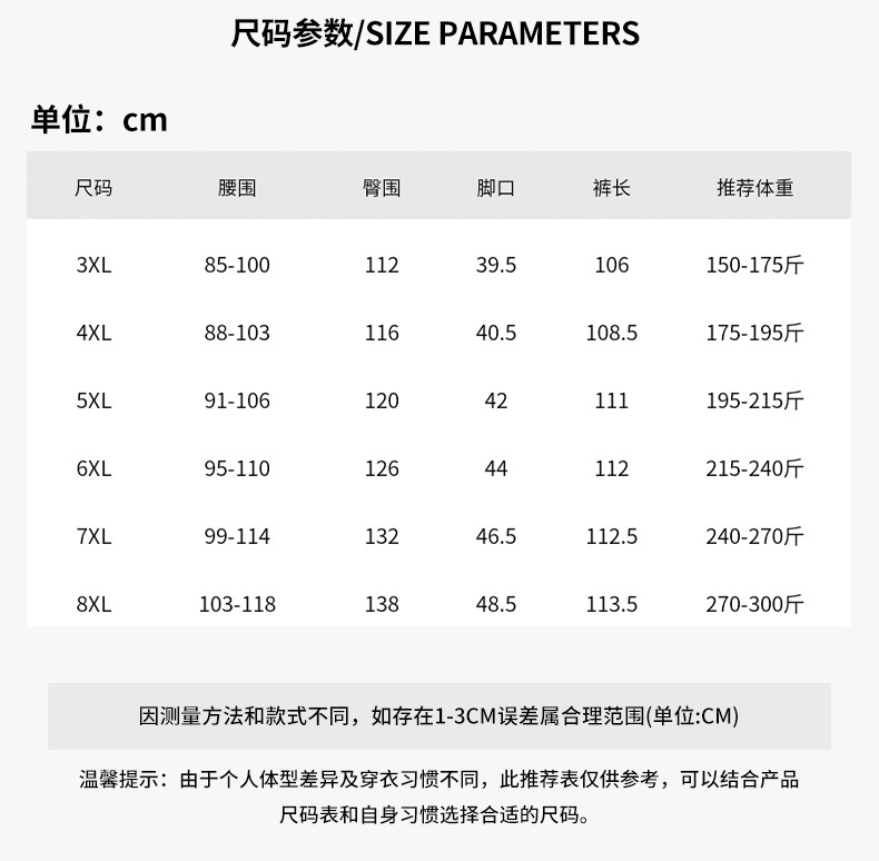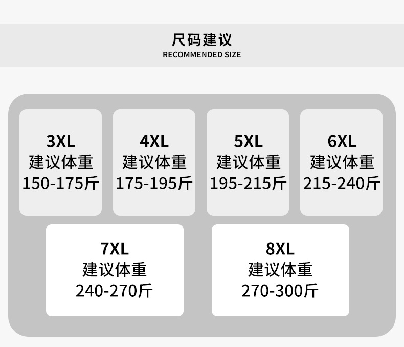 3XL < 87.5kg; 4XL < 97.5kg; 5XL < 107.5kg; 6XL < 120kg; 7XL < 135kg; 8XL < 150kg