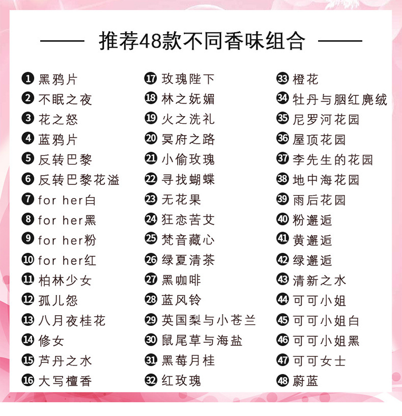 черный опиум; Переворот Парижа; Берлинская девушка; Злоба сироты; Османтус «Августовская ночь»; монахиня; Вода Людана; столичный сандал; роза величия; Очарование леса; Крещение огня; Дорога к Аиду; воровская роза; Безумная любовь к абсенту; Зеленый летний чай; черный кофе; синий колокольчик; Английская груша Фрезия; Шалфей и морская соль; Черника Лавр; красная роза; апельсиновый цвет; Нильский сад; сад на крыше; Сад г-на Ли; средиземноморский сад; Сад после дождя; Розовая встреча; желтое свидание; зеленая встреча; Мисс Коко; г-жа Коко; синий; роза в нейтральной зоне; вода свободы; Цветок, любимый; настоящий я; агаровое дерево из черного дерева; потерянная вишня; Автономный; любимый; оберег; Аромат чая нефритового дракона; Ленивые выходные; розовый бриллиант; красное яд; цветение; земля; шарф; ветивер; бергамот; черный чай; Разный; сандаловое дерево; Свинка Бун