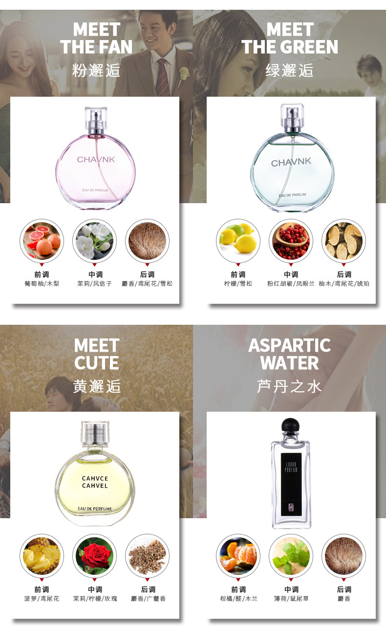 Кёльн; Пачули; ветивер; аромат лимона; цитрусовый вкус; Аромат орхидеи; гвоздика; Вкус инжира; Вкус гардении; запах сосны; аромат бергамота; Мулан; аромат герани; тон дерева; Аромат древесины кипариса; Вкус туберозы; Вкус фрезии; Аромат эбена; Аромат мирта