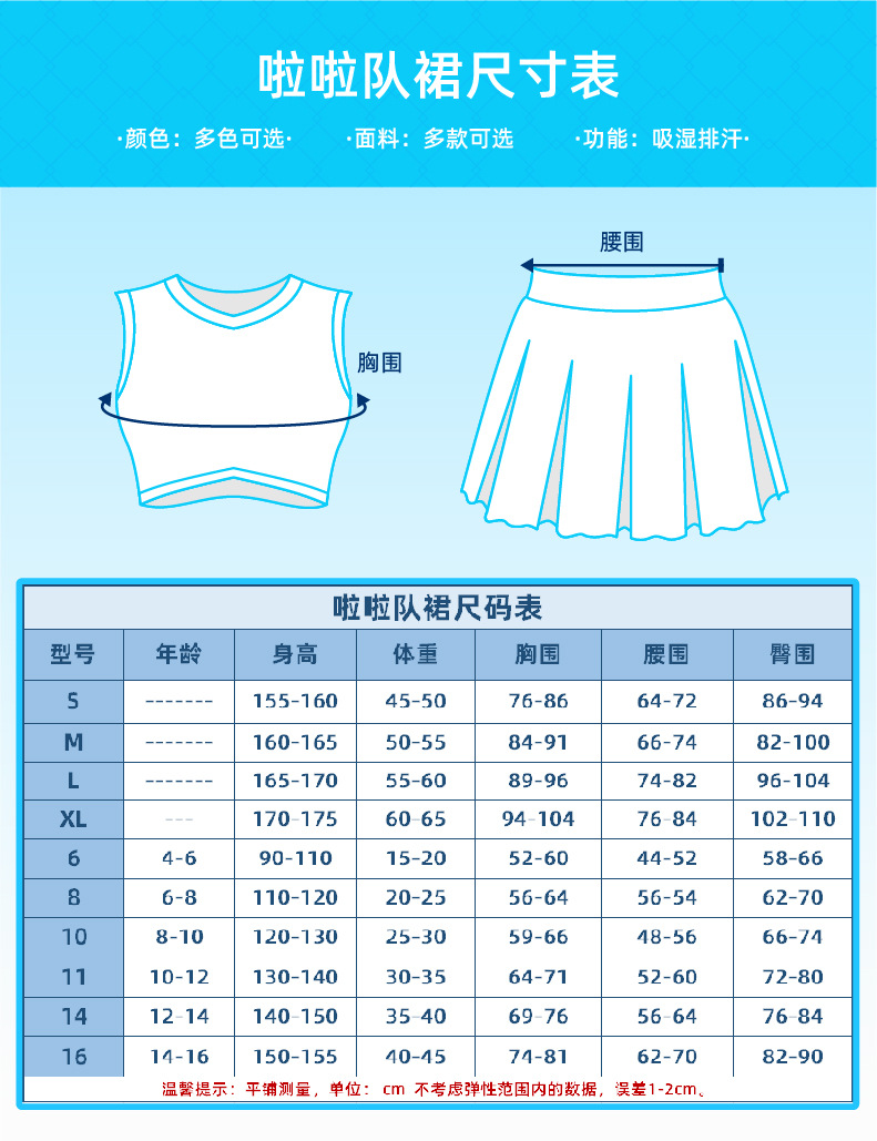| 啦啦队裙尺码表 | ||||||