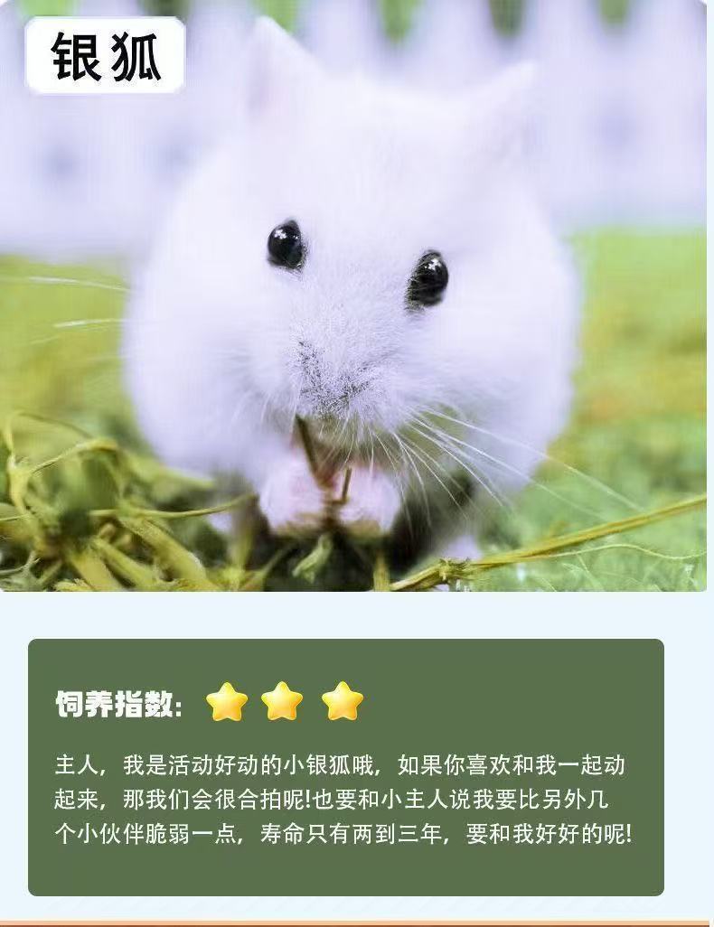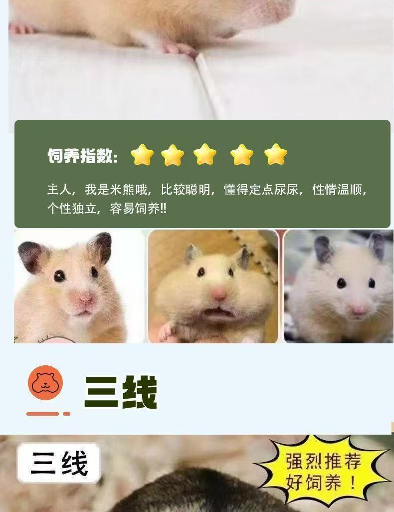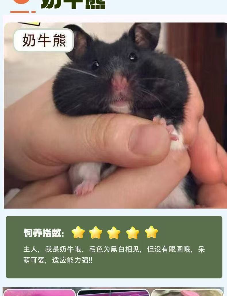 Цзыкан (домашний и выращенный); Третья линия (родом и живущая); Silver Fox (популярная модель, пользующаяся спросом); Пудинг (домашний); Сегодня у нас два случайных хомячка (сделанных своими руками); Три линии + фиолетовый склад (доморощенный и живой); Пудинг + Саньсянь (доморощенный и живой); Пудинг + Цзыцанг (доморощенный и живой); Серебряная лиса + Третья линия (домашнее хозяйство и средства существования); Silver Fox + Purple Cang (домашний и выращенный); Чай с молоком [домашний]; Пудинг + Серебряная Лиса (отечественная упаковка); Золотой медведь【Домашний и живой】; Ми Сионг【Внутренний пакет】; Медведь с тигровой полоской [домашний и выращенный]; Корова-медведь [Домашние животные и скот]; Медведь с кругом на глазах [домашний и дикий]; Золотой медведь + полосатый медведь-тигр [домашний и живой]; Золотой медведь + коровий медведь [домашний и живой]; Золотой медведь + Рисовый медведь [Домашний и живой]; Золотой медведь + круги под глазами [Домашняя жизнь]; Рисовый медведь + медведь с рисунком тигра [домашний и живой]; Рисовый медведь + коровий медведь [домашний и живой]; Рисовый медведь + Медведь с кругом глаз [Домашняя жизнь]; Медведь с тигровой полоской + медведь с кольцами на глазах [домашний и выращенный]; Медведь с тигровой полоской + коровий медведь [домашний]; Корова-медведь + круги под глазами [домашний]