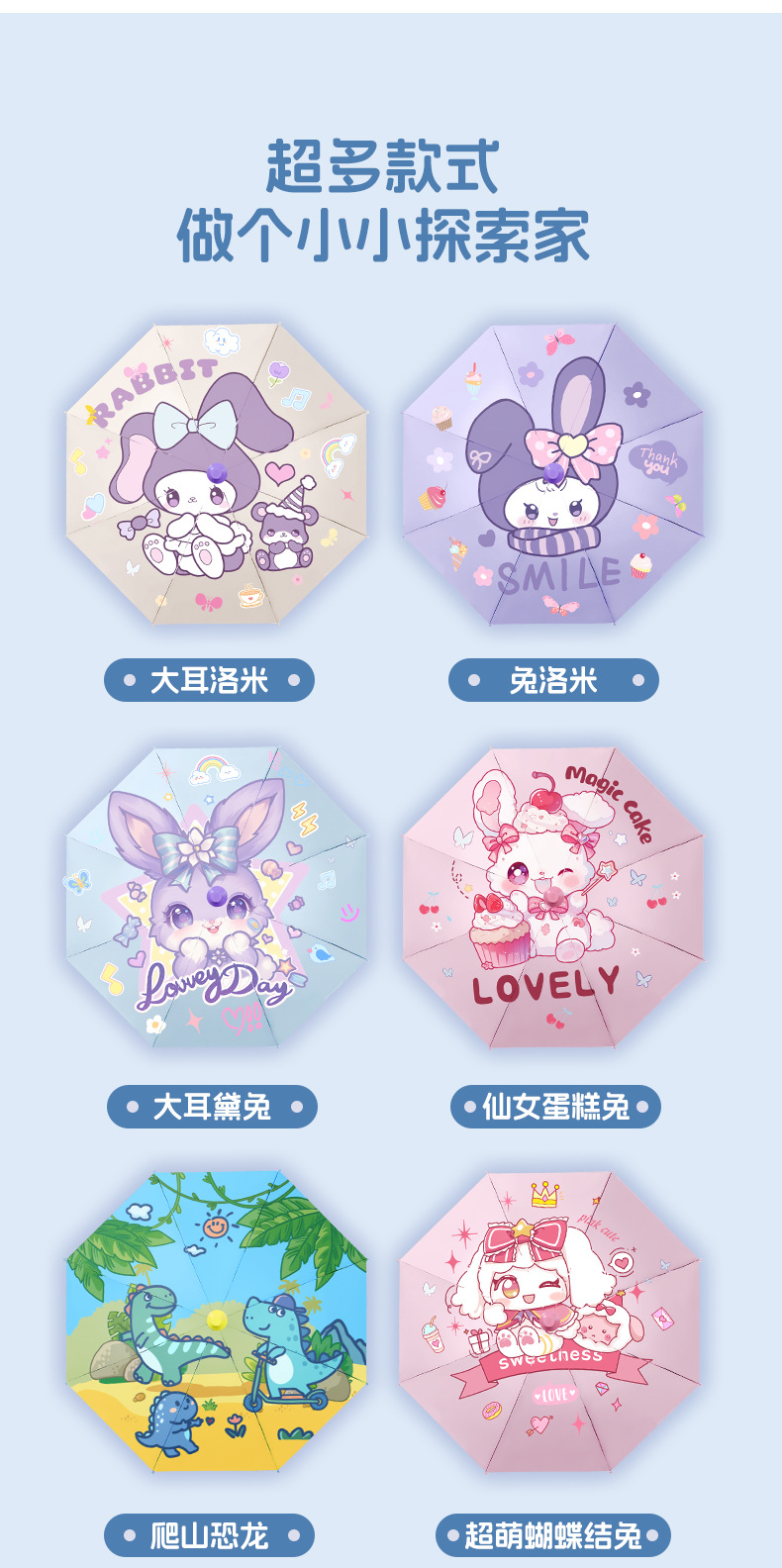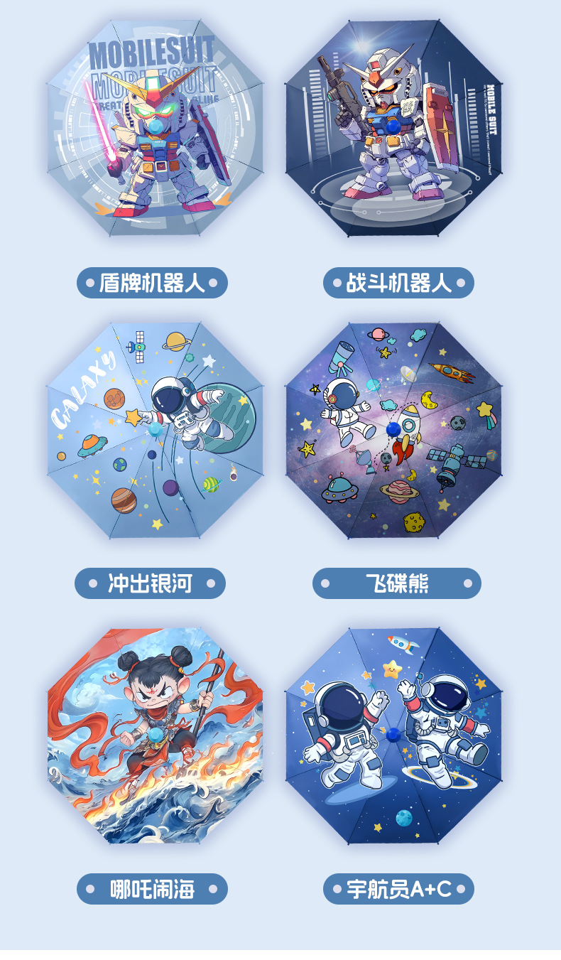 Astronaut A+C — виниловый зонт (поставляется с водонепроницаемым чехлом); Nezha Haohai — виниловый зонт (поставляется с водонепроницаемым чехлом); Большой ушастый кролик — виниловый зонт (поставляется с водонепроницаемым чехлом); Fairy Cake Rabbit — виниловый зонт (поставляется с водонепроницаемым чехлом); Flying Saucer Bear — виниловый зонт (поставляется с водонепроницаемым чехлом); Out of the Galaxy — виниловый зонт (поставляется с водонепроницаемым чехлом); Большухой Ломи — виниловый зонт (в комплекте водонепроницаемый чехол); Tu Luomi — виниловый зонт (поставляется с водонепроницаемым чехлом); Battle Robot — виниловый зонт (поставляется с водонепроницаемым чехлом); Shield Robot — виниловый зонт (поставляется с водонепроницаемым чехлом); Динозавр, восходящий на гору — виниловый зонт (поставляется с водонепроницаемым чехлом); Очень милый кролик с галстуком-бабочкой — виниловый зонтик (в комплекте водонепроницаемый чехол)