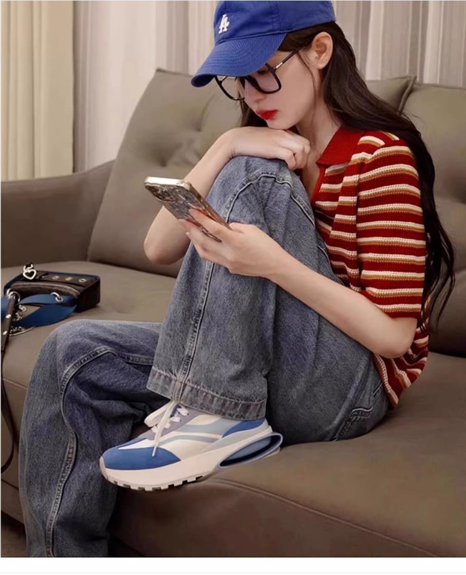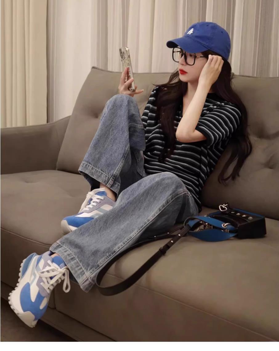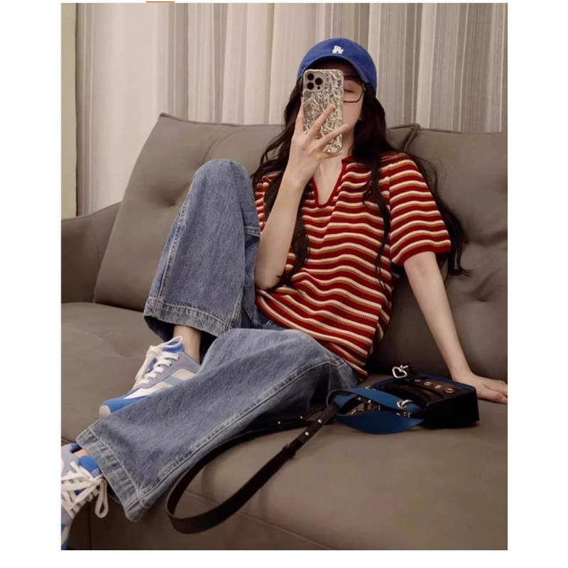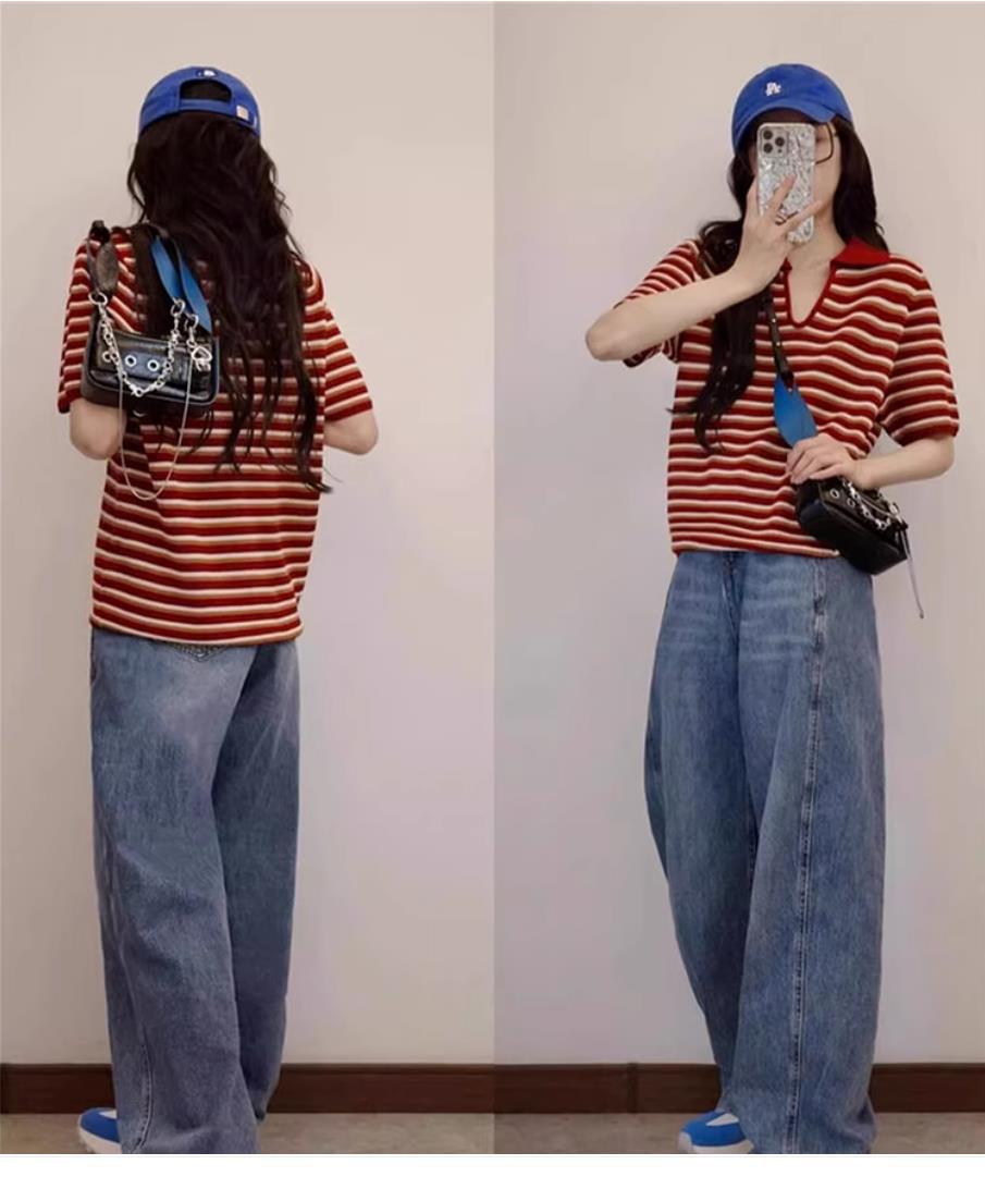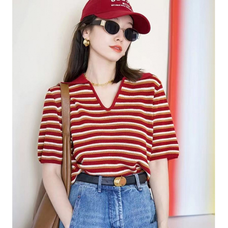 Свободная полосатая рубашка-поло из ледяного шелка, вязаный топ для кормящих мам с обычными плечами, короткими рукавами, летняя мода для миниатюрных мам, кормящих грудью.