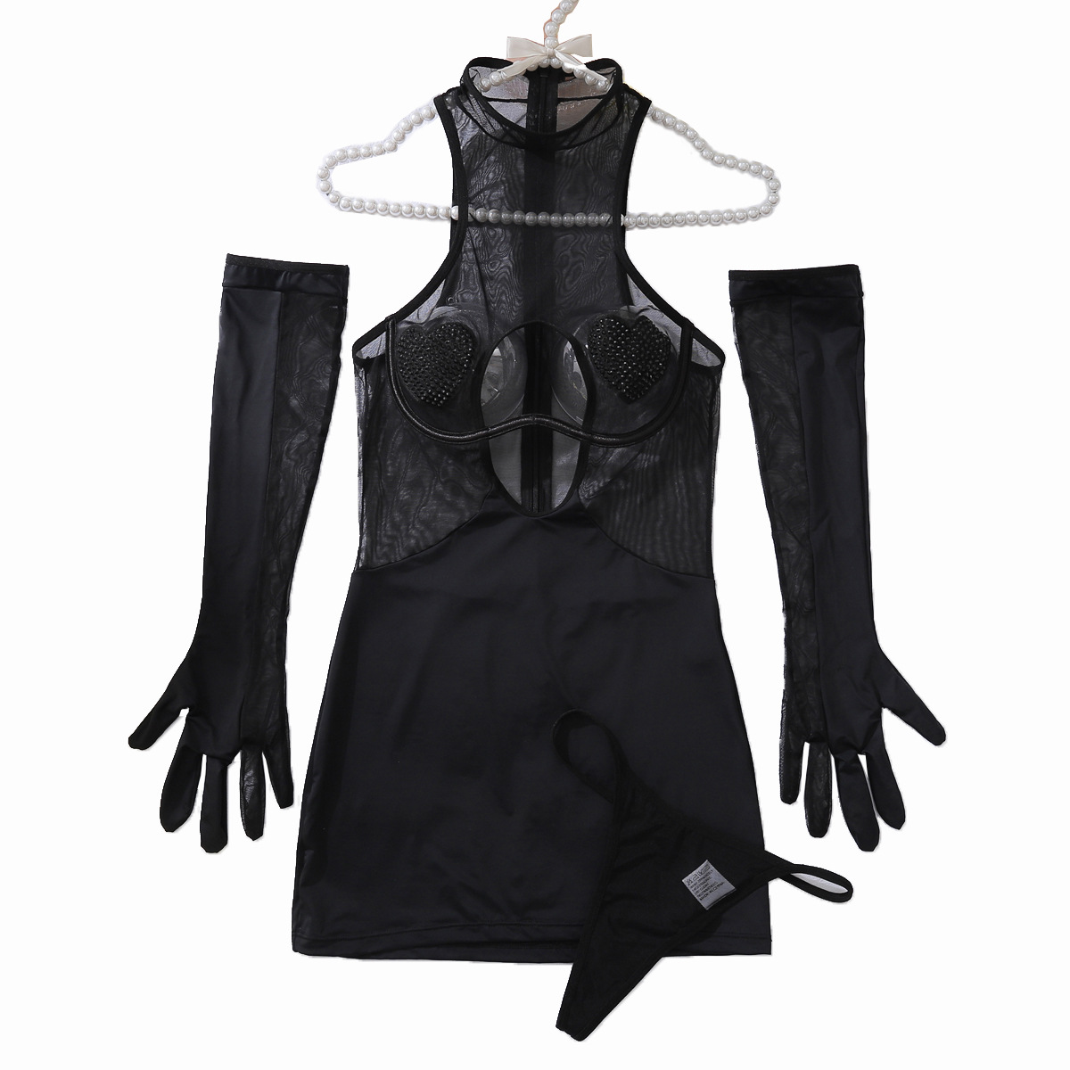 Европейское и американское платье-боди 2025 года в форме сердца с открытой шеей, без рукавов, из прозрачной сетки с вставками, с высоким воротником, сексуальный комплект нижнего белья.
