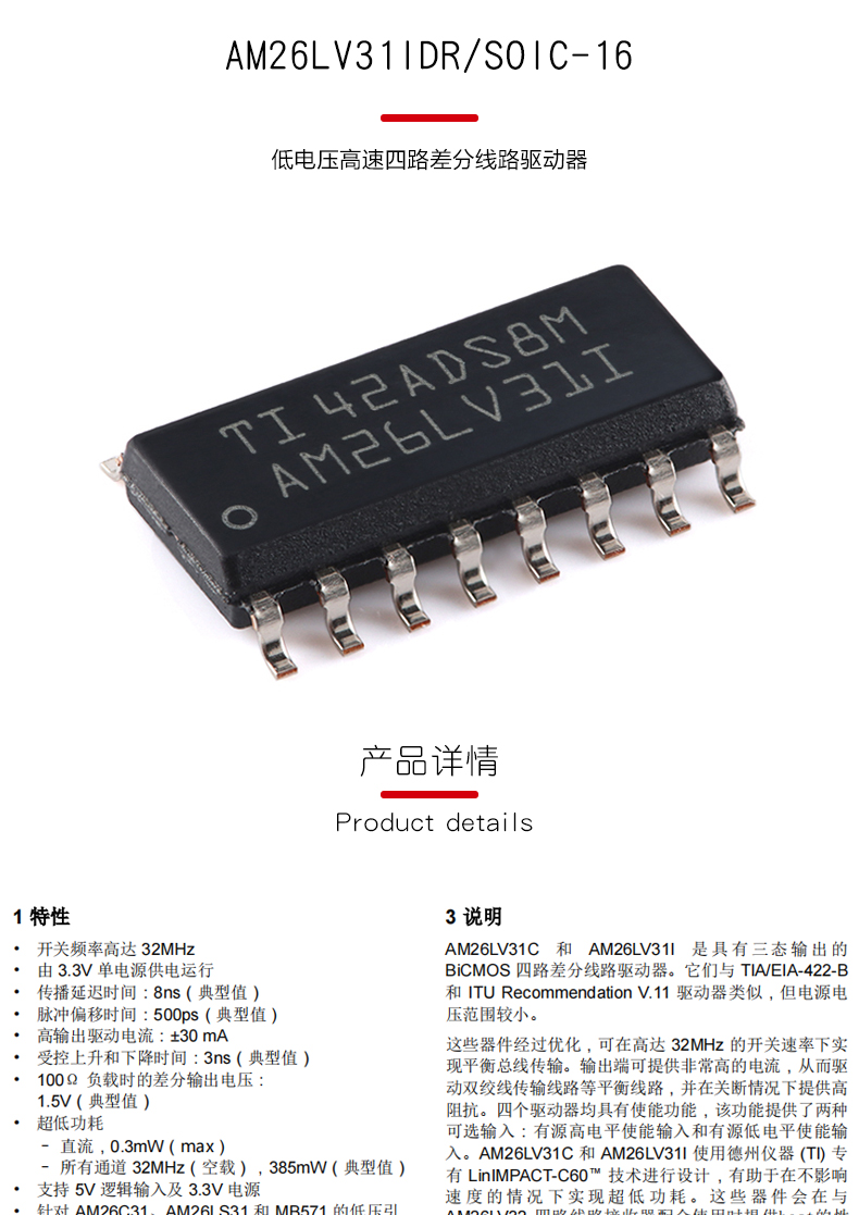 Оригинальный драйвер SOIC-16 низкого напряжения AM26LV31IDR Высокоскоростной четырехходной дифференциальной линии