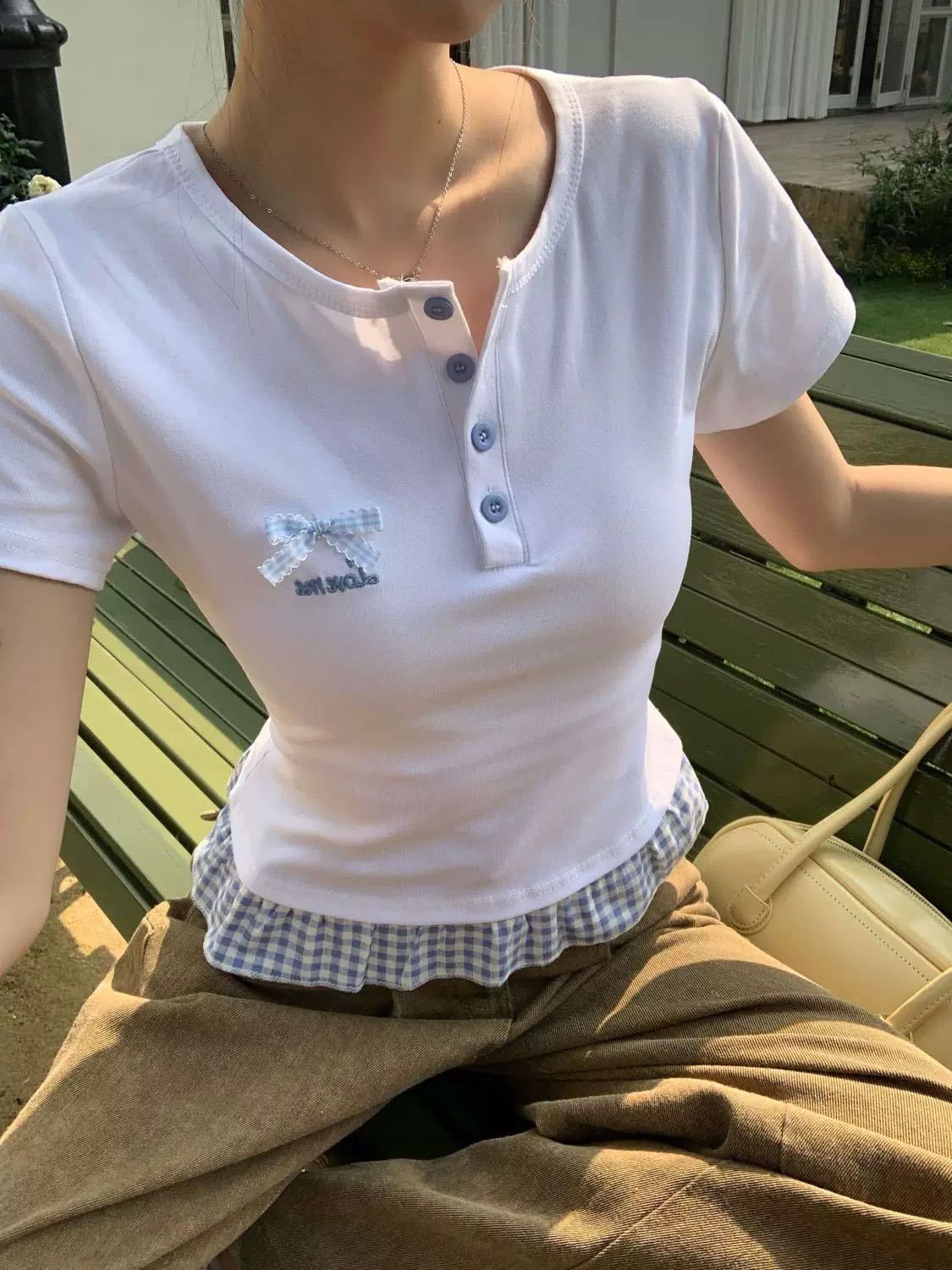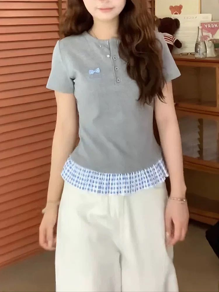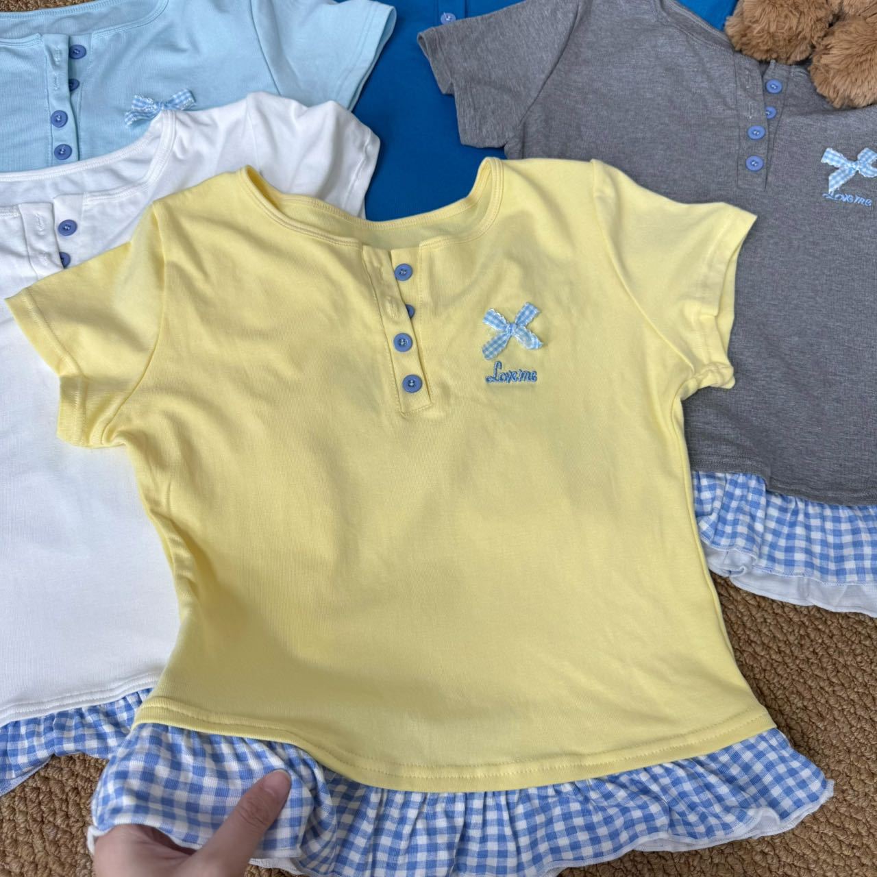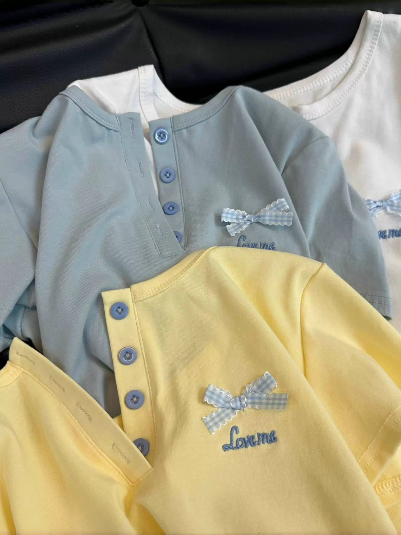 Желтая поддельная футболка из двух частей с допамином для женщин, летний новый стильный топ с милым бантом для маленьких людей