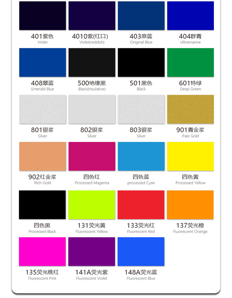 ГК-102 белый; ГК-501 черный; ГК-3020 красный; ГК-306 оранжево-красный; ГК-2022 средний желтый; ГК-203 оригинал желтый; ГК-403 оригинал синий; ГК-404 Ультрамарин; ГК-408 Изумрудно-Синий; ГК-601 специальный зеленый; ГК-4010 Фиолетовый; Специальный отвердитель ГК-1; ГК-100 лак; ГК черный, упаковка 5kg шт.; GK-зеленое золото, подождите, пока не будет выполнена текущая настройка цвета.; GK-красное золото, пожалуйста, подождите текущего цвета; C7-отвердитель 100г.; C2-отвердитель 100г