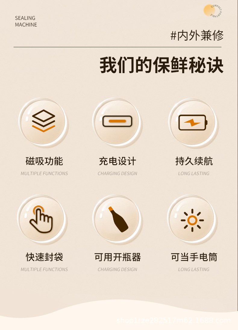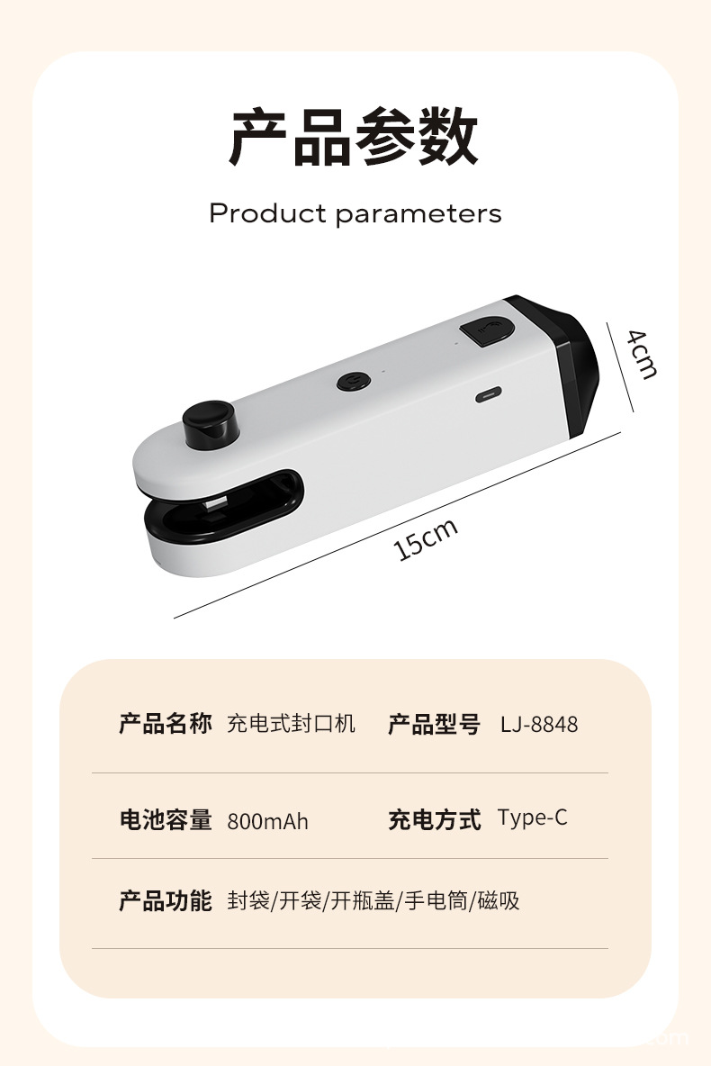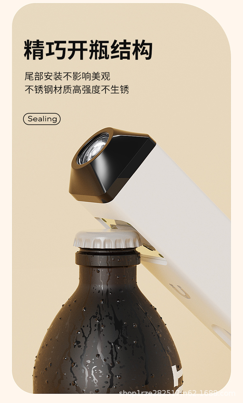 【功能】:加热封口、启瓶器、隐藏刀片、内置磁铁、手电筒