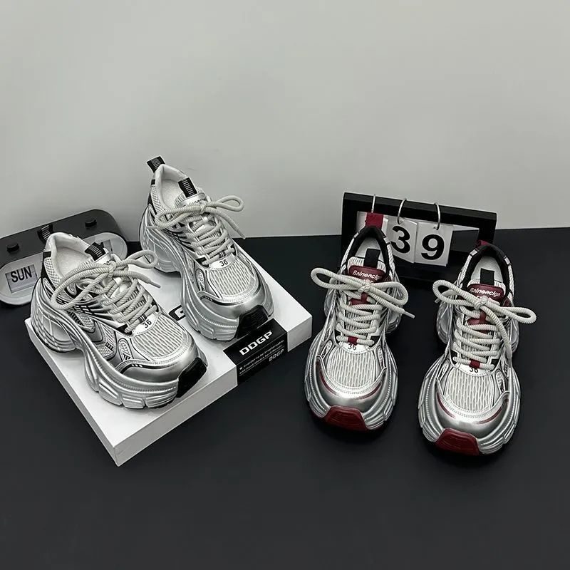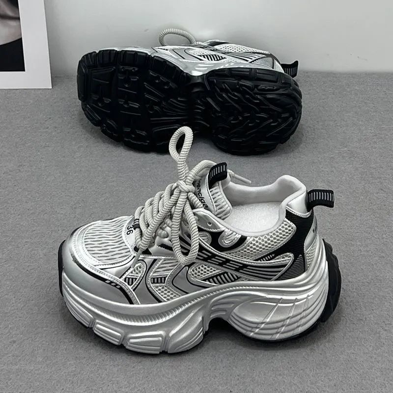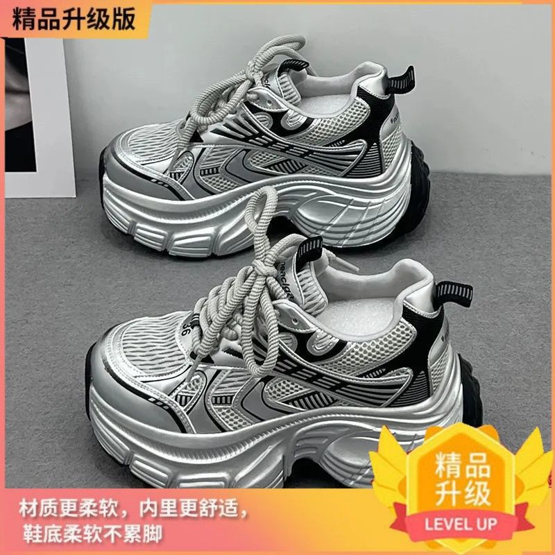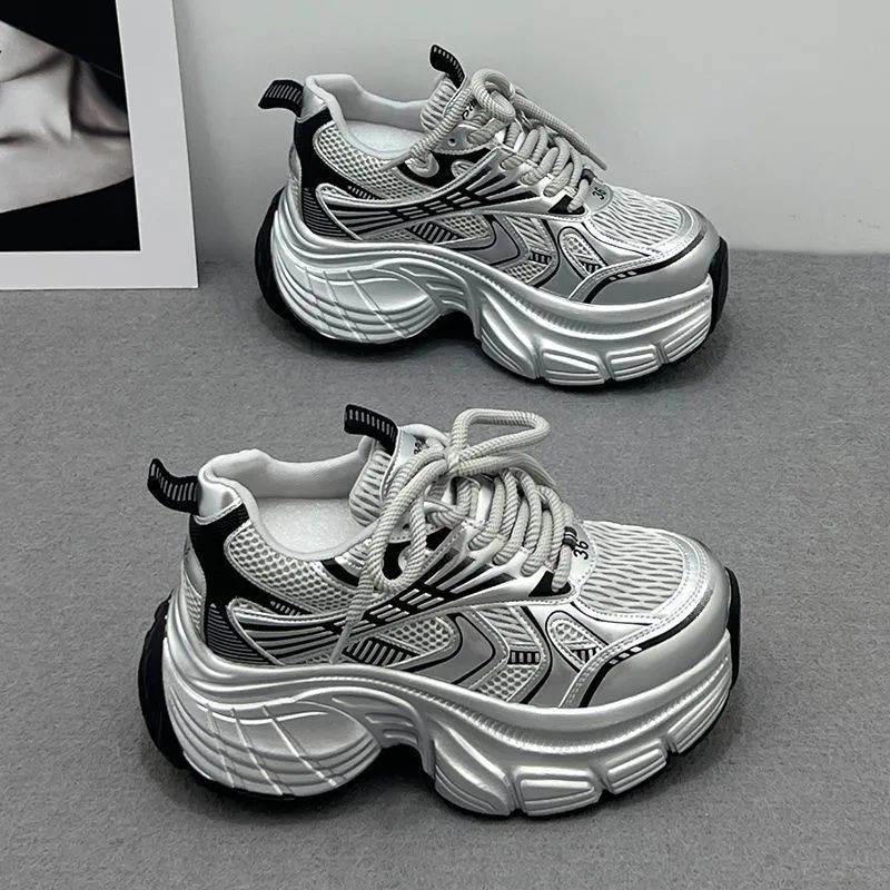 Серебристые женские кроссовки на платформе с увеличенной высотой, новинка осени 2026, модные повседневные спортивные кроссовки на толстой подошве в стиле «папины туфли»