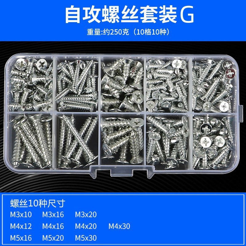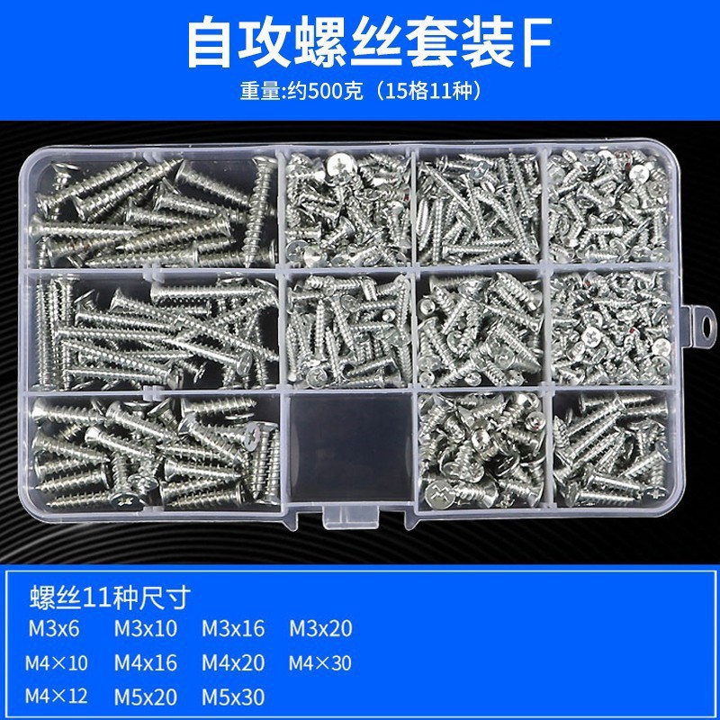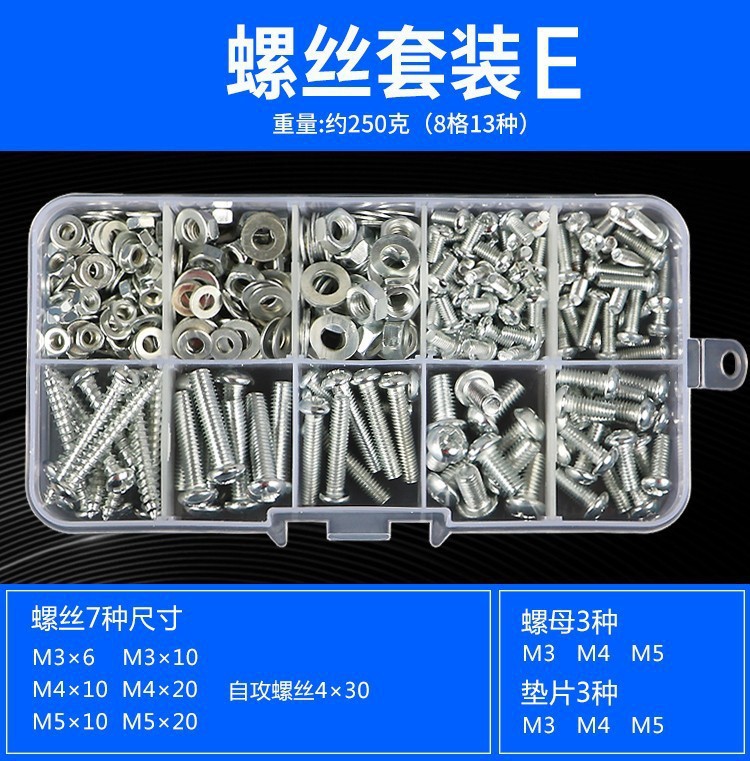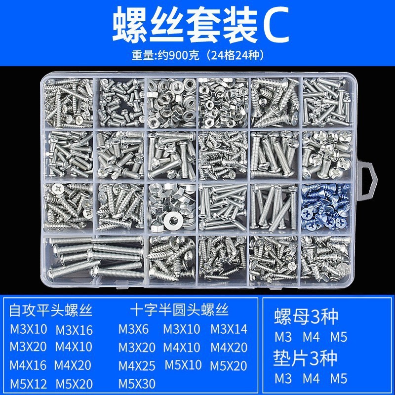 Набор B [18 видов, около 500 грамм]; Набор C [24 вида, около 900 грамм]; Набор D [24 вида, около 900 грамм]; Набор E [13 видов, около 250 грамм]; Набор саморезов F [11 типов, около 500 грамм]; Набор саморезов G [10 типов, около 250 грамм]