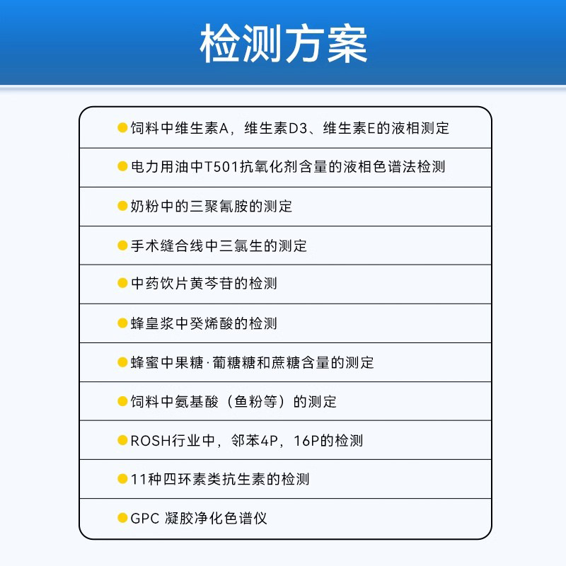 Стандартная модель для определения жидкой фазы витамина А/витамина D3/витамина Е в кормах; Определение жидкой фазой витамина А/витамина D3/витамина Е в обновленной версии корма; Стандартная модель для определения аминокислот (рыбной муки и т.п.) в кормах; Определение аминокислот (рыбной муки и т.п.) в улучшенной версии корма; Стандартный метод определения меламина в сухом молоке; Определение меламина в сухом молоке, обновленная версия; Стандартная модель отрасли Rosh для тестирования фталатов 4P/16P; Модель модернизации отрасли Rosh для тестирования фталевой кислоты 4P/16P; Стандартная модель для обнаружения байкалина; Обнаружение обновленной версии китайского яо-байкалина; Стандарт обнаружения жидкостной хроматографии для содержания антиоксидантов T501 в энергетическом масле; Обнаружение антиоксидантного содержания T501 в модернизированной модели Power Oil с помощью жидкостной хроматографии; Стандартный метод определения триклозана в хирургических швах; Определение триклозана в хирургических швах, обновленная версия; Стандартная модель для обнаружения кислоты декеноида в маточном молочке; Обнаружение декеноиловой кислоты в усовершенствованной модели маточного молочка; Стандартный метод определения содержания фруктозы, глюкозы и сахарозы в меде.; Определение содержания фруктозы, глюкозы и сахарозы в улучшенной версии меда; Стандартная модель для тестирования 11 типов тетрациклических антибиотиков.; Обнаружение 11 видов тетрациклических антибиотиков, обновленная версия; GPC Гель-очистительный хроматограф Полуготовый изохроматический + гелевая колонка + ручной переключающий клапан; GPC Гель-очистительный хроматограф Полуготовый изохроматограф + Гель-хроматографическая колонка + Коллектор фракций