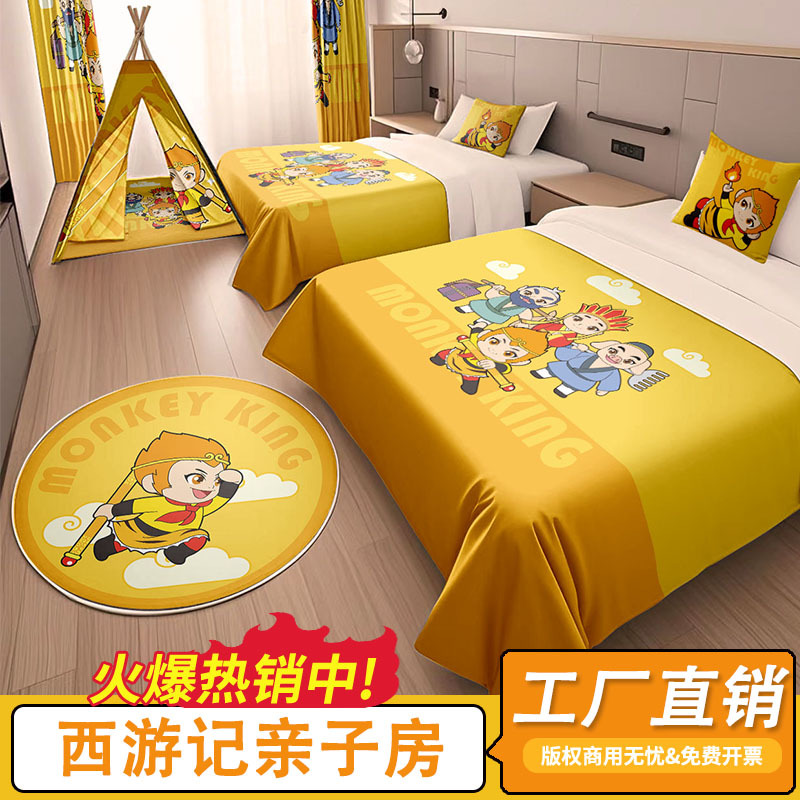 Декор семейного номера отеля с покрывалом из мультфильма «Сунь Укун и Путешествие на Запад», подушкой, украшением палатки и ремонтом тематической комнаты в гостевой семье.