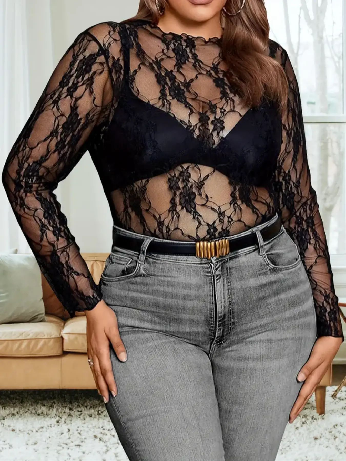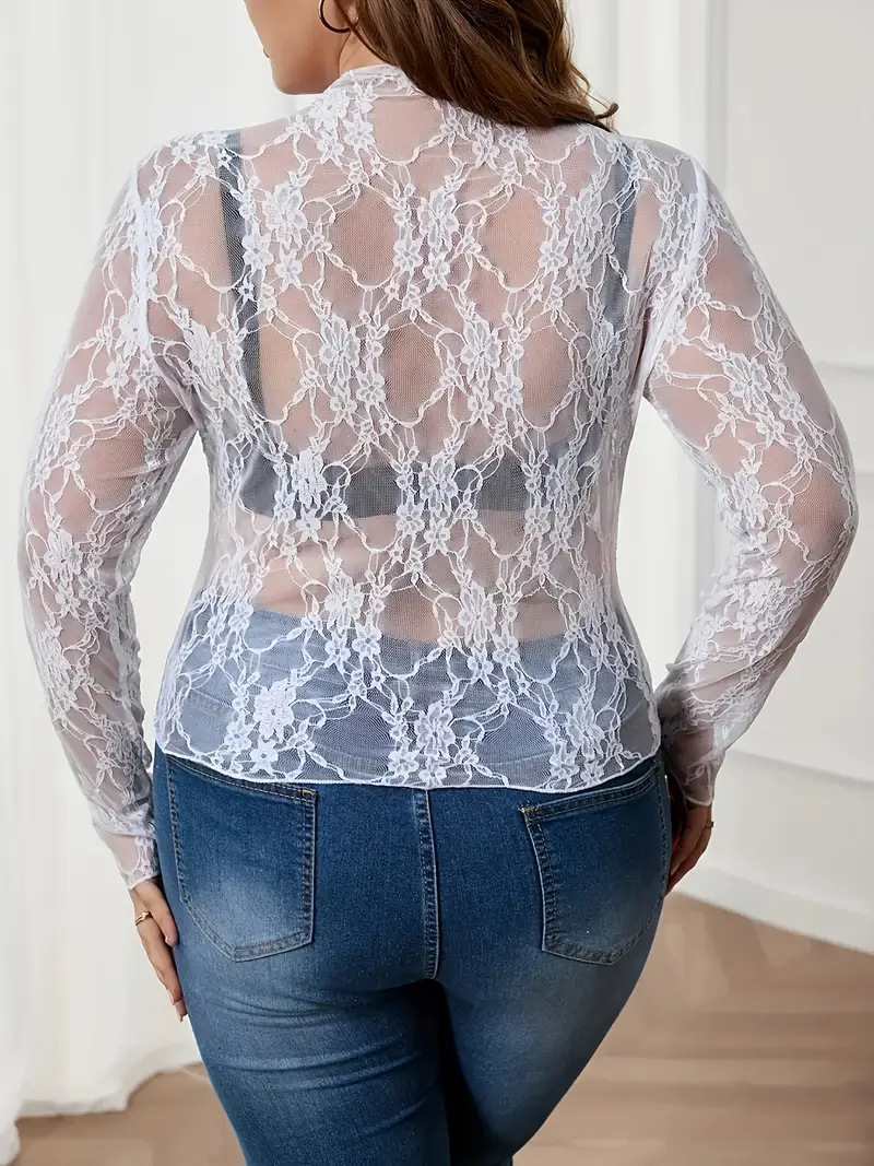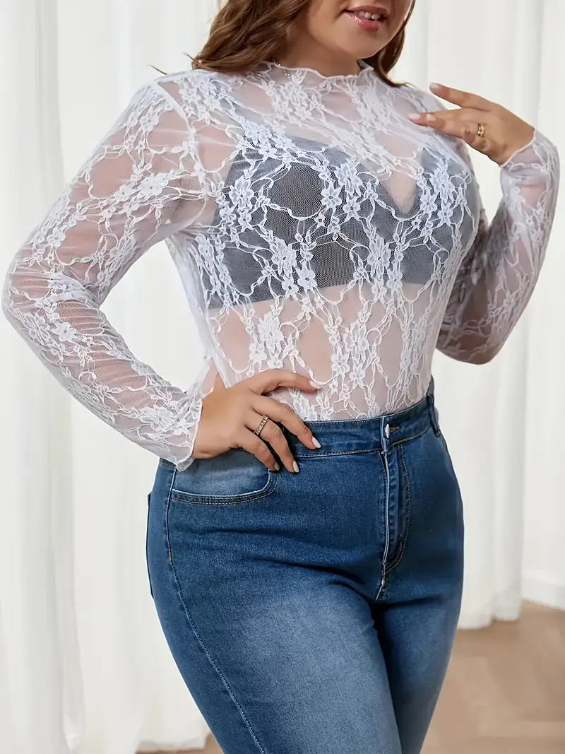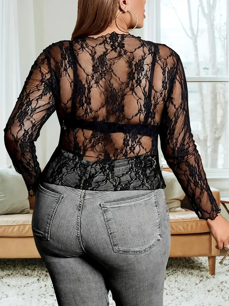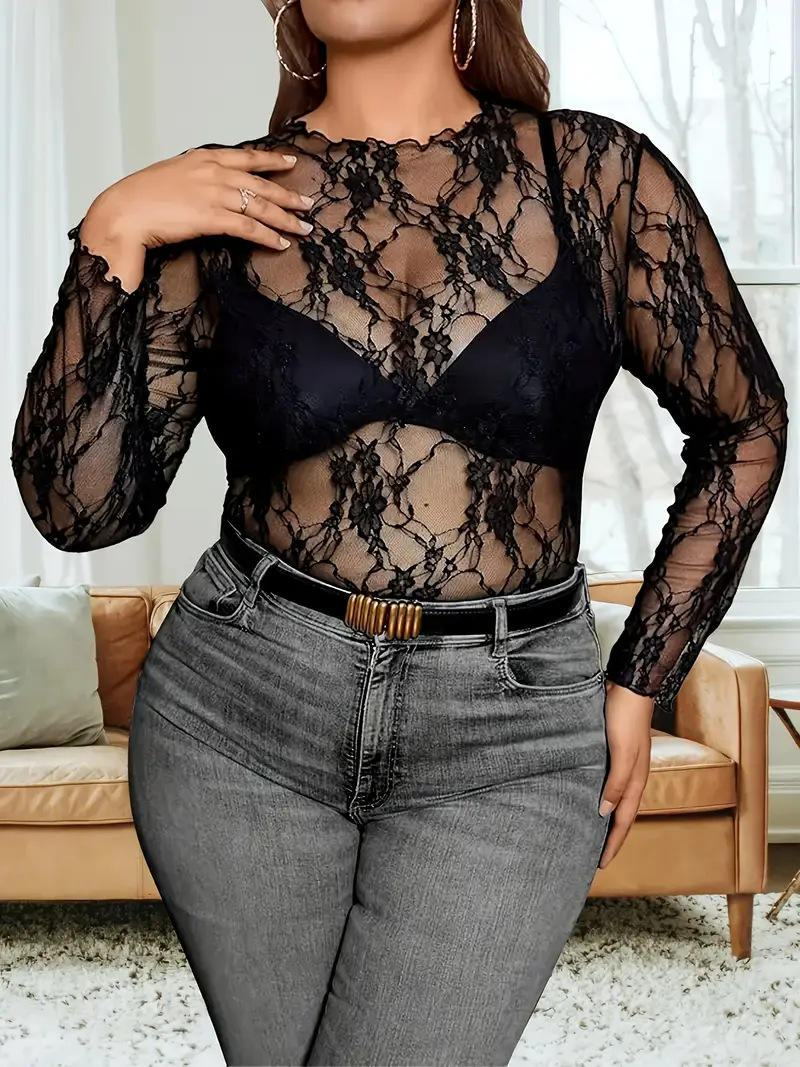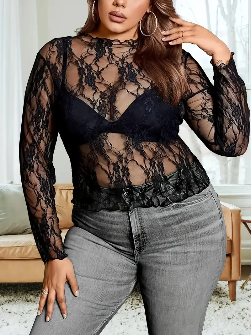 2025 г., европейский и американский трансграничный экспортный женский кружевной топ большого размера, прозрачная рубашка с длинными рукавами и круглым вырезом, прозрачная футболка с цветочным принтом