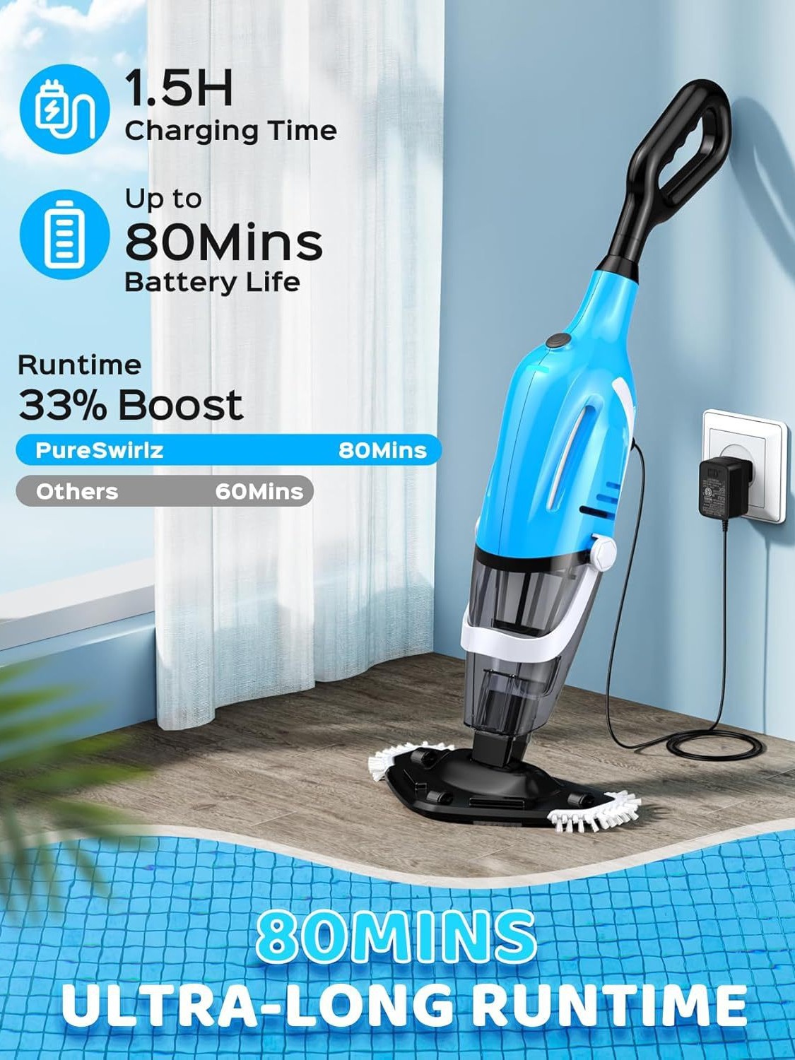 80 分钟不间断清洁 — 无需充电,没有麻烦:这款手持式可充电泳池真空吸尘器配备了先进的快速充电技术,只需 1.5 小时即可充满电,比平均速度快 2 倍;可充电手持式泳池吸尘器提供长达 80 分钟的不间断清洁,因此您可以清洁整个 SPA 和热水浴缸 3 次以上。
