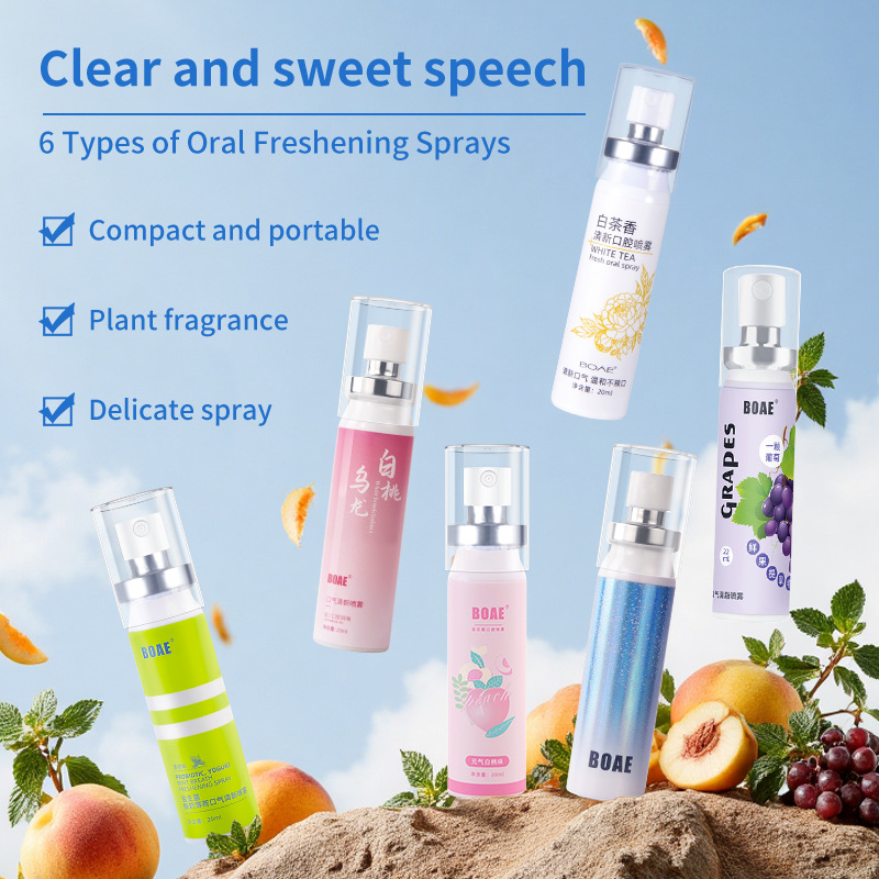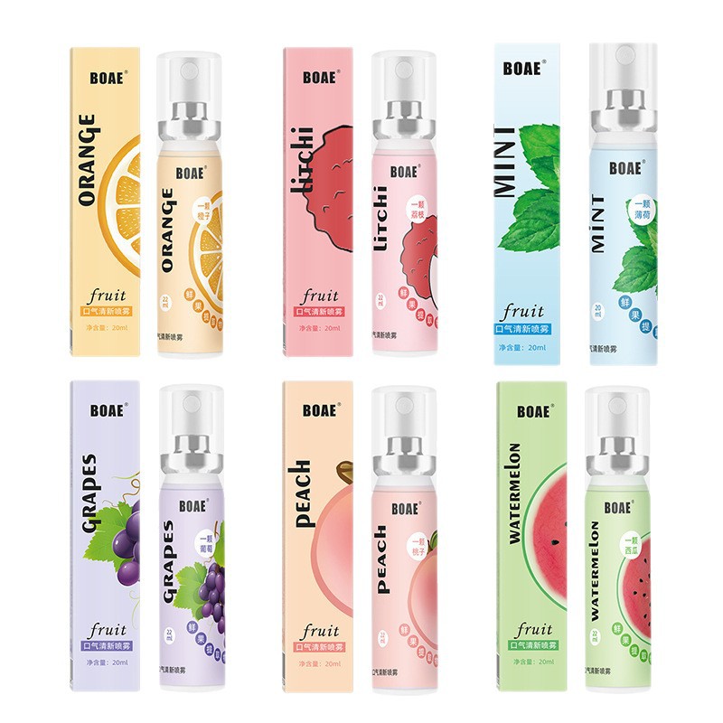 Свежий спрей для полости рта (аромат личи); Оральный свежий спрей (аромат арбуза); Оральный свежий спрей (вкус белого персика); Оральный свежий спрей (апельсиновый вкус); Оральный свежий спрей (виноградный вкус); Оральный свежий спрей (аромат мяты); Свежий спрей для полости рта (аромат грейпфрута)