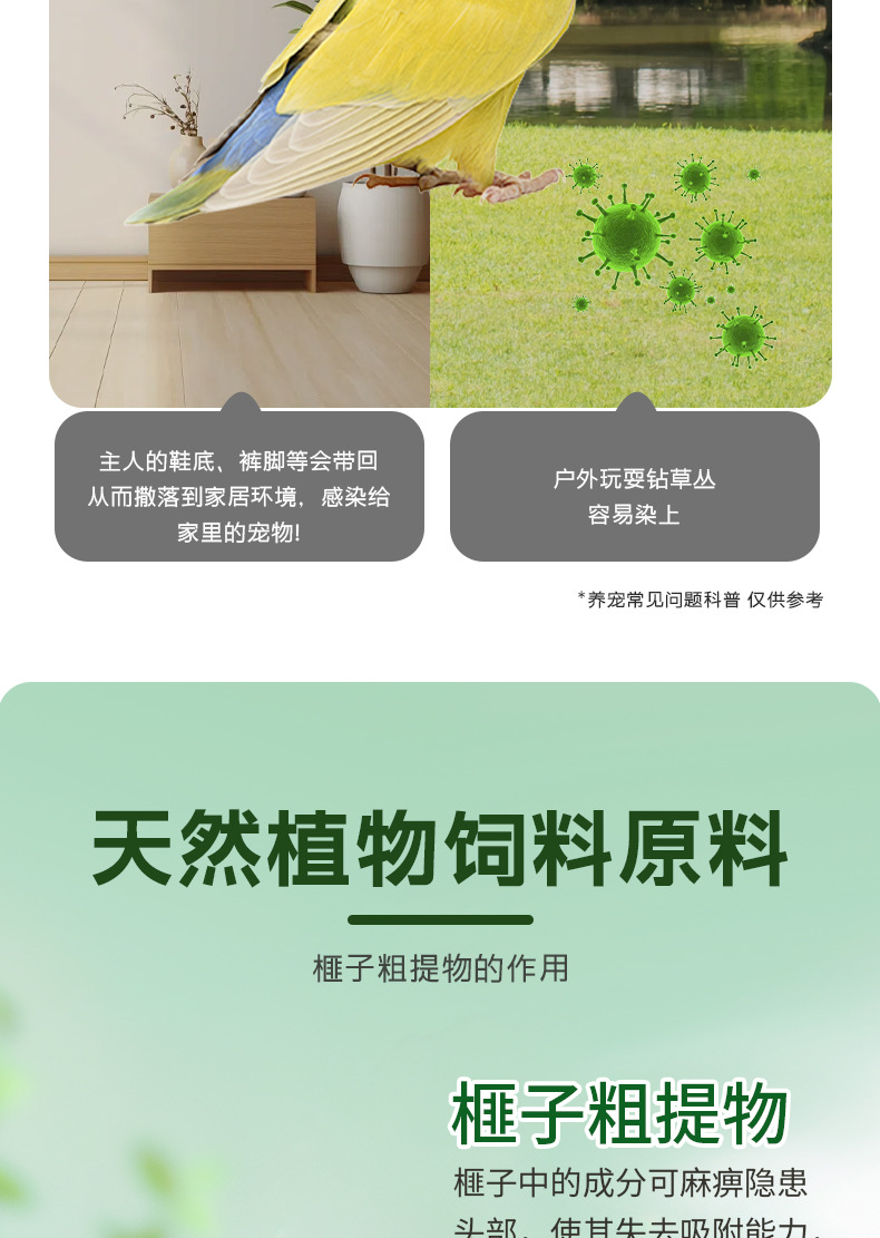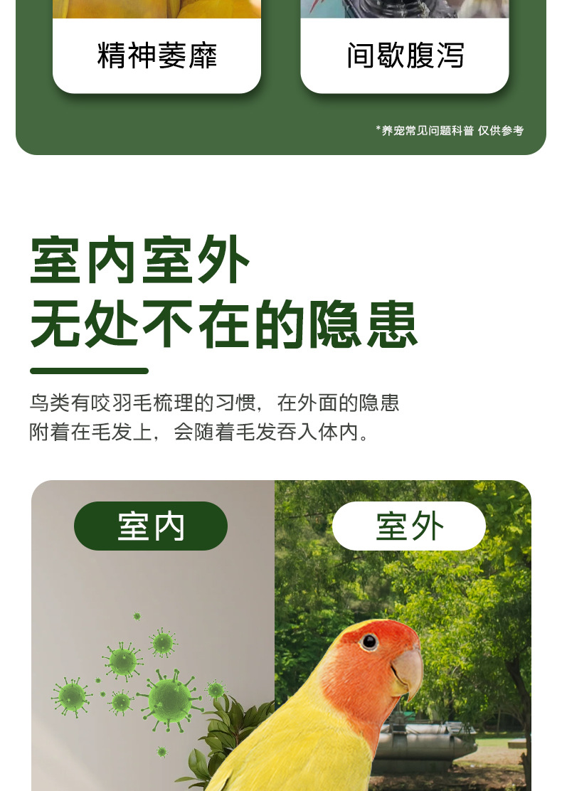 Специальный репеллент от насекомых для попугаев, внутренние паразиты, потеря аппетита, замедленное развитие, прерывистый диарея, натуральный растительный корм.