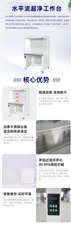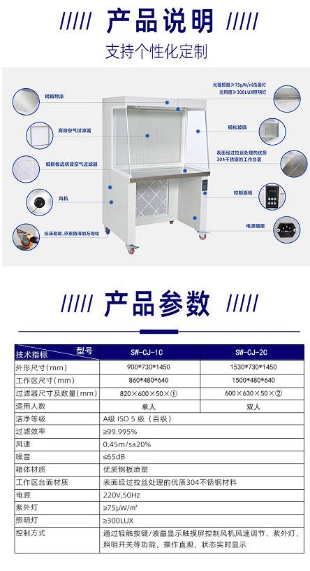 Наклонный одинарный горизонтальный поток: внешние размеры: 900*730*1450, рабочая зона: 860*480*640; Наклонный двойной горизонтальный поток: внешние размеры: 1540*760*1450, рабочая зона: 1500*480*640; Чистое освещение рабочего стола; Чистая рабочая поверхность — стерилизационная лампа