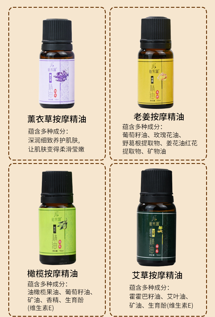 10 мл эфирного масла лаванды; 10 м эфирного масла розы l; 10 мл эфирного масла оливы; 10 мл увлажняющего эфирного масла; 10 мл эфирного масла полыни; 10 мл эфирного масла имбиря
