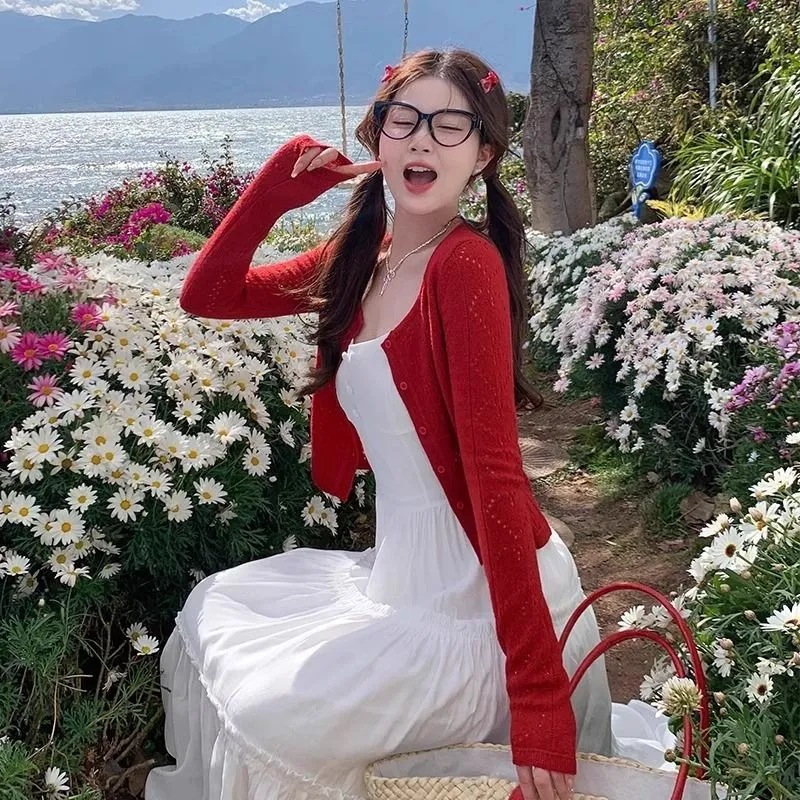 Вязаный кардиган с защитой от солнца, тонкая женская юбка на подтяжках, блузка, летняя шаль, красный элегантный топ.