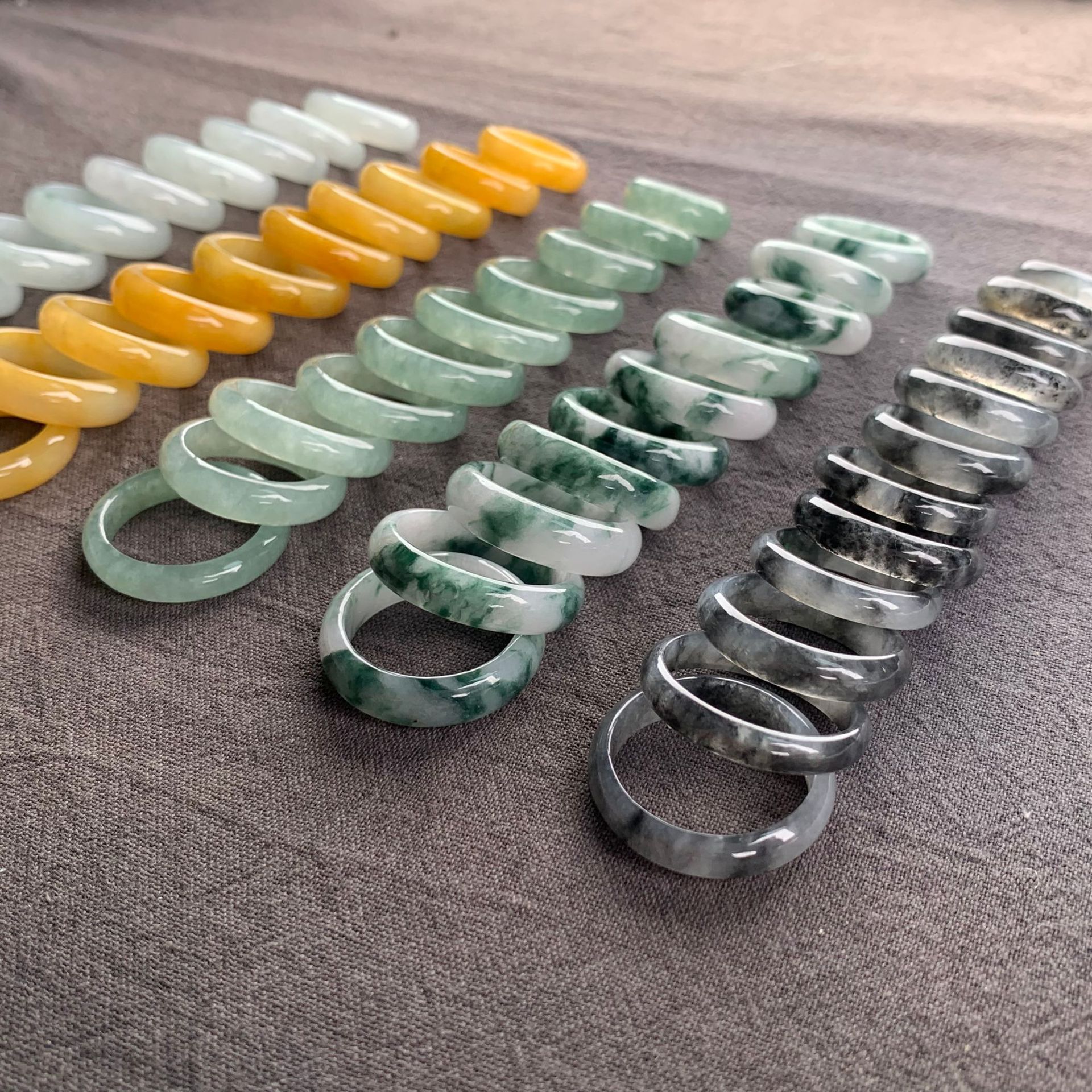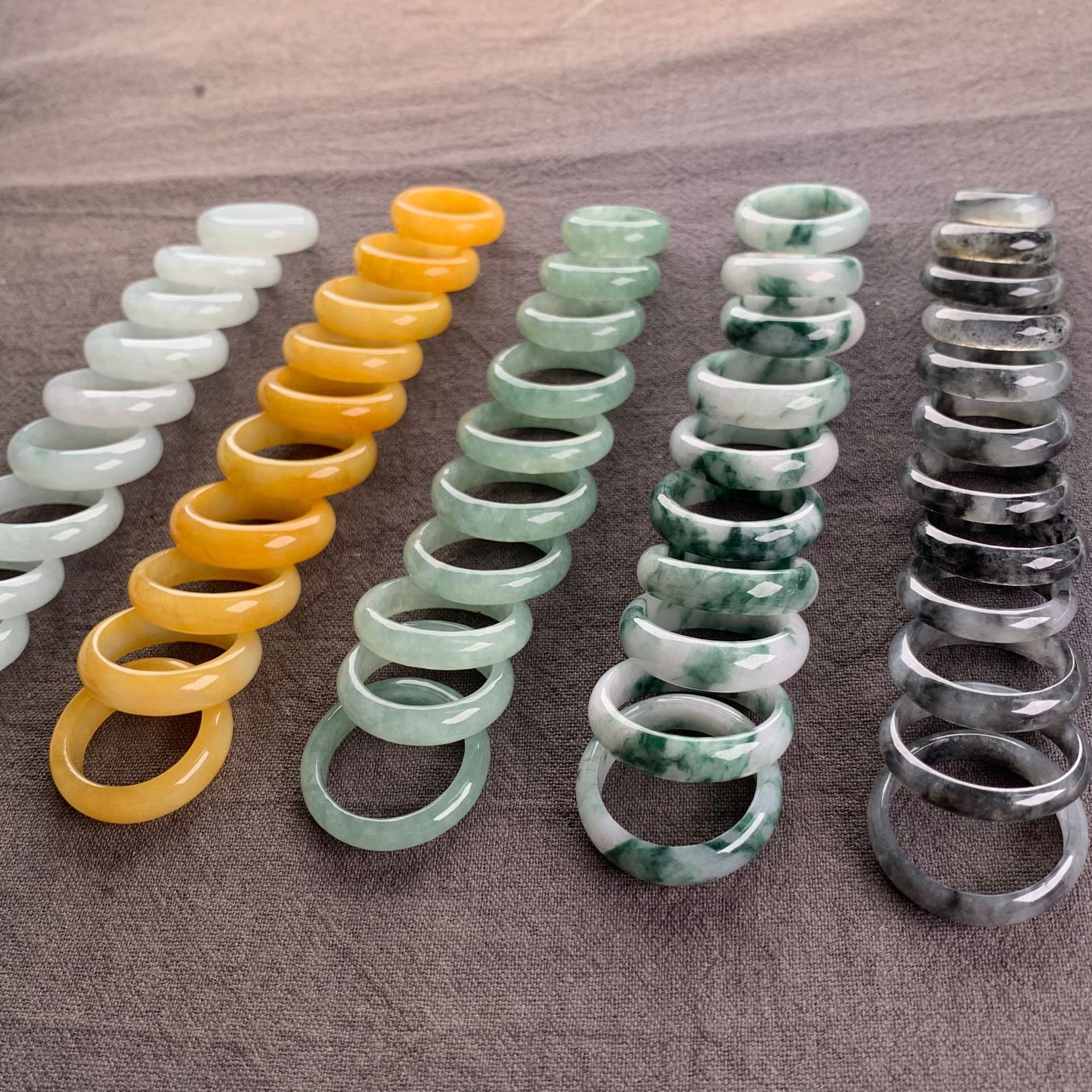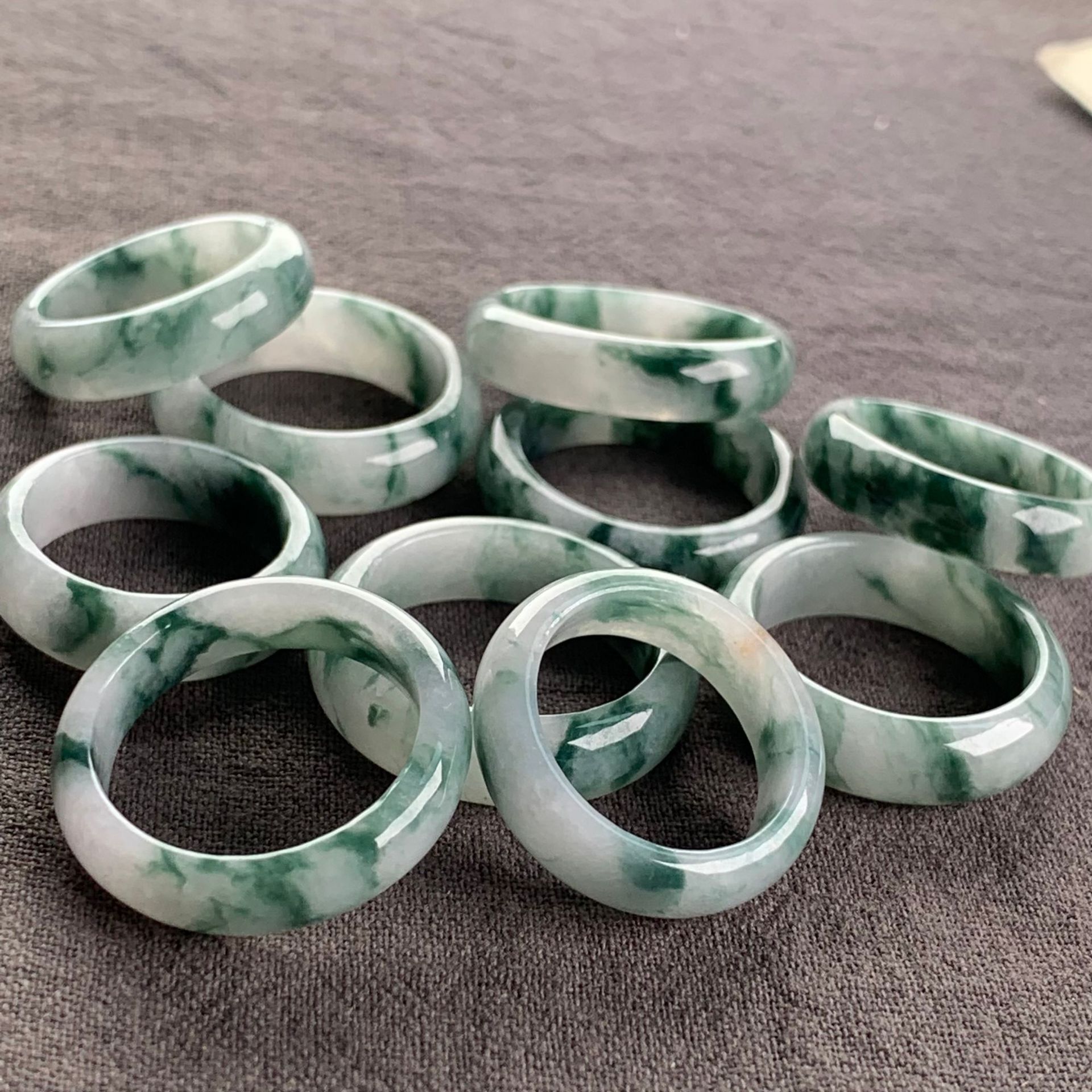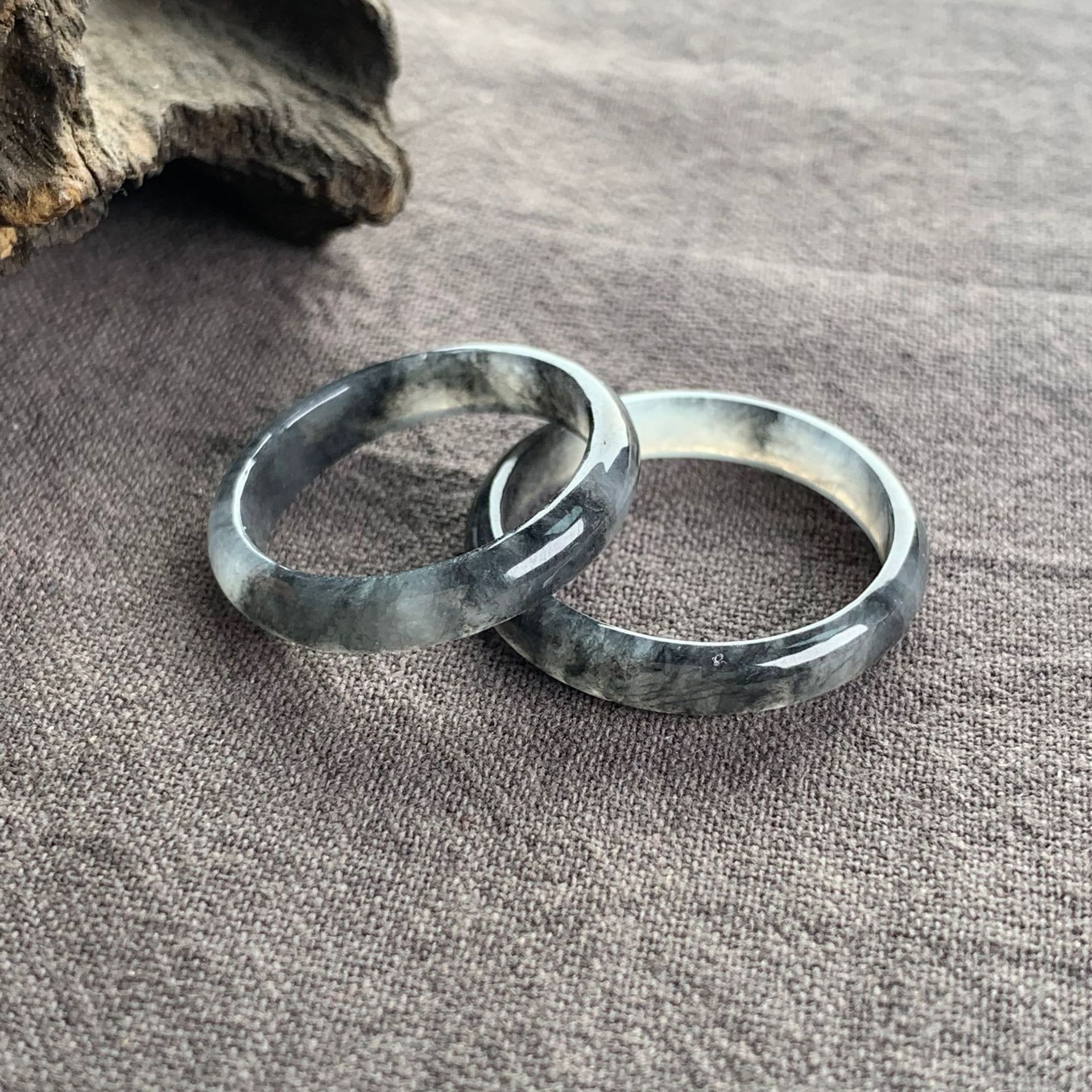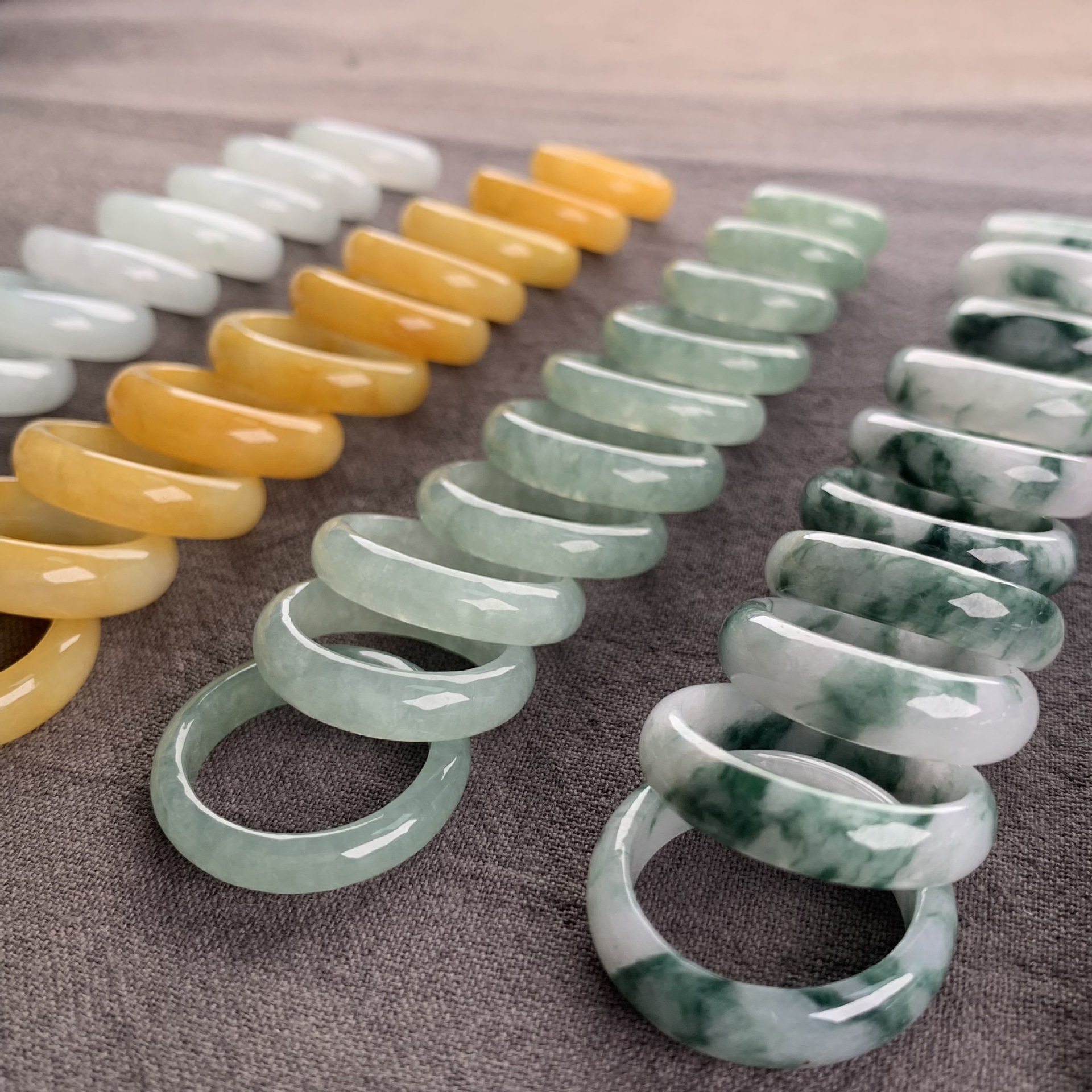 Кольцо из бирманского нефрита класса А, зеленое с цветочными узорами, кольцо типа «ледяная курица», нефрит цвета «жидкое масло» с зелеными узорами, пара колец.