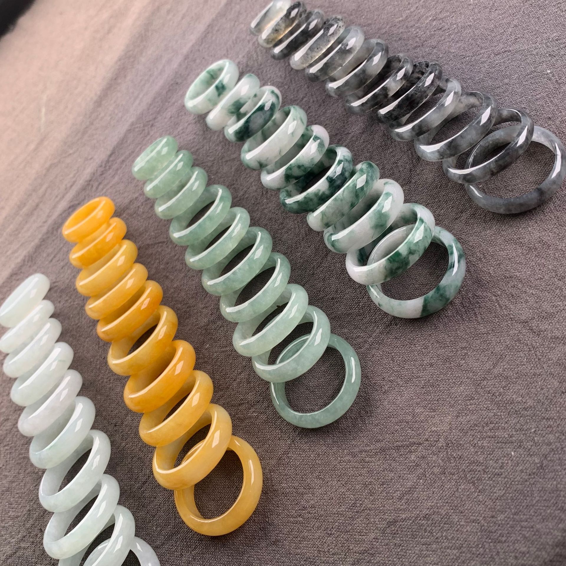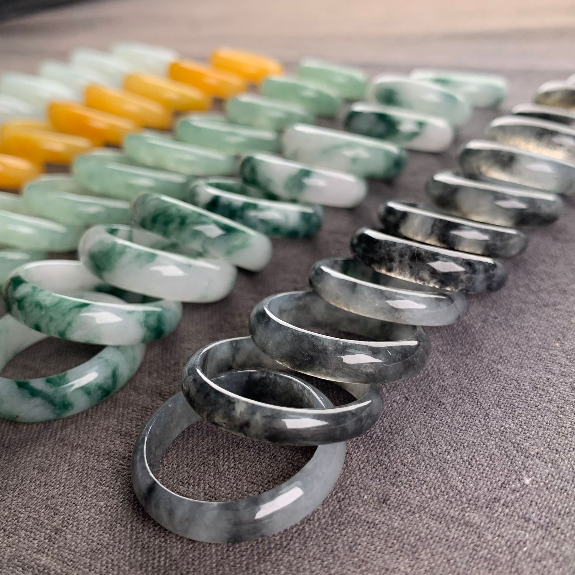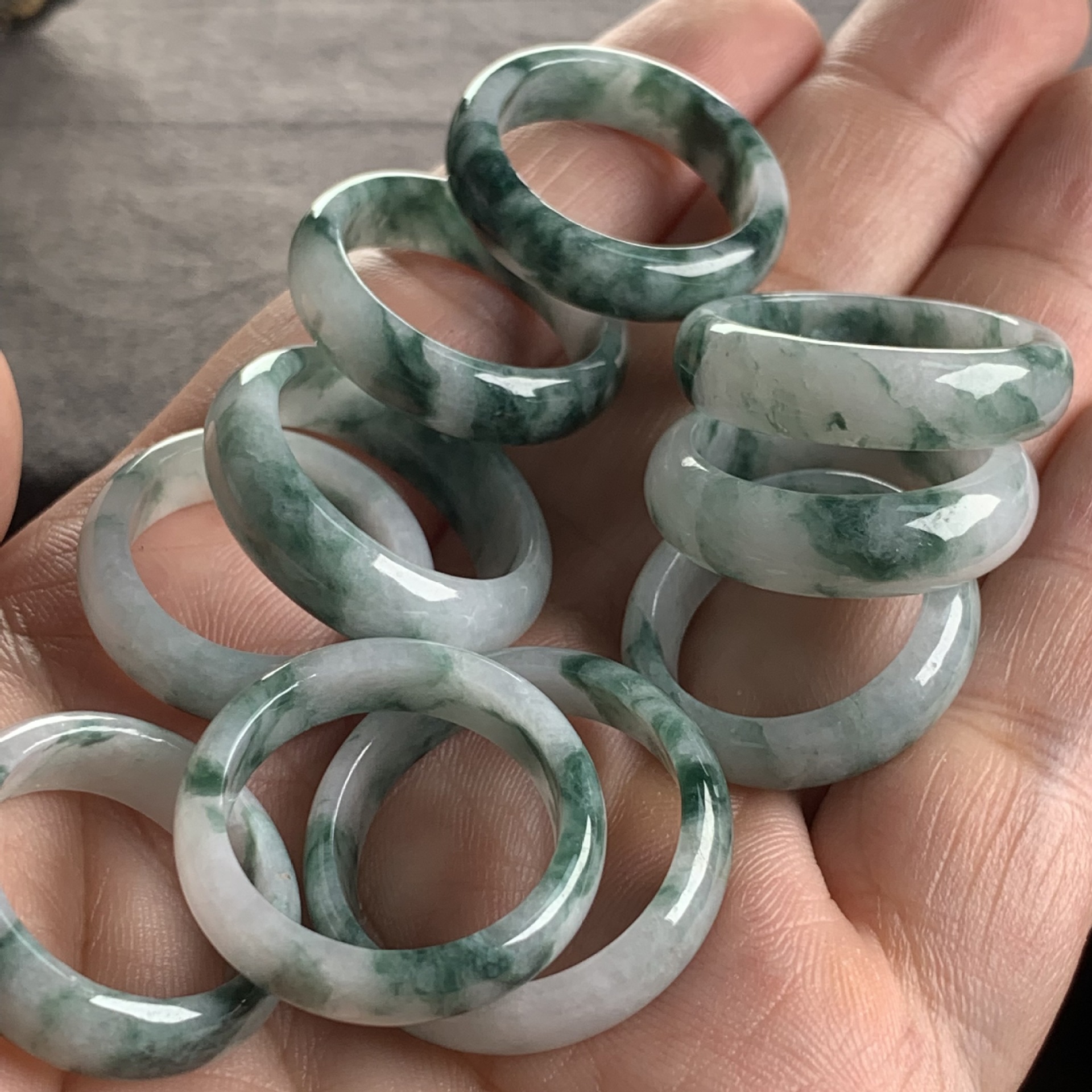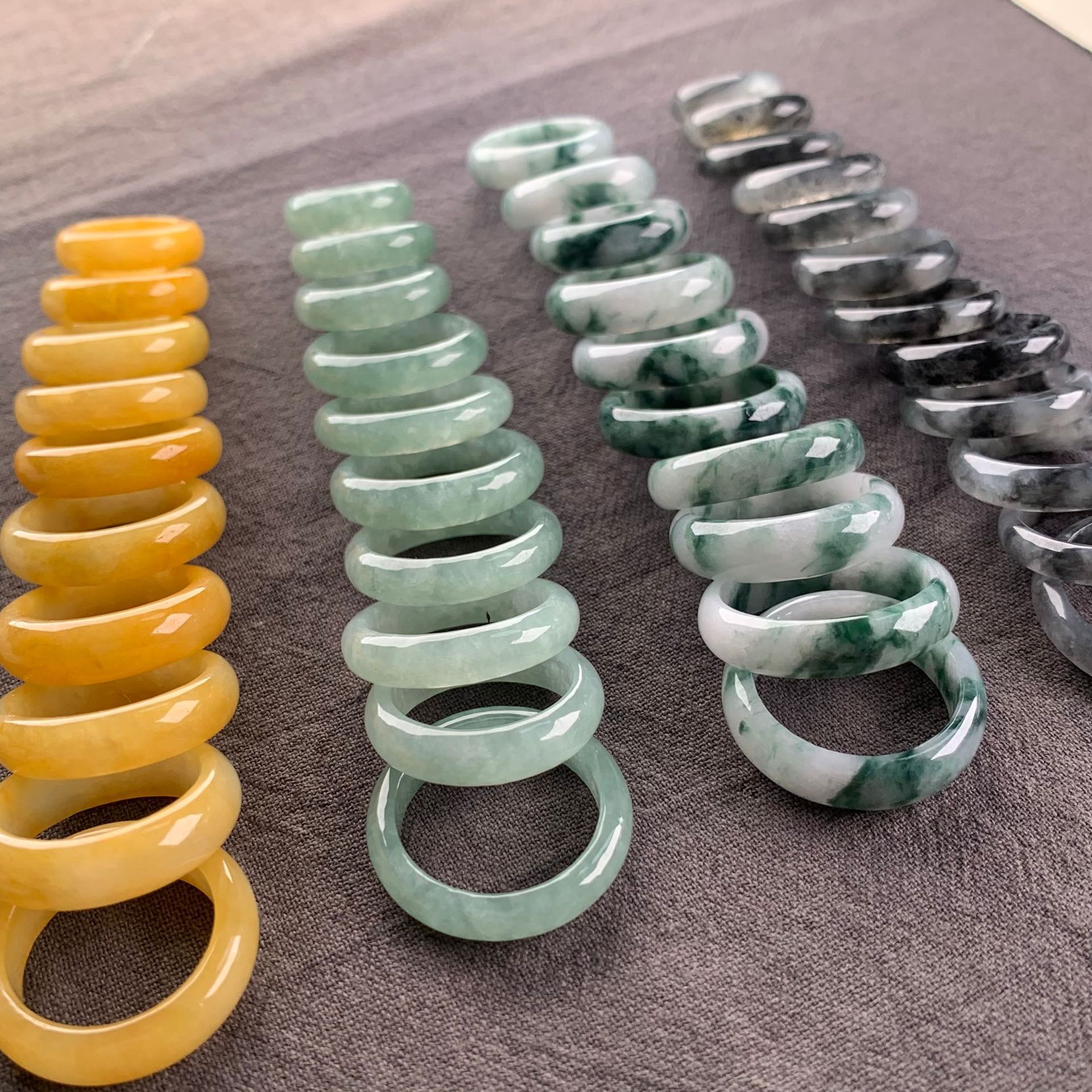 Кольцо из бирманского нефрита класса А, зеленое с цветочными узорами, кольцо типа «ледяная курица», нефрит цвета «жидкое масло» с зелеными узорами, пара колец.