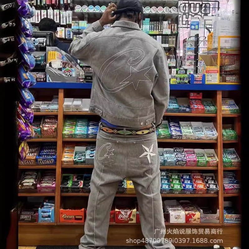 Джинсовый костюм Corteiz в стиле кросс-бордер, джинсовая куртка в стиле вестерн, свободные джинсы, модный бренд