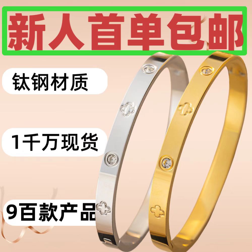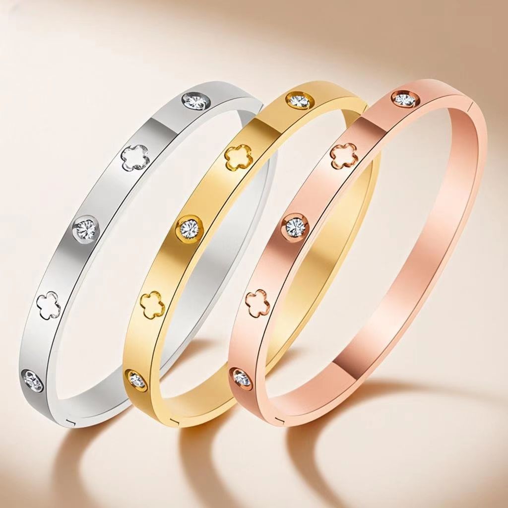 Браслет из нержавеющей стали, не тускнеющий, из титановой стали, женский, с четырехлистным клевером, в европейском и американском стиле, простое украшение с бриллиантами, в стиле легкой роскоши.