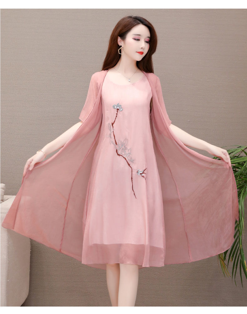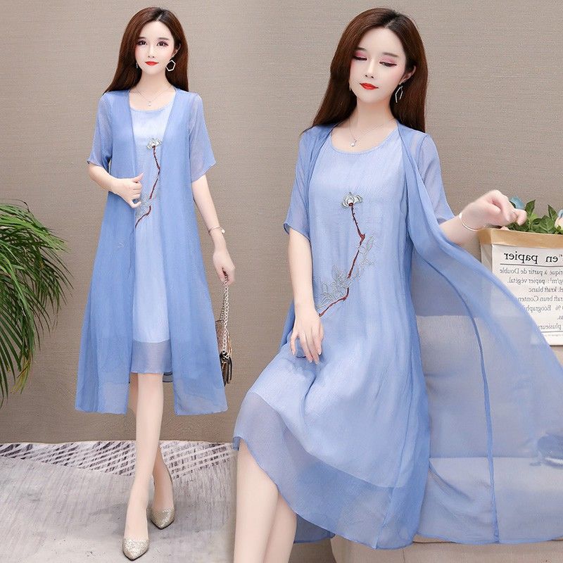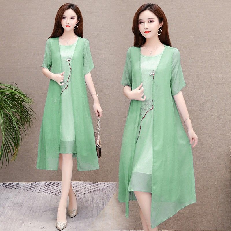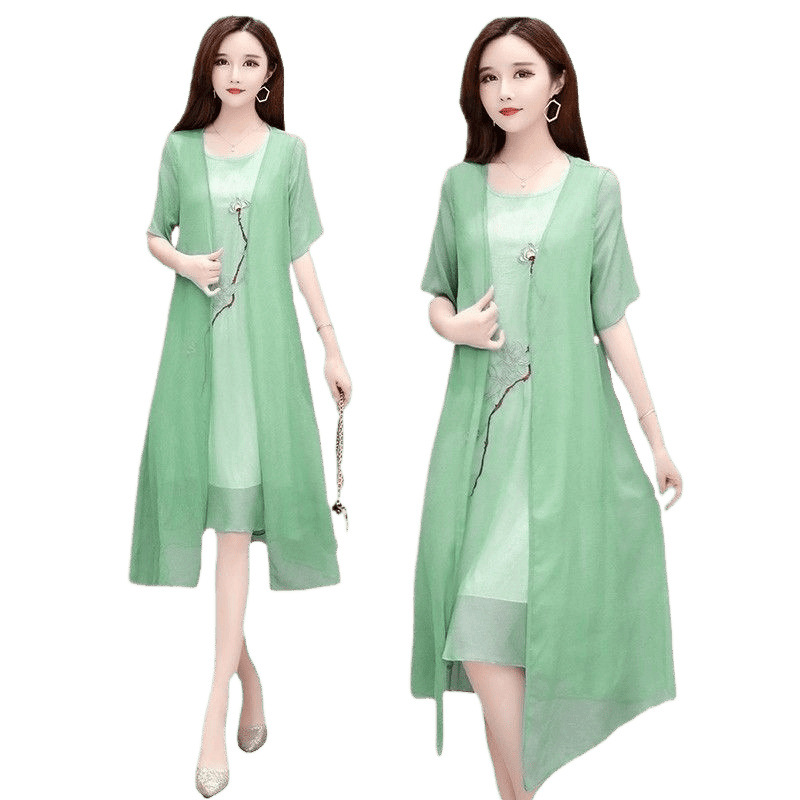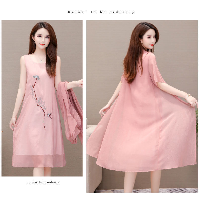 Плюс размер, комплект из двух предметов с вышивкой, весна 2025, новое элегантное шифоновое платье средней длины династии Хань, закрывающее живот, для женщин