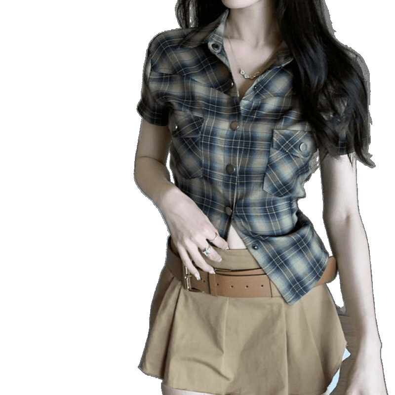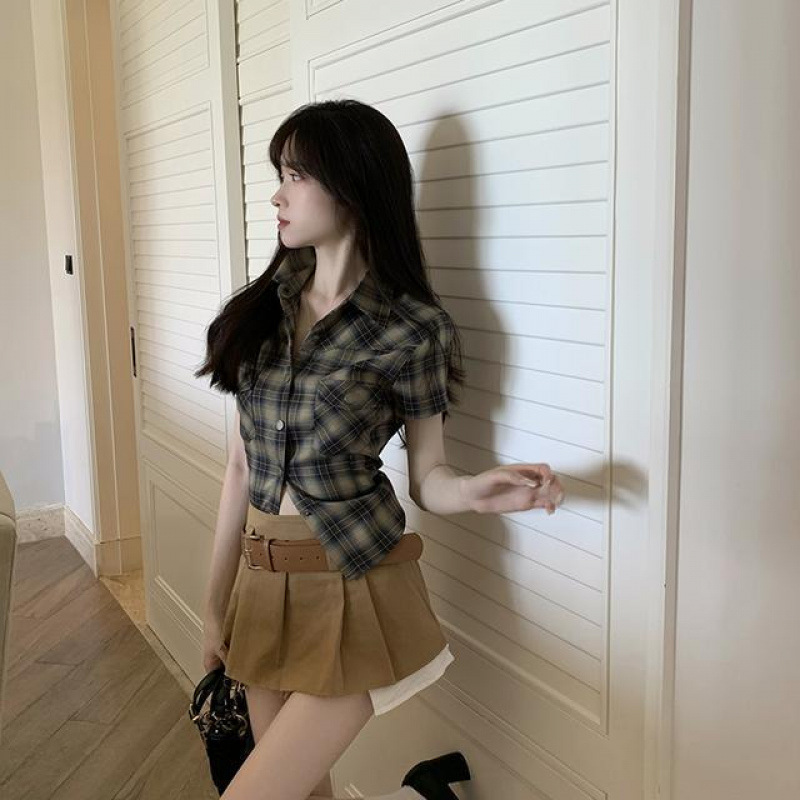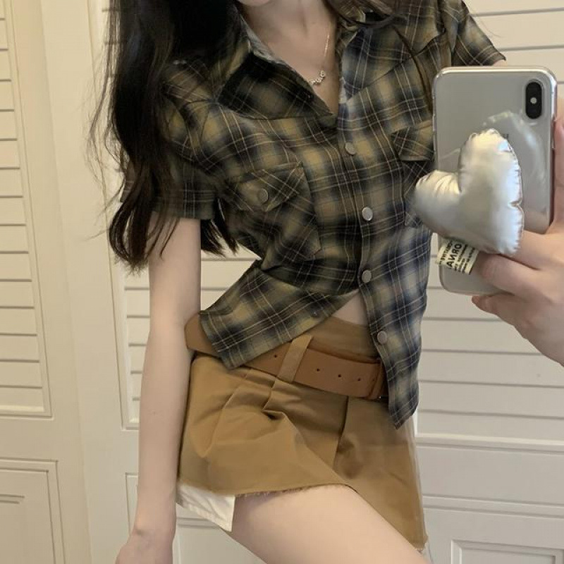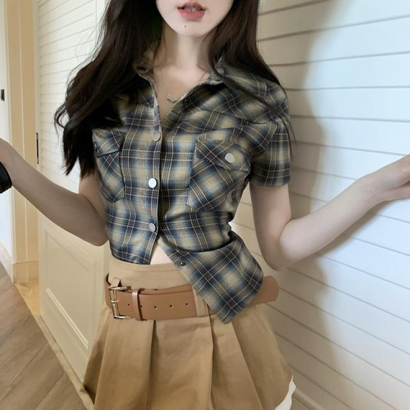 Клетчатая рубашка в гонконгском стиле, женская дизайнерская нишевая рубашка с короткими рукавами, новый летний тонкий модный топ с воротником в стиле ретро