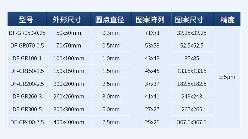 DF-GR050 Точность ±5 мкм 50×50 мм; DF-GR070 Точность ±5 мкм 70×70 мм; DF-GR100 Точность ±5 мкм 100×100 мм; DF-GR150 Точность ±5 мкм 150×150 мм; DF-GR200 Точность ±5 мкм 200×200 мм; DF-GR260 Точность ±5 мкм 260×260 мм; DF-GR300 Точность ±5 мкм 300×300 мм; DF-GR400 Точность ±5 мкм 400×400 мм