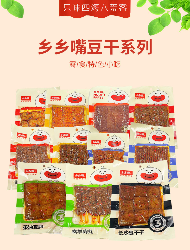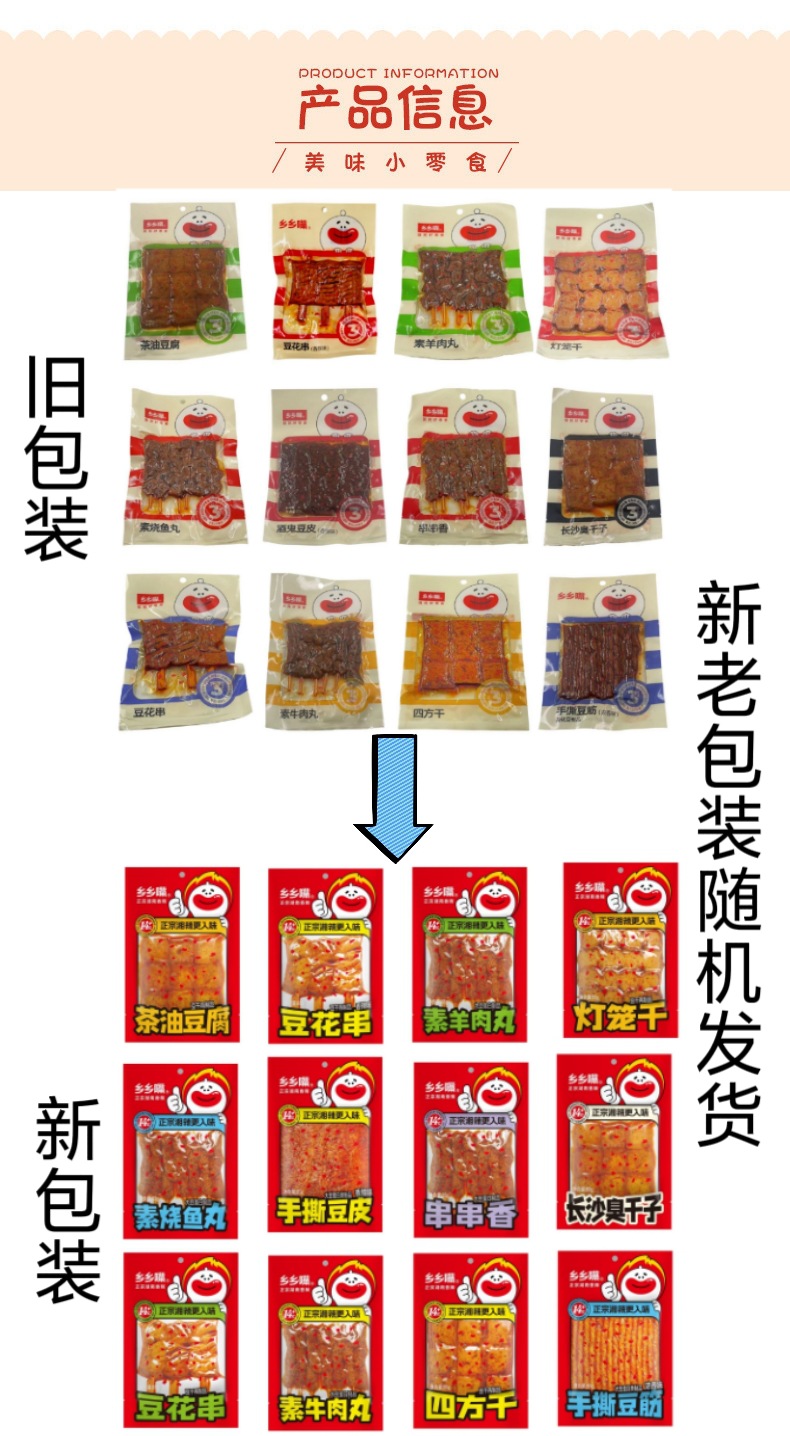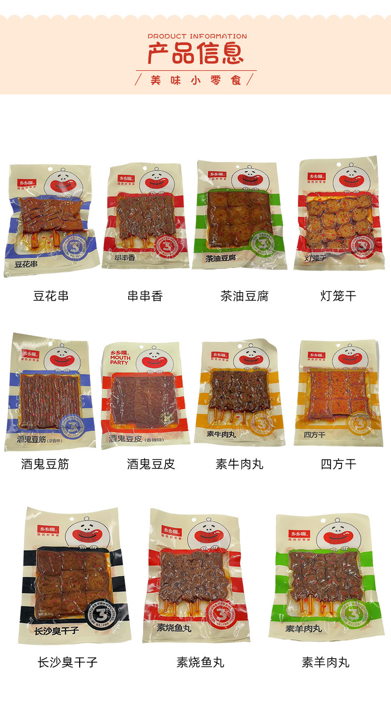 Тофу с чайным маслом; Чуань Чуань Сян; сухой фонарь; Ручной тертый тофу с соусным вкусом; Ручной измельчённый тофу с насыщенным ароматом; Пьяная бобовая кожа; Сифанг сухой; Чанша вонючие сушеные семена; Тушёные рыбные шарики; Вегетарианские фрикадельки; Шашлычки из тофу (красная упаковка); Шашлычки из тофу (синяя упаковка); Вегетарианские говяжьи шарики