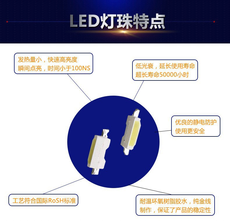 - ①本公司采用台湾全自动固晶机,焊线机,保证产品的一致性,产品采用台湾芯片,耐温环氧树脂胶水,金线制作,保证了产品的稳定性;