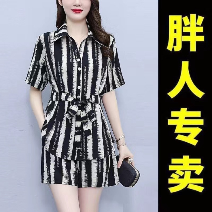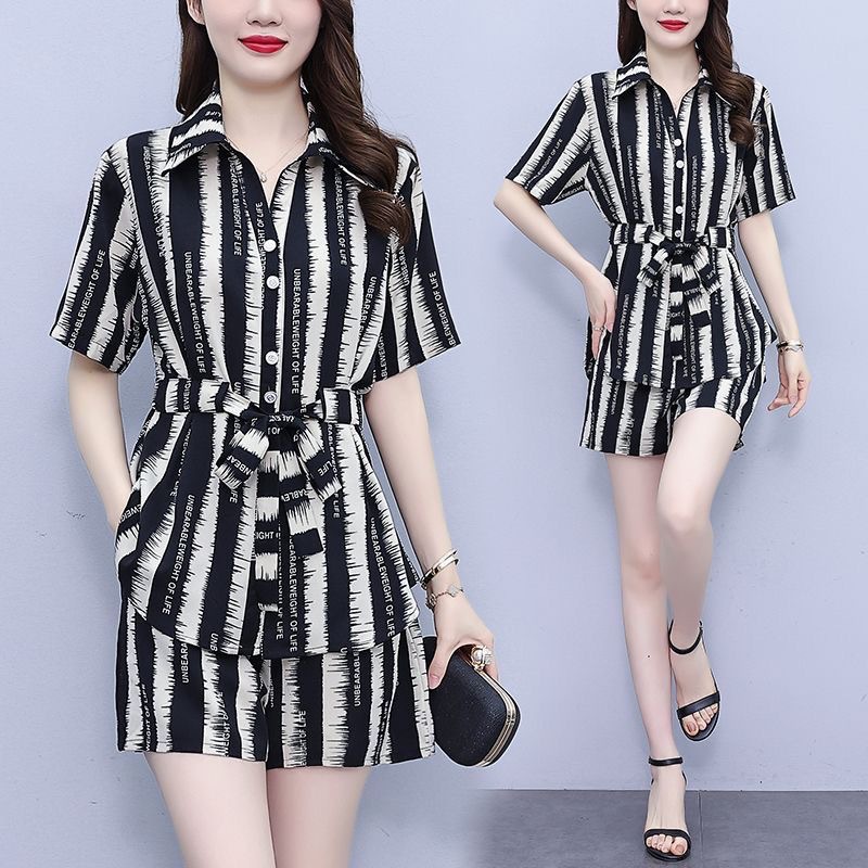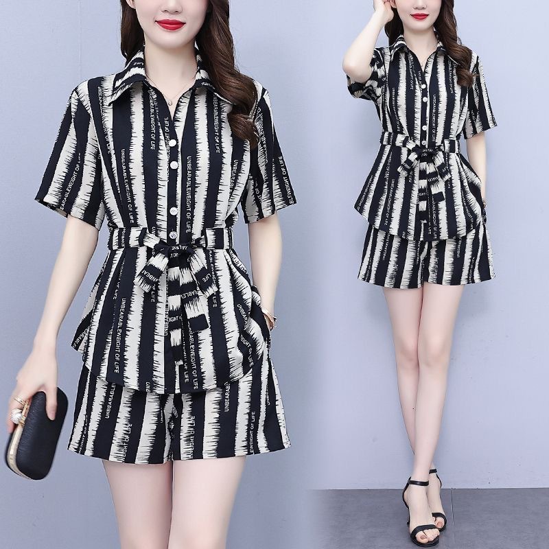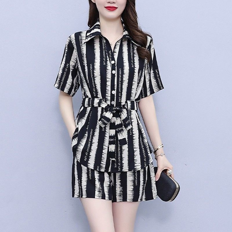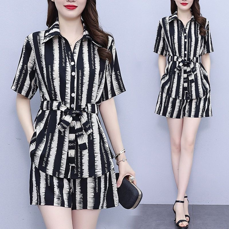 Комплект из рубашки и шорт больших размеров для женщин, стильный летний наряд в полоску для мам, модный и уменьшающий возраст комплект из двух предметов для женщин.