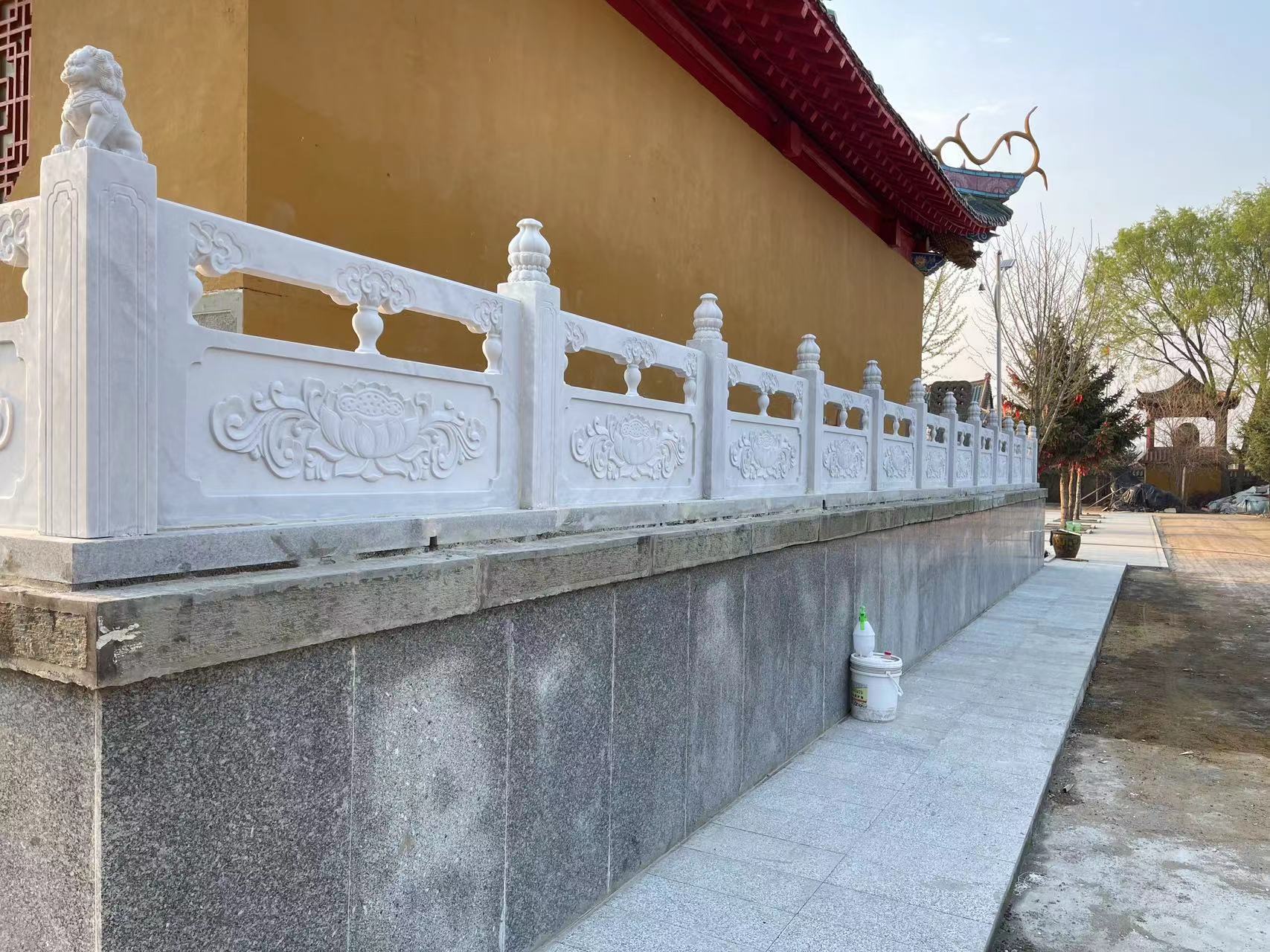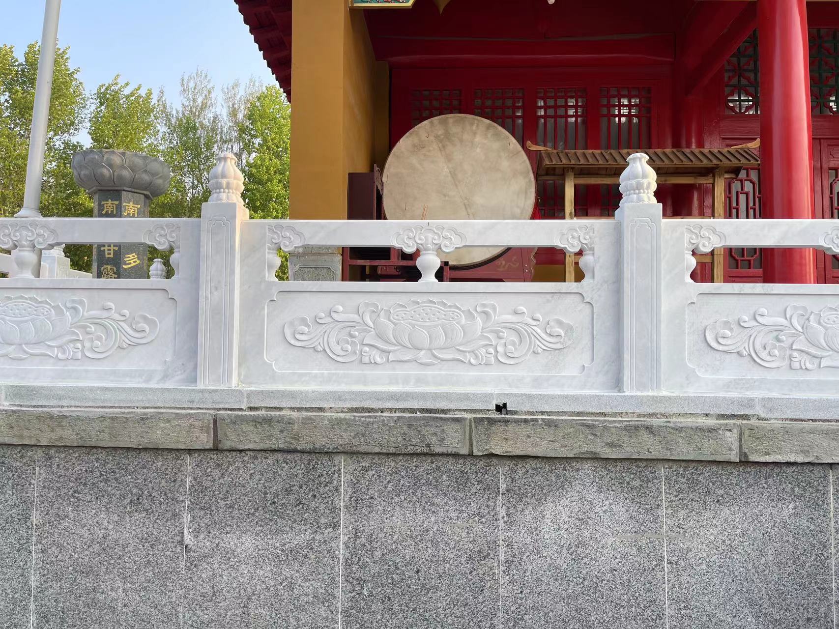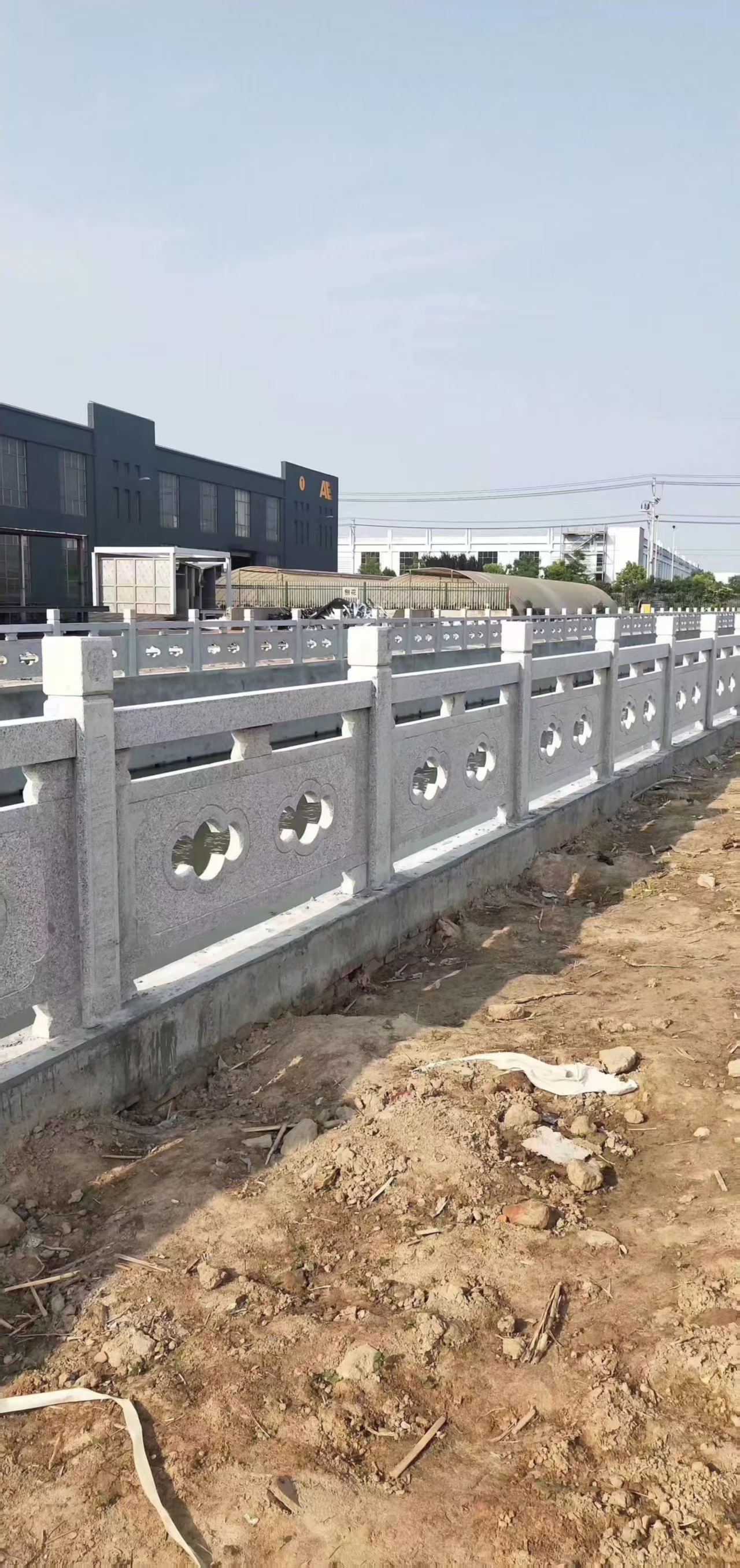 Белые мраморные перила, флагшток, сизо-серые ограждения, перила из речного камня.