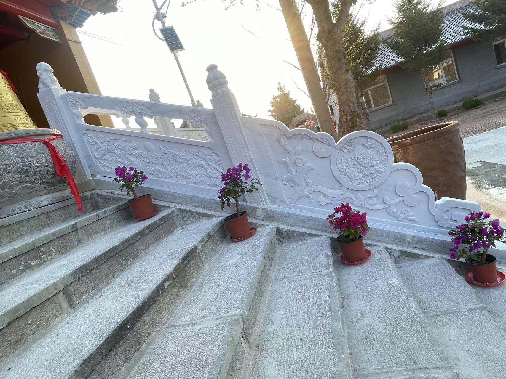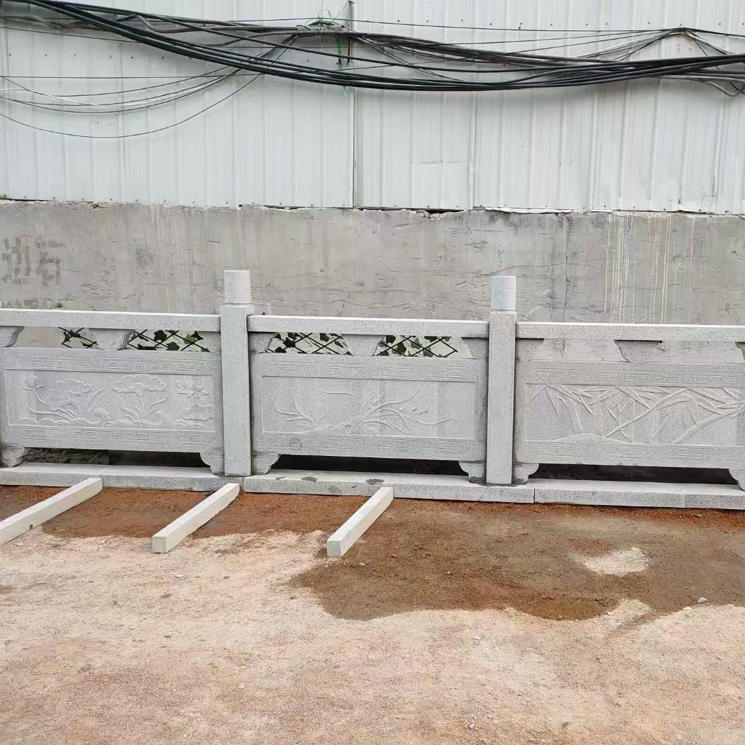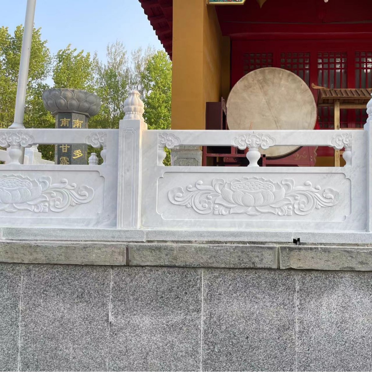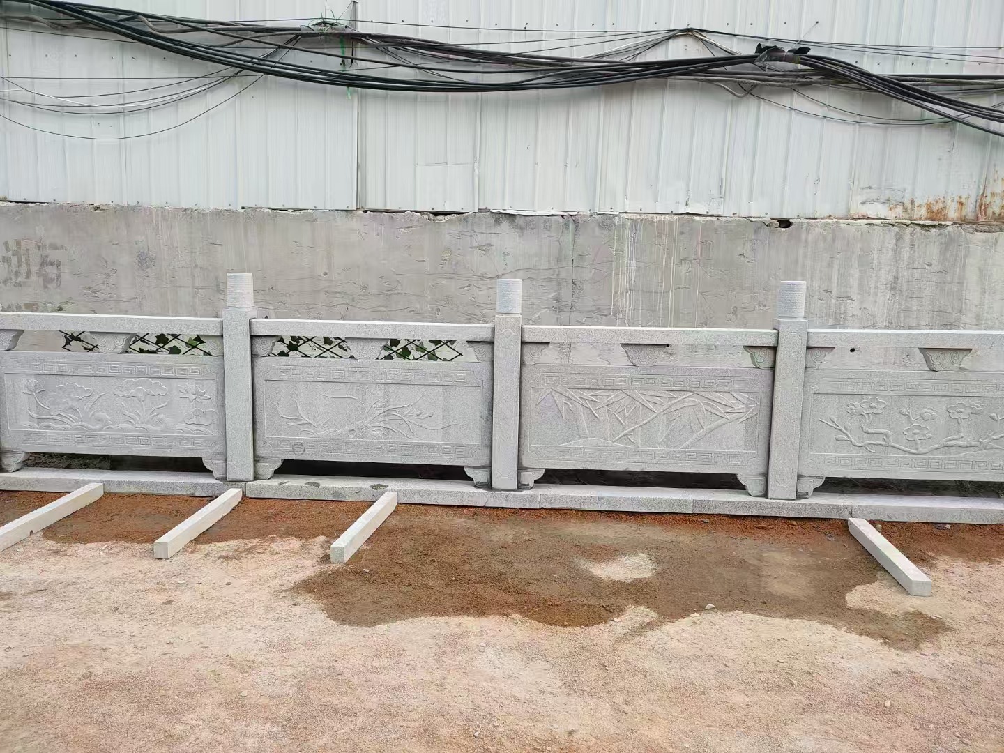 Белые мраморные перила, флагшток, сизо-серые ограждения, перила из речного камня.