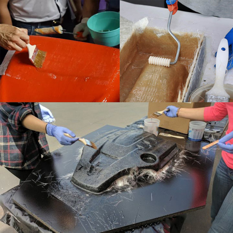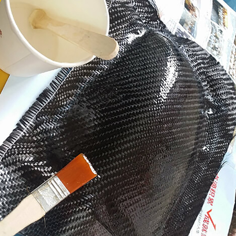 树脂按比例100:27 (重量比)搅拌充分混合后,可以加色粉调色,一般可以直接把纤维布铺在工作面,然后直接刷涂抹树脂,也可体验涂两层,先在要操作的表面刷一层树脂,然后敷上纤维布,之后再刷一层混合好的树脂,最后等固化就即可,固化后有毛边什么的可以自己再修整打磨下