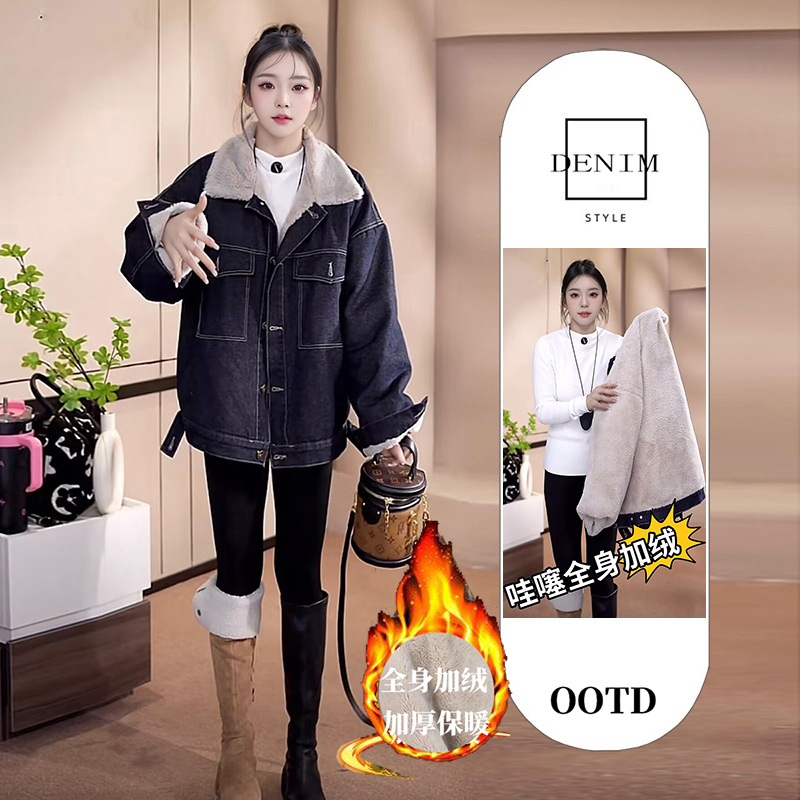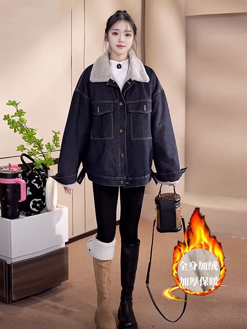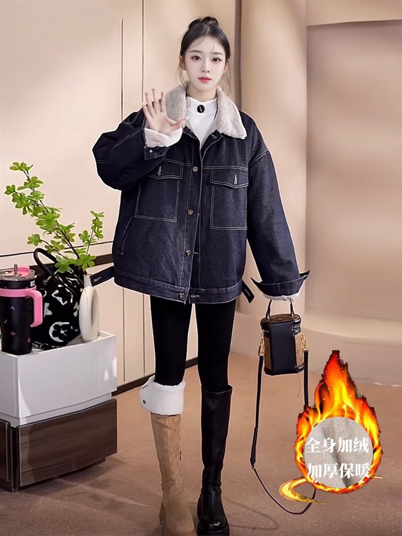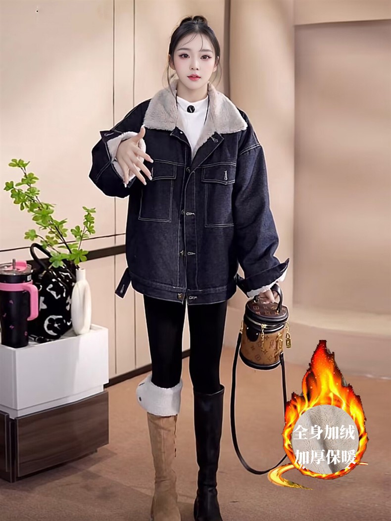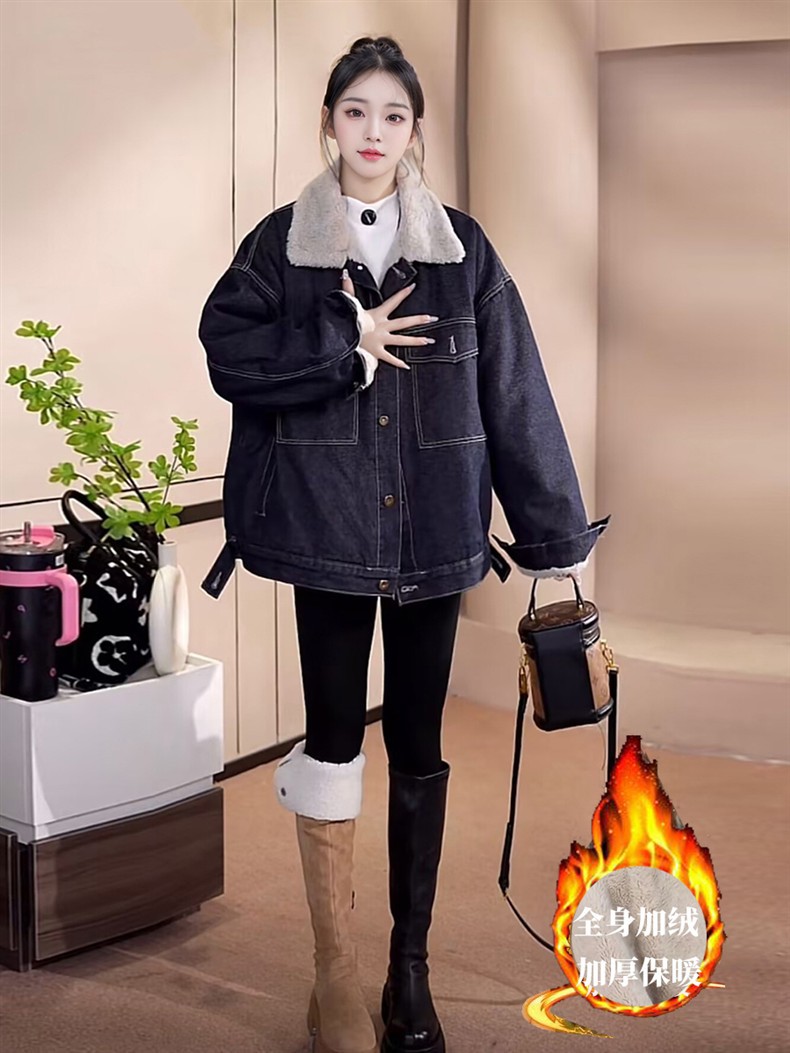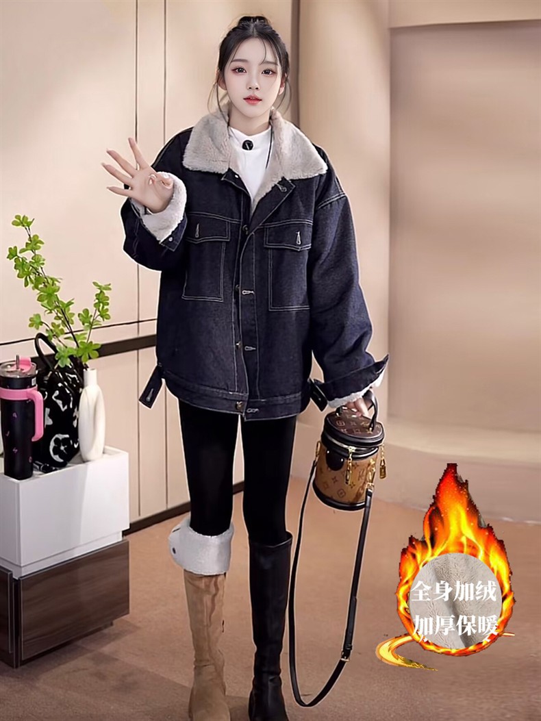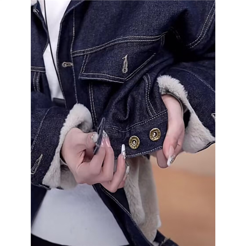 Джинсовая куртка на флисовой подкладке с меховым воротником для женщин, зимняя американская ретро миниатюрная универсальная толстая теплая куртка-парка, топ