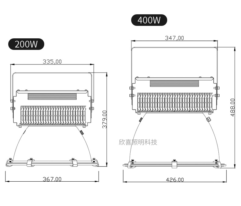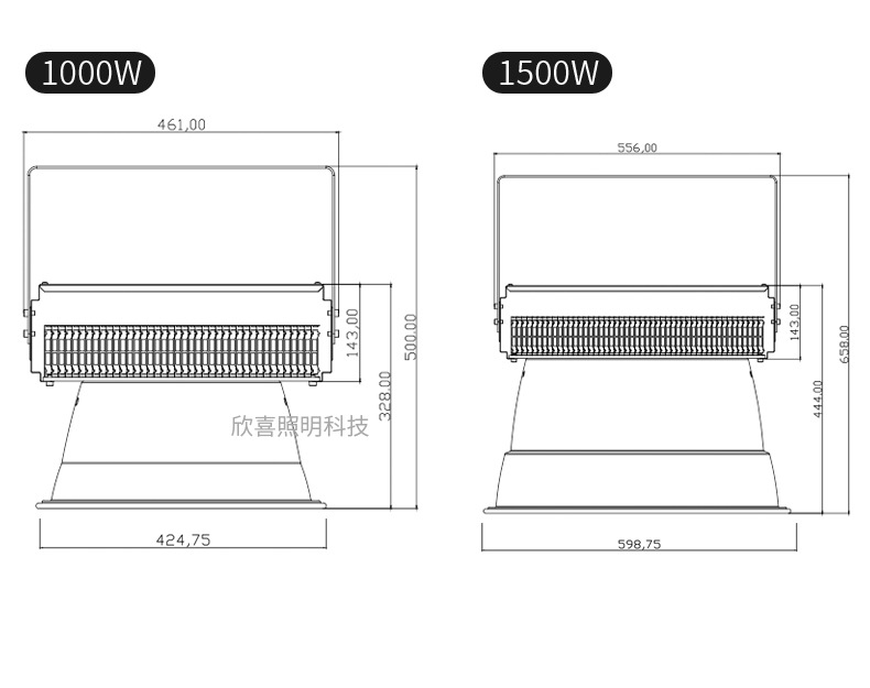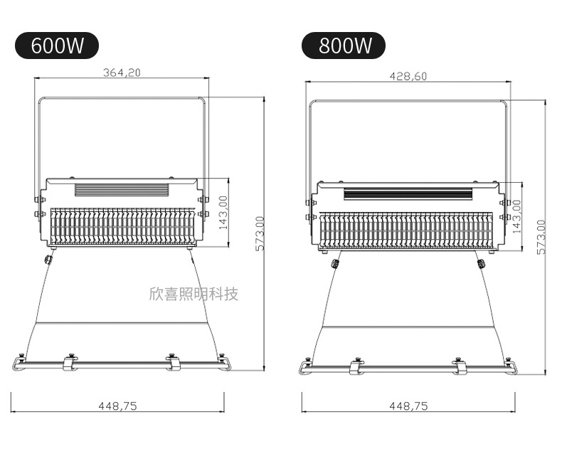 400 Вт 365*В210 мм; 600 Вт 425*В260 мм; 800 Вт 445*В300 мм; 1000 Вт 445*В310 мм; 1500Вт 500*В400мм; 2000Вт 600*В460мм