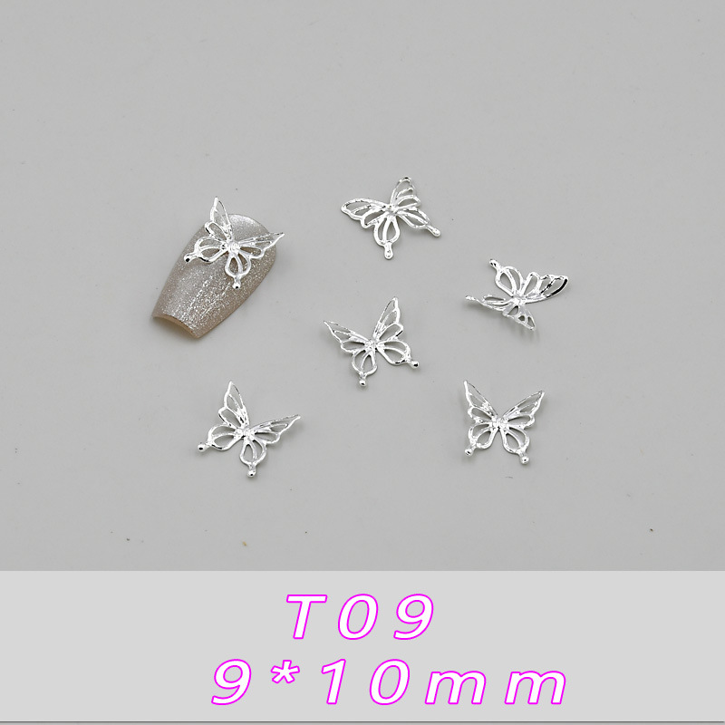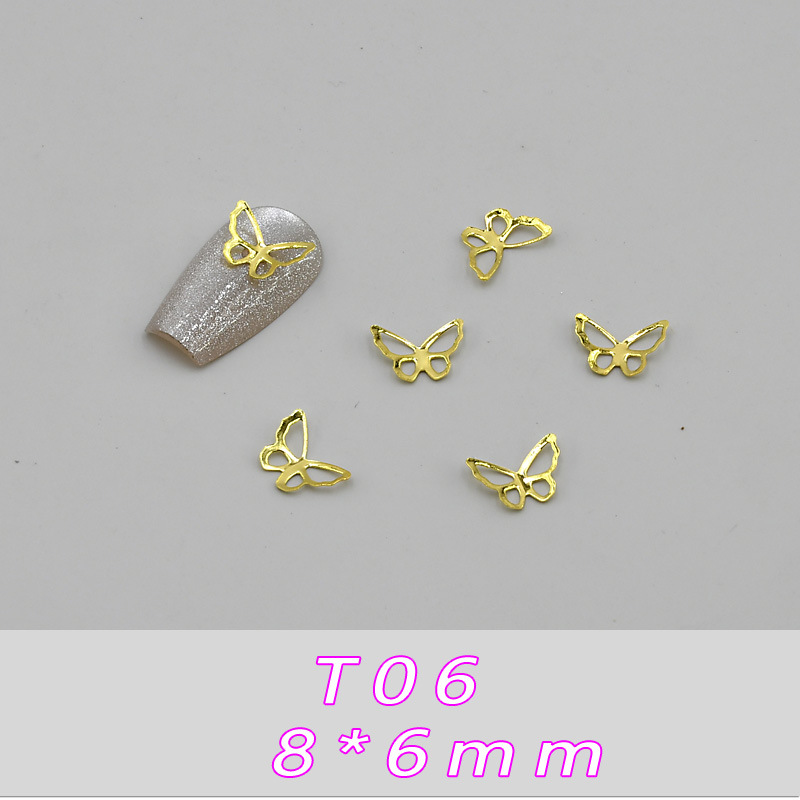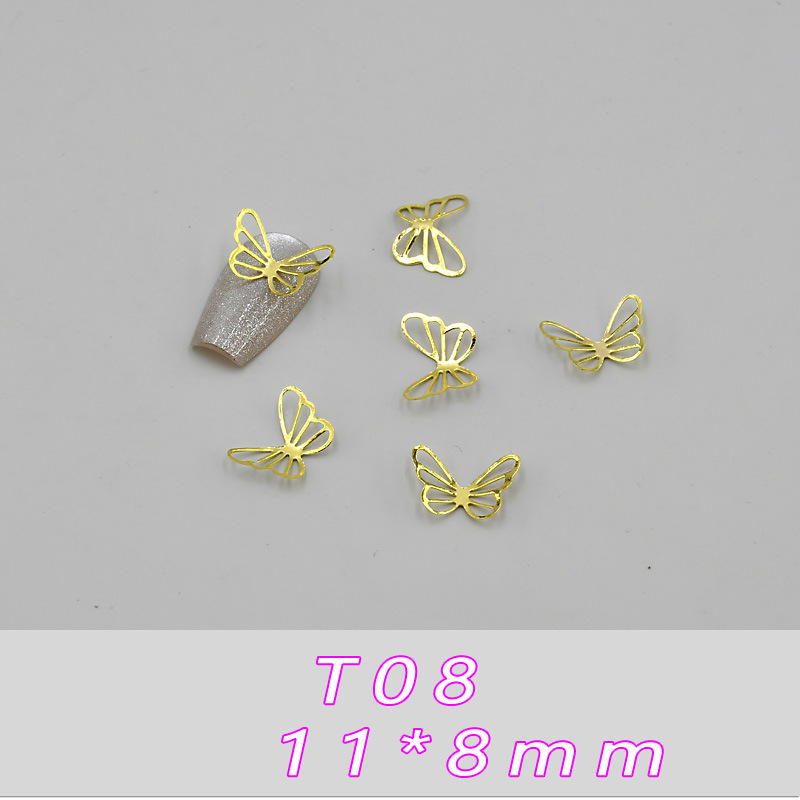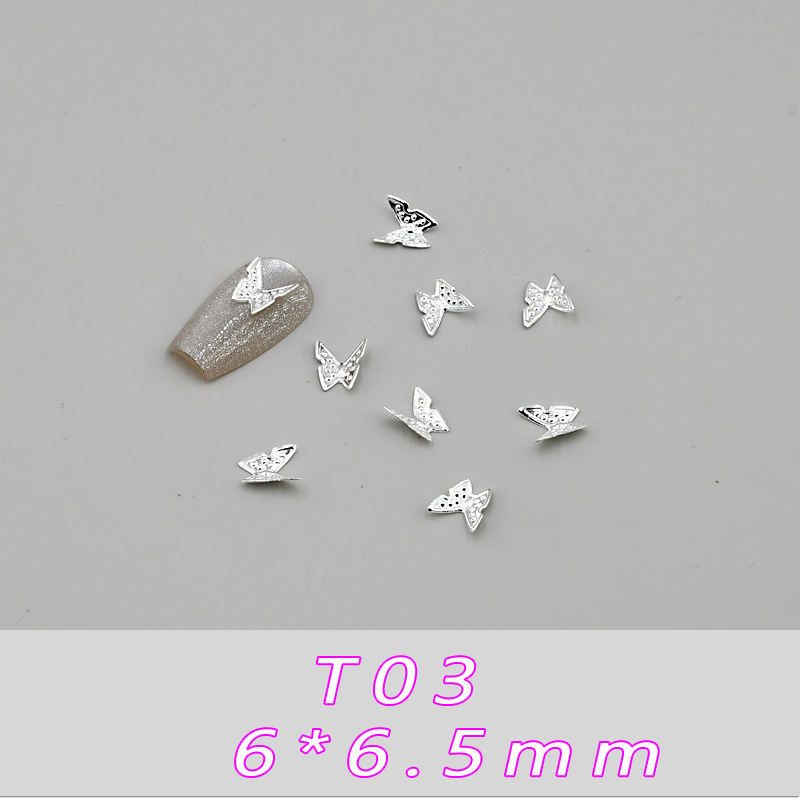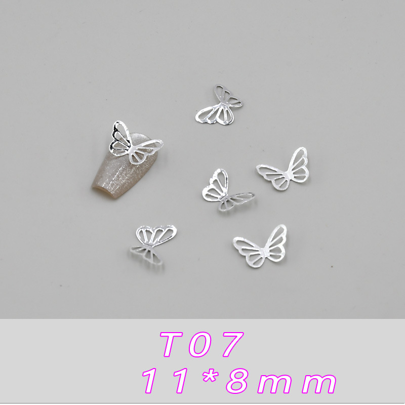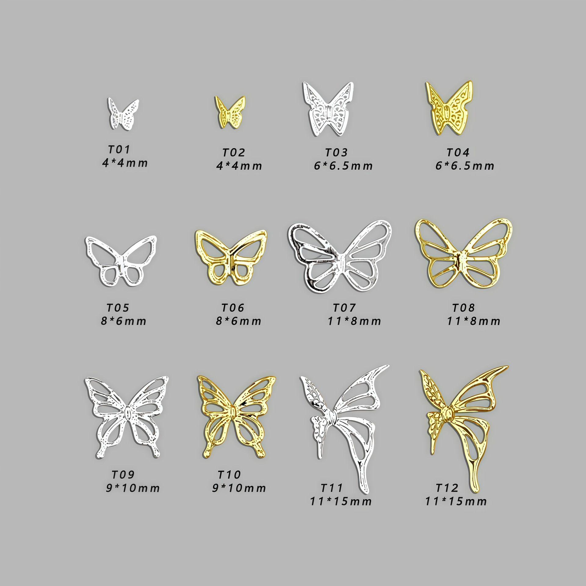 T01--(4*4 мм) металлическая бабочка; T02--(4*4 мм) металлическая бабочка; T03--(6*6,5 мм) металлическая бабочка; T04--(6*6,5 мм) металлическая бабочка; T05--(8*6 мм) металлическая бабочка; T06--(8*6 мм) металлическая бабочка; T07--(11*8мм) металлическая бабочка; T08--(11*8 мм) металлическая бабочка; T09--(9*10мм) металлическая бабочка; T10--(9*10 мм) металлическая бабочка; T11--(11*15 мм) металлическая бабочка; T12--(11*15 мм) металлическая бабочка