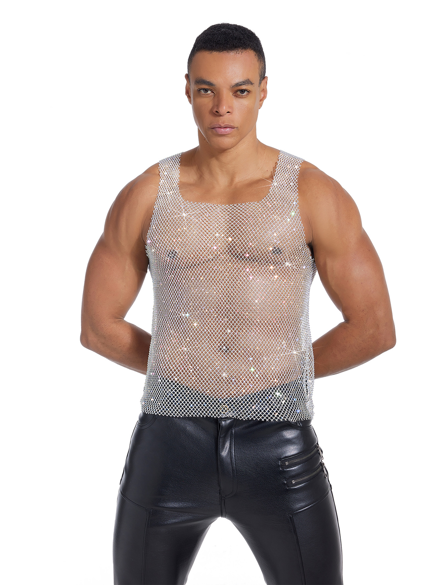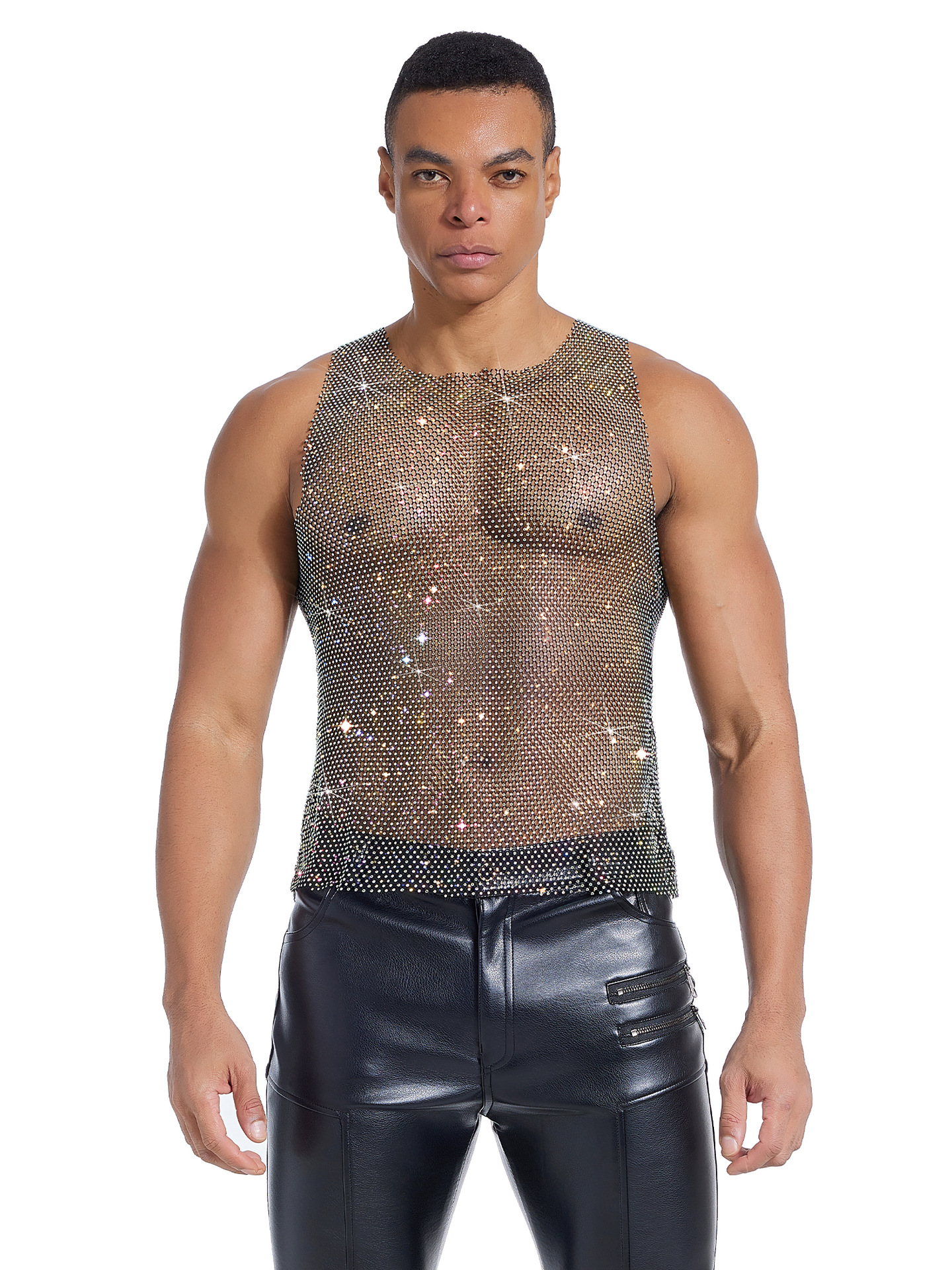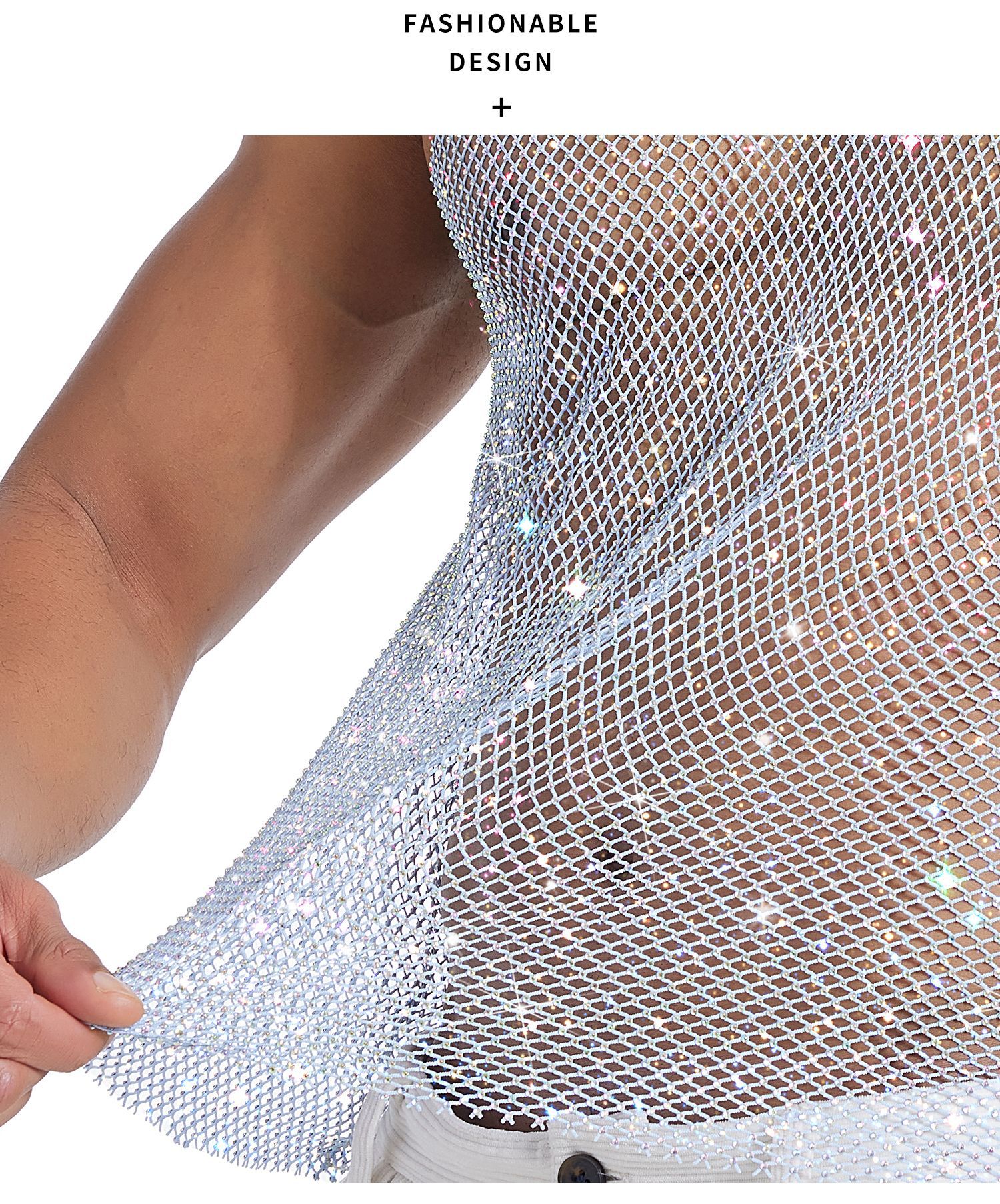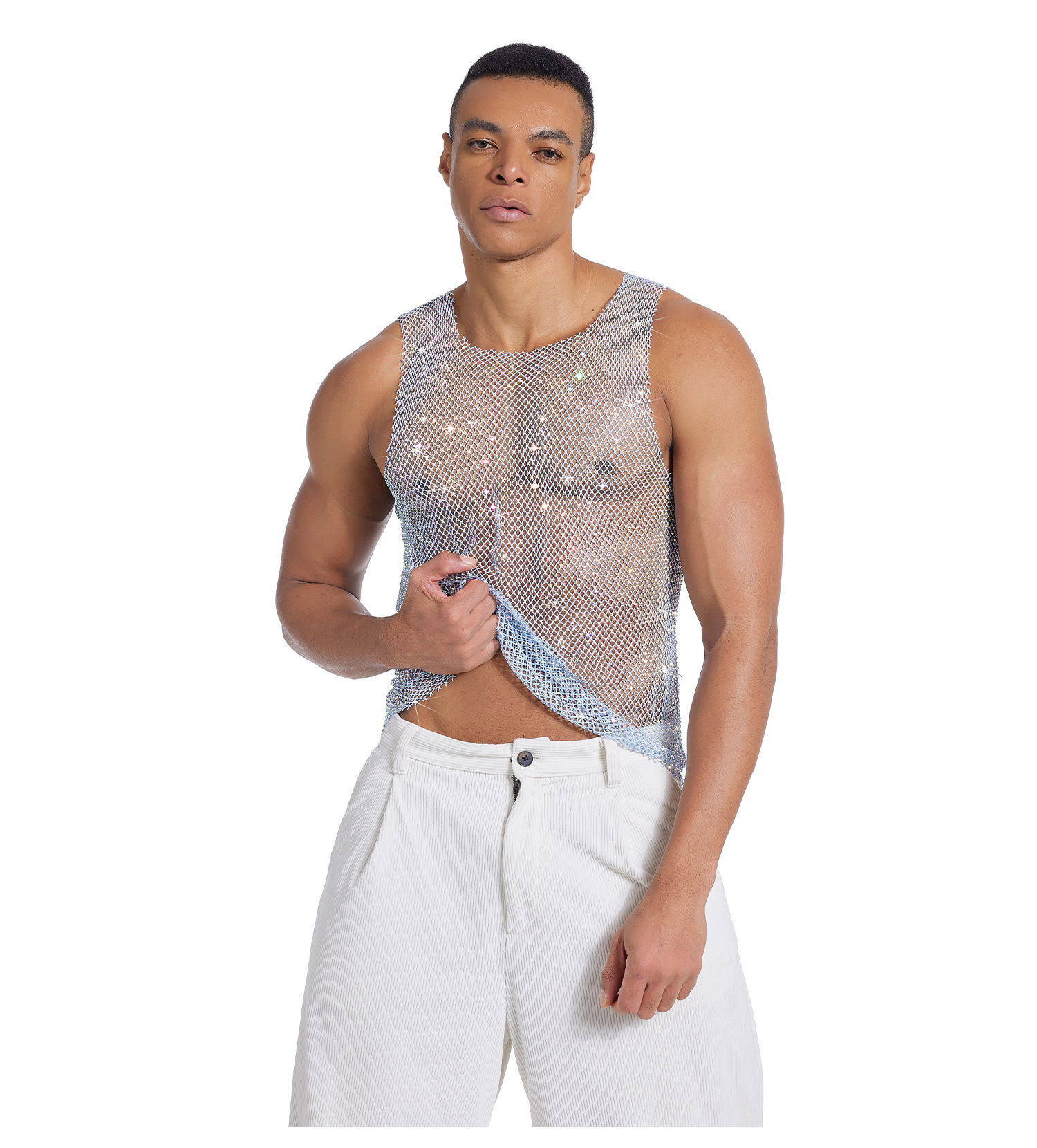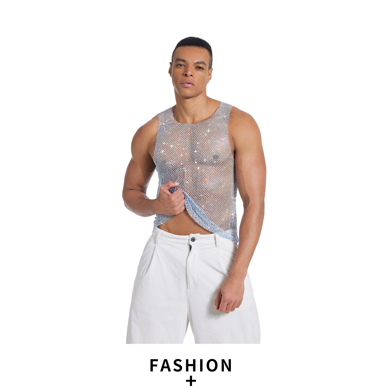 Amazon Европейская и американская мода, мужская сетка со стразами, сексуальный ажурный прозрачный жилет для вечеринки, ночного клуба, топ с бриллиантами CC