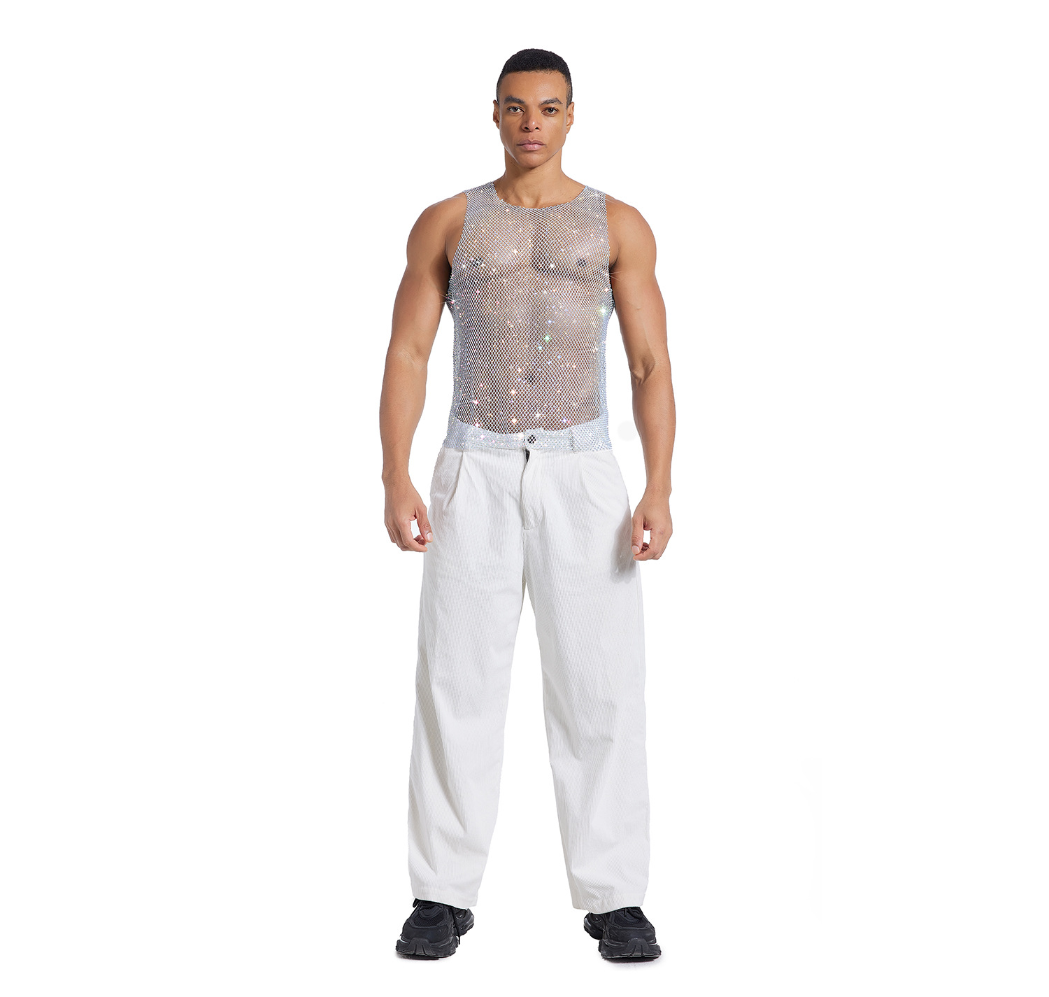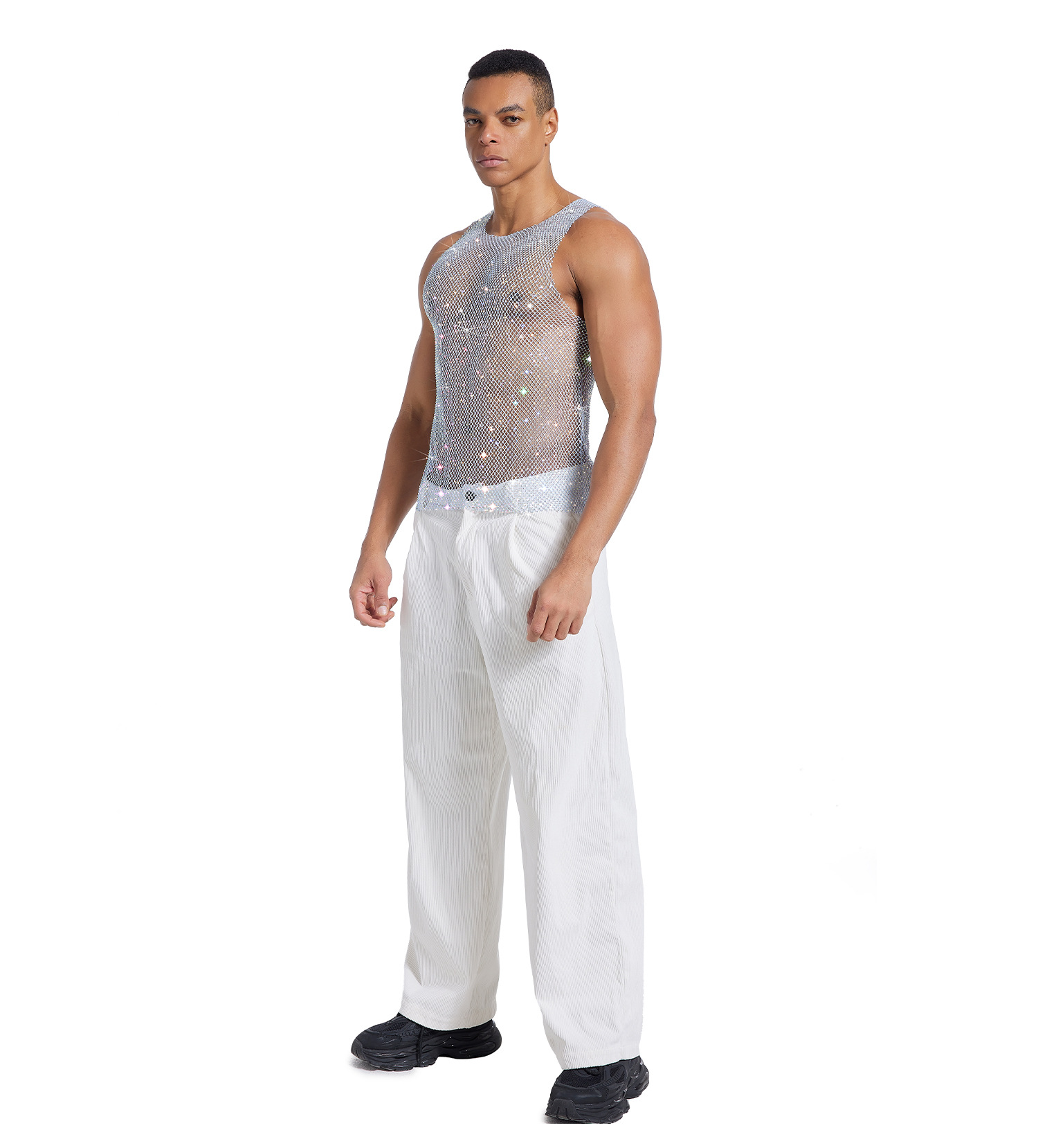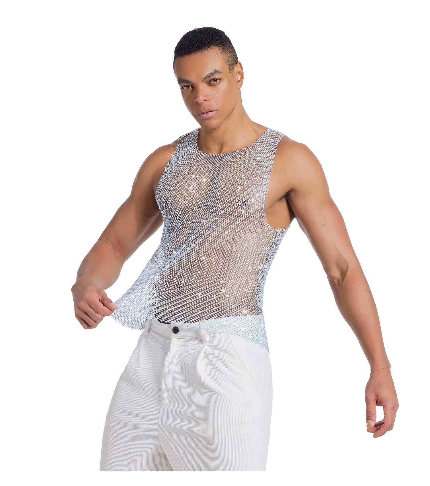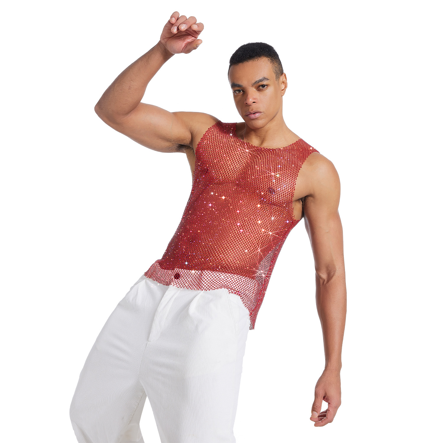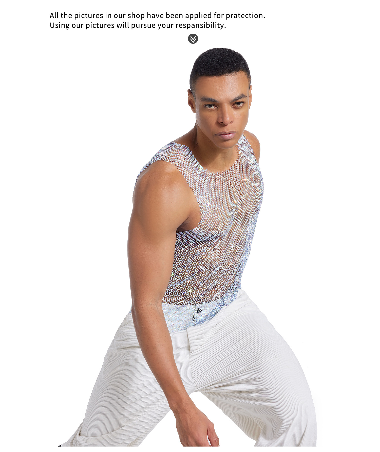 Amazon Европейская и американская мода, мужская сетка со стразами, сексуальный ажурный прозрачный жилет для вечеринки, ночного клуба, топ с бриллиантами CC