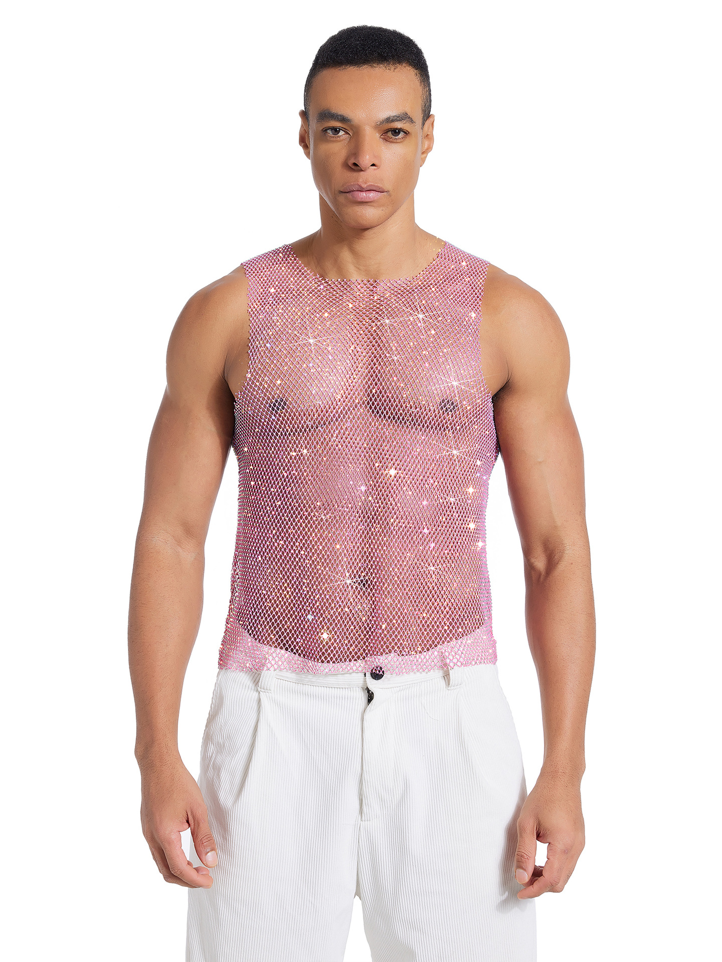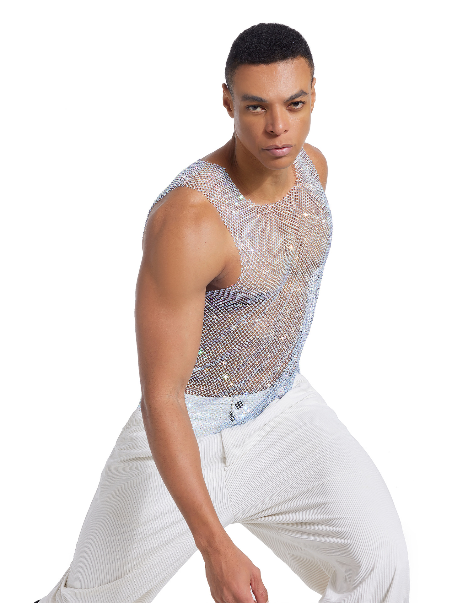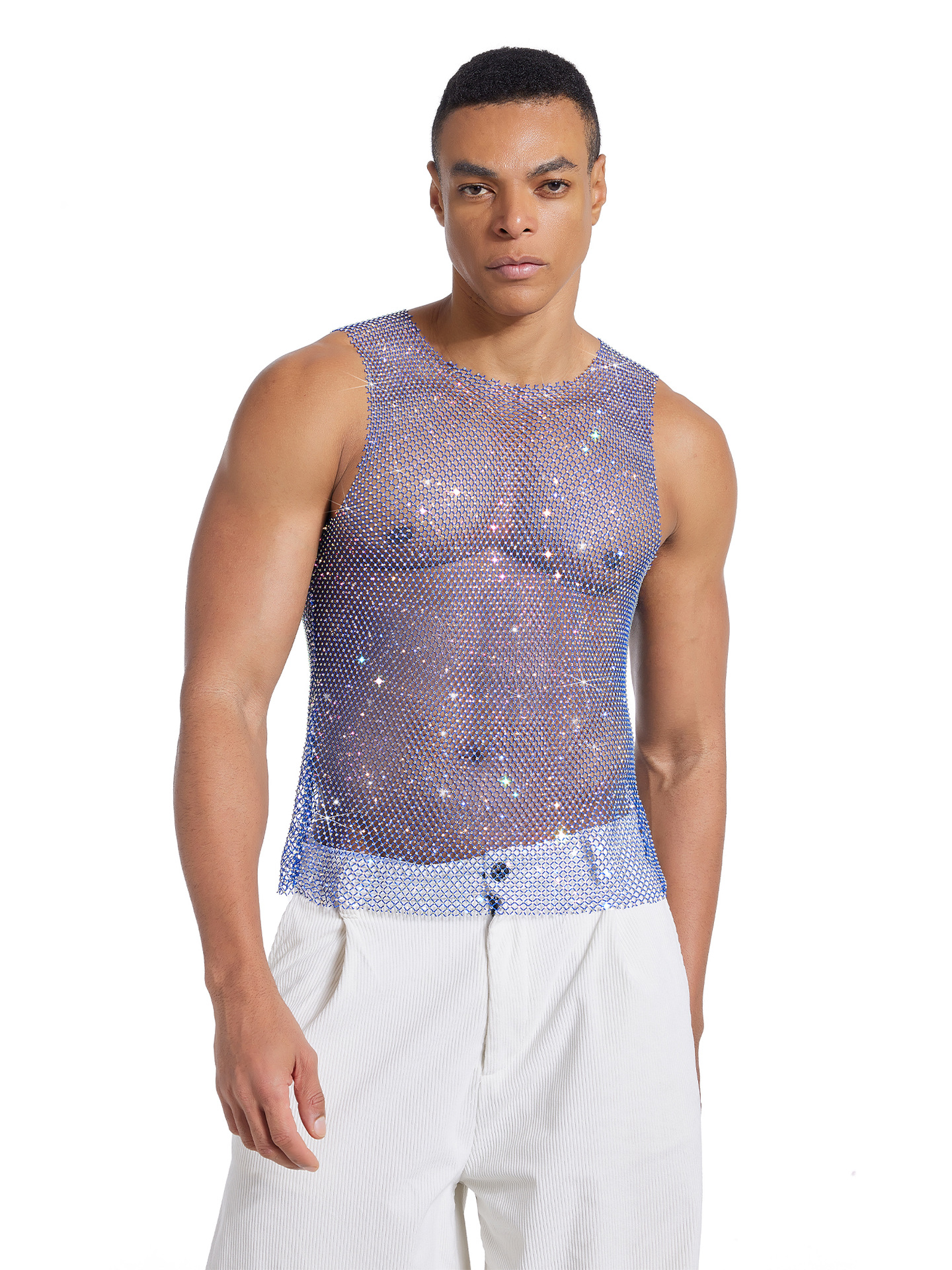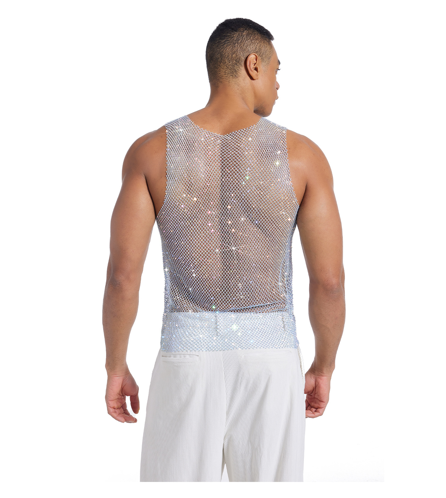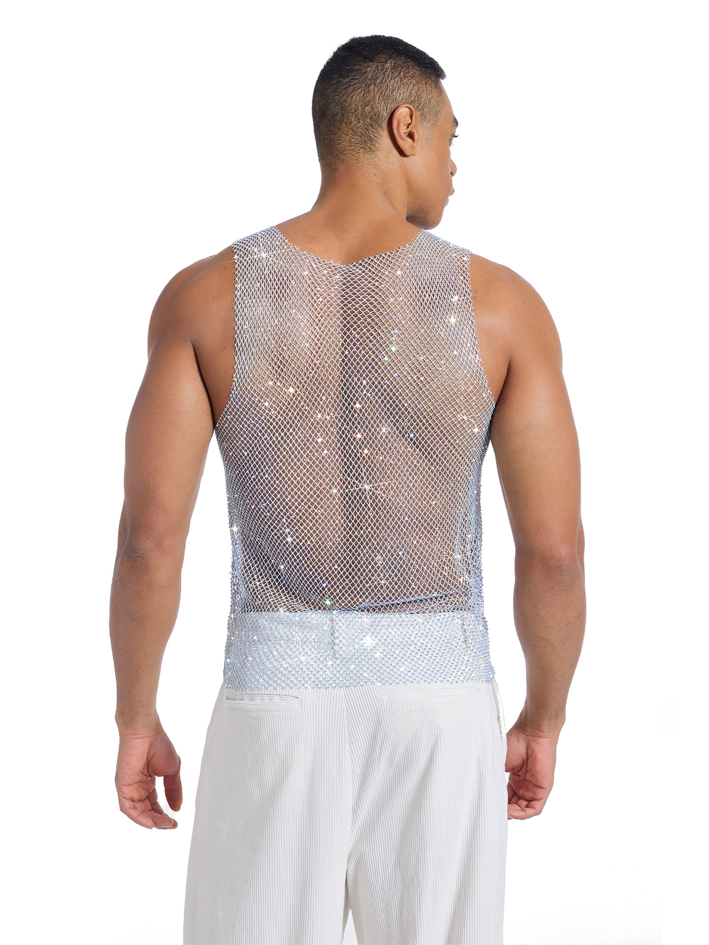 Amazon Европейская и американская мода, мужская сетка со стразами, сексуальный ажурный прозрачный жилет для вечеринки, ночного клуба, топ с бриллиантами CC