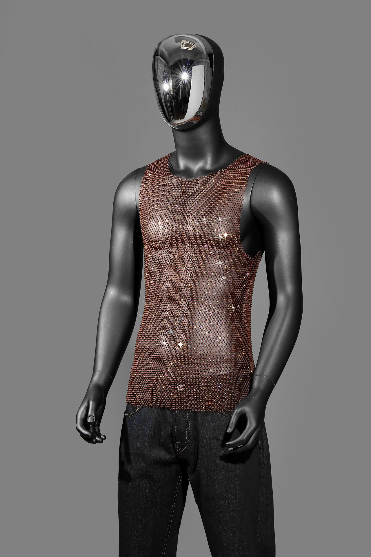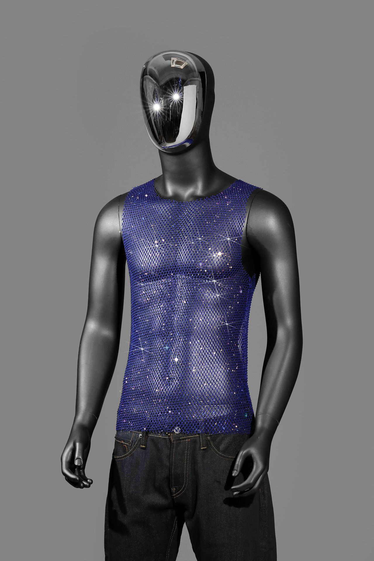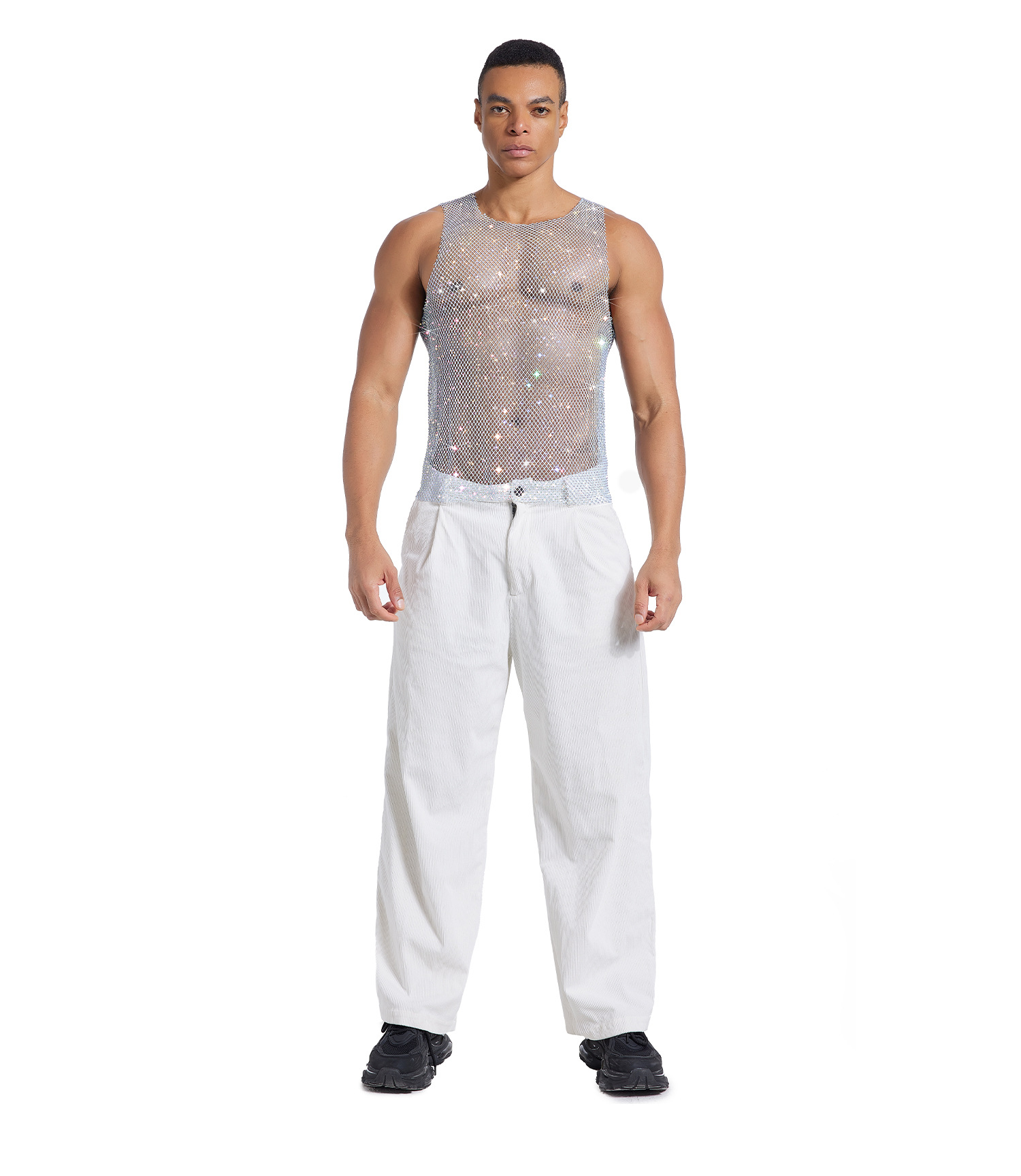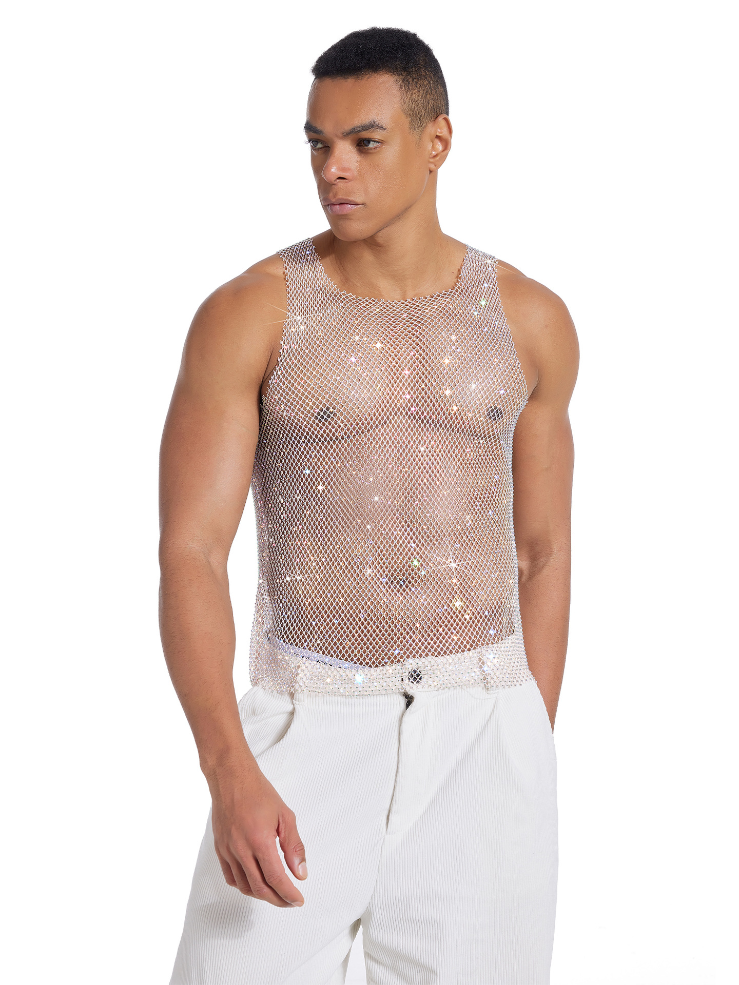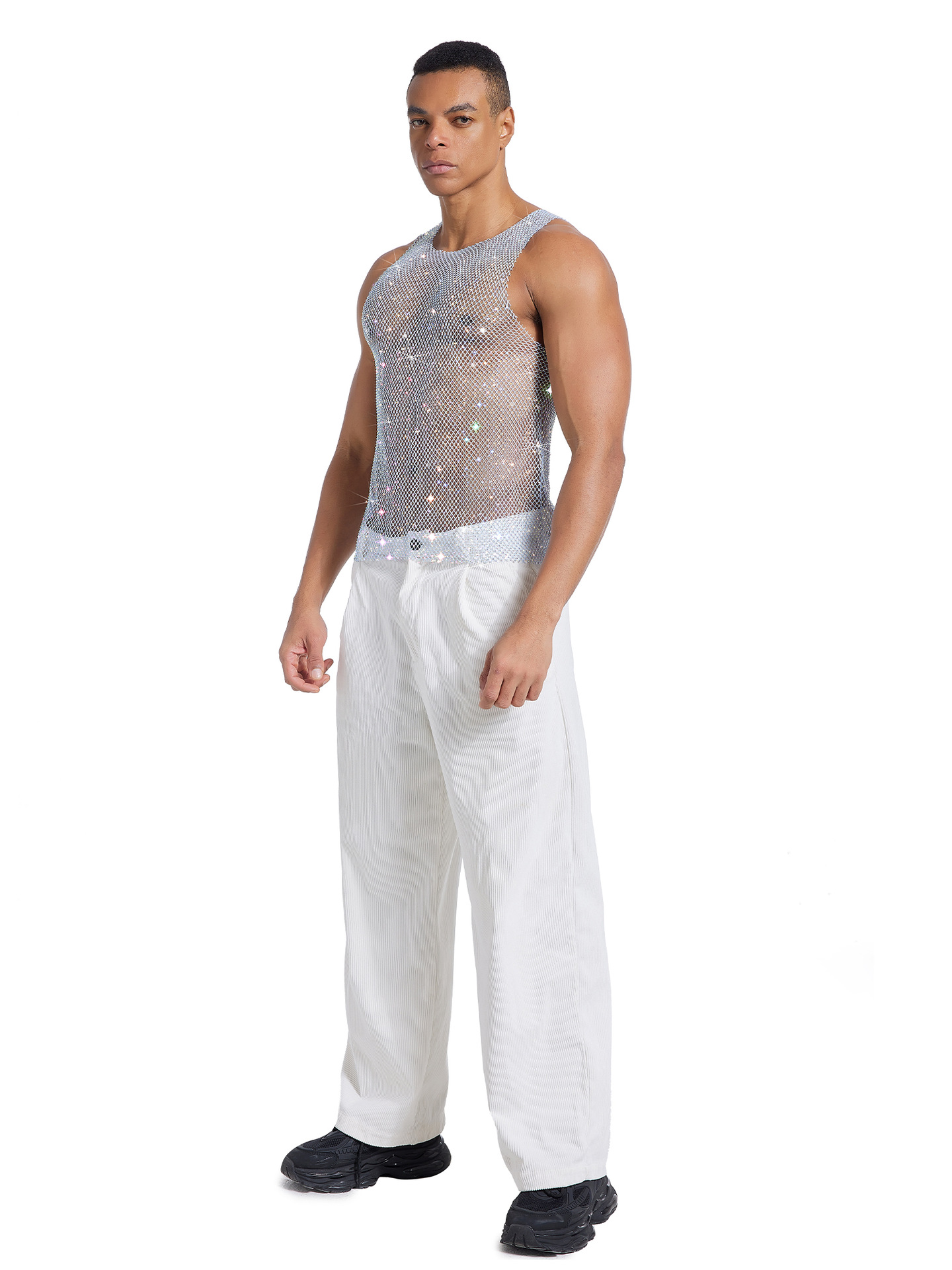 Amazon Европейская и американская мода, мужская сетка со стразами, сексуальный ажурный прозрачный жилет для вечеринки, ночного клуба, топ с бриллиантами CC