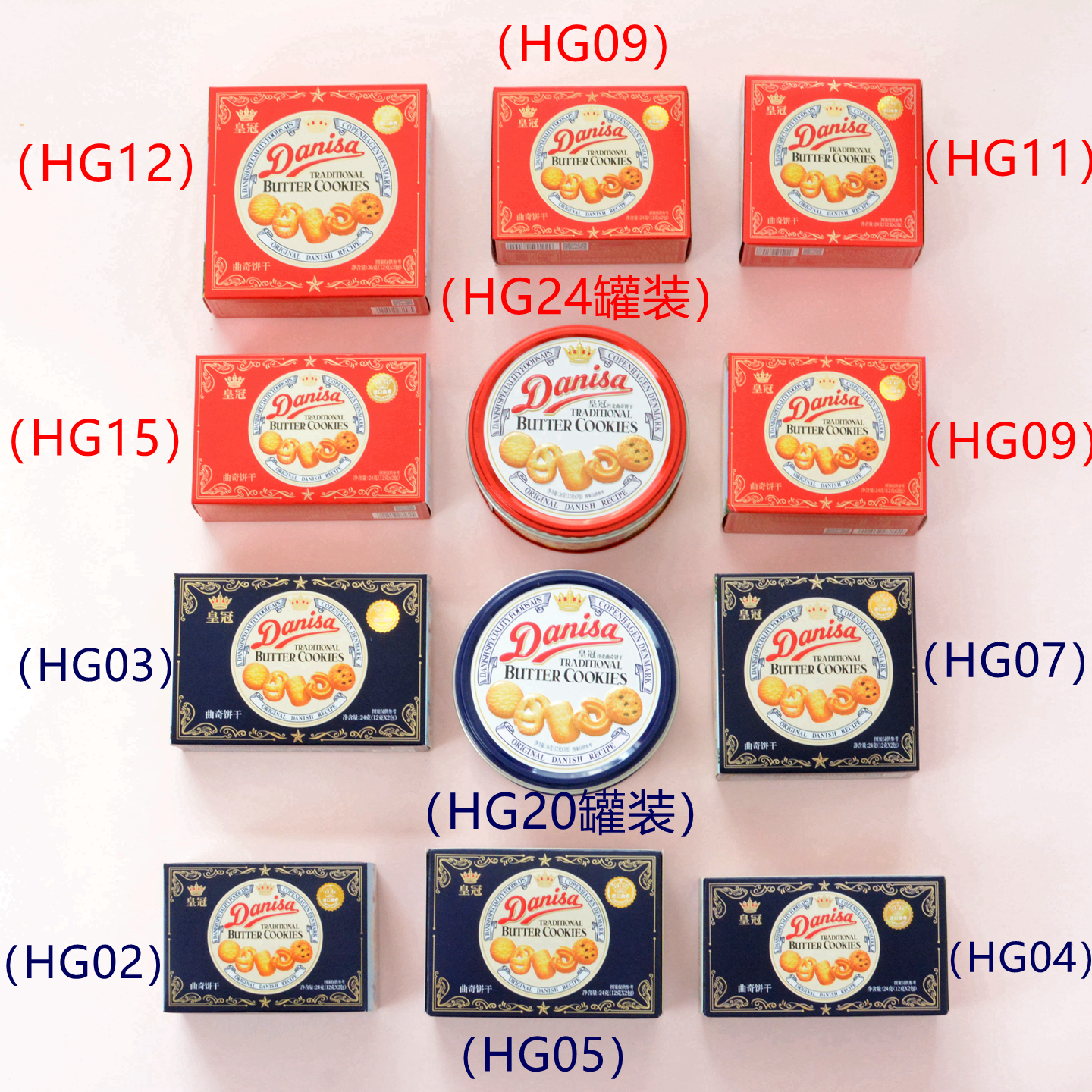 HG02 Crown Blue 24г (толстая прямоугольная коробка); HG03 Crown Blue 24г (плоская длинная коробка); HG04 Crown Blue 24 г (тонкая длинная коробка); HG11 Crown Red 24г (квадратная коробка); HG15 Crown Red 24г (прямоугольная коробка); HG20 Корона печенья 36 г (маленькая синяя круглая железная банка); HG24 Королевские печенья 36 г (красная маленькая круглая железная банка)