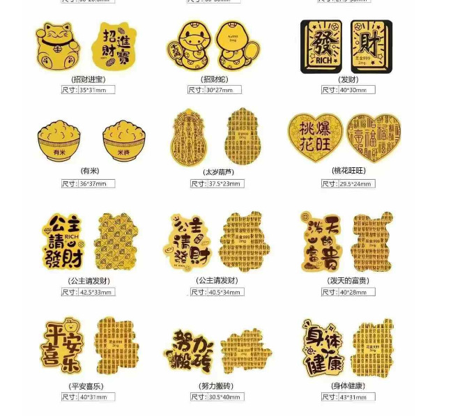 великий сокровищница; Шун【Большой】; Начало【Большое】; Время приходит и меняется [большое]; Время приходит и меняется; Привлекайте богатство; счастливая змея; заработать состояние; Есть рис; Тай Суй Гурд; персиковый цвет; Принцесса, пожалуйста, заработай состояние; Принцесса, пожалуйста, заработай состояние 2; Потрясающее богатство; Мир и радость; Усердно работайте, чтобы переместить кирпичи; хорошее здоровье; Дом сокровищ; гладкий; начать; Наклейки на мобильные телефоны по индивидуальному заказу